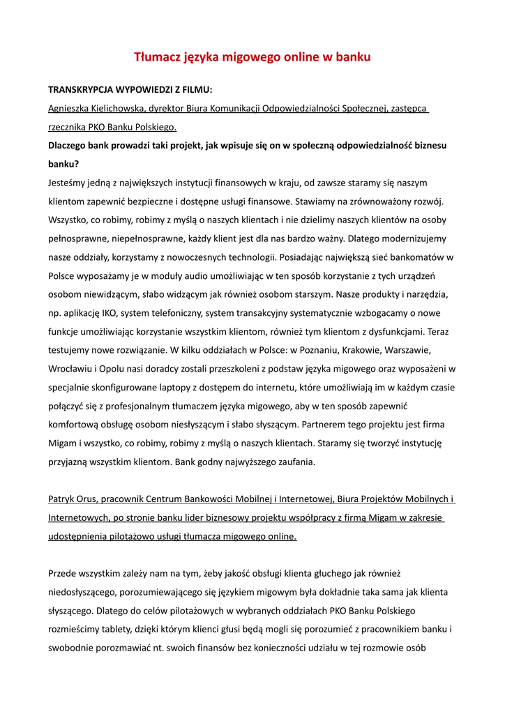 Tłumacz języka migowego online w banku TRANSKRYPCJA WYPOWIEDZI Z FILMU: Agnieszka Kielichowska, dyrektor Biura Komunikacji Odpowiedzialności Społecznej, zastępca rzecznika PKO Banku Polskiego. Dlaczego bank prowadzi taki projekt, jak wpisuje się on w społeczną odpowiedzialność biznesu banku? Jesteśmy jedną z największych instytucji finansowych w kraju, od zawsze staramy się naszym klientom zapewnić bezpieczne i dostępne usługi finansowe. Stawiamy na zrównoważony rozwój. Wszystko, co robimy, robimy z myślą o naszych klientach i nie dzielimy naszych klientów na osoby pełnosprawne, niepełnosprawne, każdy klient jest dla nas bardzo ważny. Dlatego modernizujemy nasze oddziały, korzystamy z nowoczesnych technologii. Posiadając największą sieć bankomatów w Polsce wyposażamy je w moduły audio umożliwiając w ten sposób korzystanie z tych urządzeń osobom niewidzącym, słabo widzącym jak również osobom starszym. Nasze produkty i narzędzia, np. aplikację IKO, system telefoniczny, system transakcyjny systematycznie wzbogacamy o nowe funkcje umożliwiając korzystanie wszystkim klientom, również tym klientom z dysfunkcjami. Teraz testujemy nowe rozwiązanie. W kilku oddziałach w Polsce: w Poznaniu, Krakowie, Warszawie, Wrocławiu i Opolu nasi doradcy zostali przeszkoleni z podstaw języka migowego oraz wyposażeni w specjalnie skonfigurowane laptopy z dostępem do internetu, które umożliwiają im w każdym czasie połączyć się z profesjonalnym tłumaczem języka migowego, aby w ten sposób zapewnić komfortową obsługę osobom niesłyszącym i słabo słyszącym. Partnerem tego projektu jest firma Migam i wszystko, co robimy, robimy z myślą o naszych klientach. Staramy się tworzyć instytucję przyjazną wszystkim klientom. Bank godny najwyższego zaufania. Patryk Orus, pracownik Centrum Bankowości Mobilnej i Internetowej, Biura Projektów Mobilnych i Internetowych, po stronie banku lider biznesowy projektu współpracy z firmą Migam w zakresie udostępnienia pilotażowo usługi tłumacza migowego online. Przede wszystkim zależy nam na tym, żeby jakość obsługi klienta głuchego jak również niedosłyszącego, porozumiewającego się językiem migowym była dokładnie taka sama jak klienta słyszącego. Dlatego do celów pilotażowych w wybranych oddziałach PKO Banku Polskiego rozmieścimy tablety, dzięki którym klienci głusi będą mogli się porozumieć z pracownikiem banku i swobodnie porozmawiać nt. swoich finansów bez konieczności udziału w tej rozmowie osób znających język migowy takich jak tłumacze czy słyszący członkowie rodziny. Jak wiele osób zostanie przeszkolonych? Na chwilę obecną szkolimy osoby z siedmiu oddziałów pilotażowych. Z każdego oddziału pilotażowego jest wskazanych kilka osób, które będą pełniły rolę ambasadorów tego pilotażu. W jakim stopniu opanują oni język migowy? Jeśli chodzi o naukę języka migowego będzie to stopień podstawowy. Tak naprawdę celem pilotażu jest wykorzystanie tłumacza migowego języka online. Sama nauka języka migowego polega na nauczeniu się podstawowych zwrotów w języku migowym, chociażby „dzień dobry”, „do widzenia”, „proszę chwilę poczekać”, „zapraszamy” itp. W ilu oddziałach będzie to możliwe, w jaki sposób wybrano te oddziały? Będzie to 7 oddziałów pilotażowych. Jest to grupa oddziałów, w których mamy dosyć sporą grupę osób głuchych i słabo słyszących wg badania, które przeprowadziliśmy przed uruchomieniem pilotażu. Startujemy 9 maja już w tym roku z nową usługą pilotażową. Każdy z oddziałów będzie oczywiście odpowiednio oznaczony z informacją, że obsługujemy klientów w języku migowym. Również planujemy małą kampanię w środowisku osób głuchych, która zachęci klientów posługujących się językiem migowym do odwiedzenia oddziałów PKO Banku Polskiego. Czy po zakończeniu tego pilotażu będzie również wdrożona ta usługa we wszystkich oddziałach? Po pilotażu planujemy dokonać rewizji całego przedsięwzięcia, sprawdzenia, jak funkcjonowało dokładnie w oddziałach, przeprowadzić badanie, które pozwoli nam jeszcze dokładniej zbadać potrzeby osób głuchych w tym zakresie i rozszerzyć na większą skalę pilotaż bądź wdrożyć masowo w całej sieci sprzedaży oraz w innych kanałach komunikacji klienta z bankiem. Jeśli chodzi o sam proces obsługi osoby głuchej, niedosłyszącej posługującej się językiem migowym będzie on bardzo prosty. Przede wszystkim osoba odwiedzająca taki oddział wystarczy, że wejdzie do oddziału i standardowo podejdzie do stanowiska bankowego. Wystarczy, że pokaże gestem, że nie słyszy, pracownik banku posłuży się podstawowymi zwrotami w języku migowym, chociażby „dzień dobry” bądź też „proszę chwilę zaczekać” i połączy klienta przy stanowisku bankowym z tłumaczem języka migowego online. Tablet będzie dostępny na biurku doradcy ustawiony w kierunku osoby głuchej, dzięki czemu komunikacja trójstronna będzie odbywała się płynnie. Po samym zakończeniu tłumaczenia klient zostanie poproszony o wypełnienie bardzo krótkiej ankiety, która przede wszystkim pozwoli nam na zbadanie jakości tej obsługi, jakości obsługi klienta głuchego i słabo słyszącego, co równocześnie pozwoli nam na doskonalenie obsługi w dalszych etapach pilotażu. Sławek Łuczywek, firma Migam W życiu codziennym największa barierą dla osoby głuchej stanowi kontakt telefoniczny. Bo tak naprawdę żyjemy w kulturze bardzo telefonicznej, najłatwiej, najszybciej załatwiać sprawy przez telefon. Osoba głucha nie może tego robić. Np. przy spotkaniu w urzędzie czy w banku, tutaj też jest oczywiście bariera językowa, bo język polski, język migowy są zupełnie różne. Też w wersji pisemnej. To są dwa różne światy, te języki się różnią gramatycznie, składniowo, więc jest problem z dogadaniem 