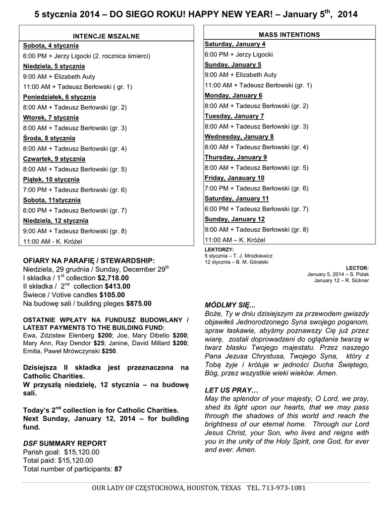 5 stycznia 2014 – DO SIEGO ROKU! HAPPY NEW YEAR! – January 5th, 2014 INTENCJE MSZALNE Sobota, 4 stycznia MASS INTENTIONS Saturday, January 4 6:00 PM + Jerzy Ligocki (2. rocznica śmierci) 6:00 PM + Jerzy Ligocki Niedziela, 5 stycznia Sunday, January 5 9:00 AM + Elizabeth Auty 9:00 AM + Elizabeth Auty 11:00 AM + Tadeusz Berłowski ( gr. 1) 11:00 AM + Tadeusz Berłowski (gr. 1) Poniedziałek, 6 stycznia Monday, January 6 8:00 AM + Tadeusz Berłowski (gr. 2) 8:00 AM + Tadeusz Berłowski (gr. 2) Wtorek, 7 stycznia Tuesday, January 7 8:00 AM + Tadeusz Berłowski (gr. 3) 8:00 AM + Tadeusz Berłowski (gr. 3) Środa, 8 stycznia Wednesday, January 8 8:00 AM + Tadeusz Berłowski (gr. 4) 8:00 AM + Tadeusz Berłowski (gr. 4) Czwartek, 9 stycznia Thursday, January 9 8:00 AM + Tadeusz Berłowski (gr. 5) 8:00 AM + Tadeusz Berłowski (gr. 5) Piątek, 10 stycznia Friday, Janauary 10 7:00 PM + Tadeusz Berłowski (gr. 6) 7:00 PM + Tadeusz Berłowski (gr. 6) Sobota, 11stycznia Saturday, January 11 6:00 PM + Tadeusz Berłowski (gr. 7) 6:00 PM + Tadeusz Berłowski (gr. 7) Niedziela, 12 stycznia Sunday, January 12 9:00 AM + Tadeusz Berłowski (gr. 8) 9:00 AM + Tadeusz Berłowski (gr. 8) 11:00 AM - K. Króżel 11:00 AM – K. Króżel OFIARY NA PARAFIĘ / STEWARDSHIP: Niedziela, 29 grudnia / Sunday, December 29th I składka / 1st collection $2,718.00 II składka / 2nd collection $413.00 Świece / Votive candles $105.00 Na budowę sali / building pleges $875.00 OSTATNIE WPŁATY NA FUNDUSZ BUDOWLANY / LATEST PAYMENTS TO THE BUILDING FUND: Ewa, Zdzisław Elenberg $200; Joe, Mary Dibello $200; Mary Ann, Ray Dendor $25; Janine, David Millard $200; Emilia, Paweł Mrówczynski $250. Dzisiejsza II składka jest przeznaczona na Catholic Charities. W przyszłą niedzielę, 12 stycznia – na budowę sali. Today’s 2nd collection is for Catholic Charities. Next Sunday, January 12, 2014 – for building fund. DSF SUMMARY REPORT Parish goal: $15,120.00 Total paid: $15,120.00 Total number of participants: 87 LEKTORZY: 5 stycznia – T. J. Mrożkiewicz 12 stycznia – B. M. Góralski LECTOR: January 5, 2014 – S. Polak January 12 – R. Sickner MÓDLMY SIĘ... Boże, Ty w dniu dzisiejszym za przewodem gwiazdy objawiłeś Jednorodzonego Syna swojego poganom, spraw łaskawie, abyśmy poznawszy Cię już przez wiarę, zostali doprowadzeni do oglądania twarzą w twarz blasku Twojego majestatu. Przez naszego Pana Jezusa Chrystusa, Twojego Syna, który z Tobą żyje i króluje w jedności Ducha Świętego, Bóg, przez wszystkie wieki wieków. Amen. LET US PRAY… May the splendor of your majesty, O Lord, we pray, shed its light upon our hearts, that we may pass through the shadows of this world and reach the brightness of our eternal home. Through our Lord Jesus Christ, your Son, who lives and reigns with you in the unity of the Holy Spirit, one God, for ever and ever. Amen. OUR LADY OF CZĘSTOCHOWA, HOUSTON, TEXAS TEL. 713-973-1081 5 stycznia 2014 – DO SIEGO ROKU! HAPPY NEW YEAR! – January 5th, 2014 UROCZYSTOŚĆ OBJAWIENIA PAŃSKIEGO Wspólnoty Kościoła w Stanach Zjednoczonych obchodzą dziś uroczystość Objawienia Pańskiego. Hołd Mędrców ze Wschodu jest zapowiedzią Kościoła, który zostanie przez Jezusa utworzony z ludów pogańskich, a więc nie należących do Narodu Wybranego. FEAST OF THE EPIPHANY Today the Church Community in the United States is celebrating the Feast of the Epiphany. The Wise Men from the East paying homage is a prelude to the Church, which will be created by Jesus from pagan peoples who do not belong to the Chosen Nation. OPŁATEK PARAFIALNY W atmosferze tego wielkiego święta Kościoła, dziś po Mszy św. o godz. 11:00 AM zapraszamy Wszystkich Parafian na opłatek parafialny przygotowany przez Radę Parafialną. PARISH CHRISTMAS LUNCH We would like to invite everyone to the parish Christmas lunch which will be organized today after the 11:00 am Mass by the Parish Council. STATYSTYKI PARAFIALNE W Roku Pańskim 2013 w naszym kościele ochrzczono 17 dzieci, sakrament bierzmowania przyjęły 22 osoby, do pierwszej komunii przystąpilo 6 dzieci i 2 osoby dorosłe, sakramentem małżeństwa obdarowały się 3 pary, odbyło się 5 pogrzebów. W czasie liturgii rozdano 15,543 komunii św. NOWA KSIĘGA SAKRAMENTÓW Po trzydziestu jeden latach użytkowania pierwsza księga sakramentów naszej parafii została wypełniona w całości i począwszy od stycznia 2014 będziemy używali nowej księgi, ufundowanej przez rodziców dzieci, które w roku 2013 przyjęły pierwszą komunię św. JASEŁKA W przyszłą niedzielę, 12 stycznia, dzieci z naszej szkoły sobotniej zapraszają na Jasełka. PARISH STATISTICS In the year of the Lord 2013, 17 children were baptized in our church, 22 people received the Sacrament of Confirmation, 6 children and 2 adults received First Communion, 3 couples received the Sacrament of Marriage, and there were 5 funerals. During the Liturgy 15,543 holy communion were distributed. NEW BOOK OF SACRAMENTS After 31 years of use, the first book has been completed in its entirety. we will begin using the new book funded by parents of children Communion in 2013. of sacraments in our parish Starting in January 2014, of sacraments, which was who received First Holy NATIVITY PLAY th Next Sunday, January 12 , children from our Saturday school would like to invite everyone to a nativity play. NOWI MINISTRANCI Także w niedzielę, 12 stycznia, zostaną wprowadzeni do posługi ministranta dwaj kandydaci: Eric Bartczak i Łukasz Góralski. Chłopców tych otoczmy szczególną modlitwą. Święty Dominiku Savio – módl się za nimi! NEW ALTAR BOYS th Also on Sunday, January 12 , we will be introducing two new altar boy candidates: Eric Bartczak and Łukasz Góralski. Let us offer a special prayer for these two boys. Saint Dominic Savio – pray for them! KOPERTY NA NOWY ROK Rodziny, które systematycznie przychodzą do kościoła mogą otrzymać dla siebie zestaw kopert. Ich używa