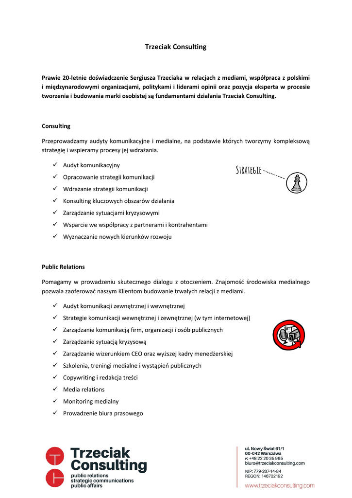 Trzeciak Consulting Prawie 20-letnie doświadczenie Sergiusza Trzeciaka w relacjach z mediami, współpraca z polskimi i międzynarodowymi organizacjami, politykami i liderami opinii oraz pozycja eksperta w procesie tworzenia i budowania marki osobistej są fundamentami działania Trzeciak Consulting. Consulting Przeprowadzamy audyty komunikacyjne i medialne, na podstawie których tworzymy kompleksową strategię i wspieramy procesy jej wdrażania. Audyt komunikacyjny Opracowanie strategii komunikacji Wdrażanie strategii komunikacji Konsulting kluczowych obszarów działania Zarządzanie sytuacjami kryzysowymi Wsparcie we współpracy z partnerami i kontrahentami Wyznaczanie nowych kierunków rozwoju Public Relations Pomagamy w prowadzeniu skutecznego dialogu z otoczeniem. Znajomość środowiska medialnego pozwala zaoferować naszym Klientom budowanie trwałych relacji z mediami. Audyt komunikacji zewnętrznej i wewnętrznej Strategie komunikacji wewnętrznej i zewnętrznej (w tym internetowej) Zarządzanie komunikacją firm, organizacji i osób publicznych Zarządzanie sytuacją kryzysową Zarządzanie wizerunkiem CEO oraz wyższej kadry menedżerskiej Szkolenia, treningi medialne i wystąpień publicznych Copywriting i redakcja treści Media relations Monitoring medialny Prowadzenie biura prasowego Public Affairs Pomagamy w budowaniu pozytywnych relacji z decydentami, liderami opinii i administracją publiczną. Zaangażowanie kluczowych interesariuszy wzmacnia pozycję biznesową Twojej organizacji i pomoże w osiągnięciu zamierzonych celów. Relacje z parlamentarzystami Relacje z administracją rządową Relacje z administracją samorządową Monitoring legislacyjny Monitoring medialny Relacje z think tankami Relacje z organizacjami branżowymi Branding Silna marka osobista jest kluczem do osiągnięcia sukcesu. Sergiusz Trzeciak jest jednym z najbardziej znanych promotorów idei personal brandingu w Polsce i autorem książek Coaching marki osobistej, czyli kariera lidera oraz Wizerunek publiczny w Internecie. Program budowania marki osobistej – warsztaty, konsultacje i mentoring na każdym etapie trwania programu Strategia marki osobistej - określenie celów, grup docelowych, przekazu, narzędzi i taktyki działania Doradztwo strategiczne w budowaniu marki osobistej Szkolenia z zakresu budowania strategii marki osobistej Coaching medialny i współpraca z mediami Book coaching – wsparcie w przygotowaniu i wydaniu książki Training Zdobyta wiedza i zadowolenie tysięcy osób, które w ciągu prawie 20 lat uczestniczyły w szkoleniach i warsztatach prowadzonych przez Sergiusza Trzeciaka w 9 krajach świata jest najlepszą rekomendacją dla naszych szkoleń i warsztatów. Szkolenia profesjonalnych mówców Szkolenia z wystąpień medialnych Szkolenia z budowania marki osobistej w biznesie Szkolenia z budowania marki osobistej w instytucjach i organizacjach Coaching medialny Wystąpienia motywacyjne i public speech Długookresowe programy szkoleniowe z zakresu marki osobistej w biznesie Korzyści ze współpracy z Trzeciak Consulting ✓ doświadczenie w relacjach z mediami ✓ doświadczenie w relacjach z decydentami, politykami, przedstawicielami opinii publicznej i liderami opinii ✓ doświadczenie w budowaniu wizerunku publicznego ✓ elastyczne i indywidualne podejście do Klienta ✓ dostosowanie strategii i propozycji działań ✓ zaangażowanie i współpraca oparta na otwartości i zaufaniu ✓ wspólne dążenie do osiągnięcia zamierzonych celów Sergiusz Trzeciak Politolog, prawnik, ekspert personal brandingu, wizerunku publicznego, public relations i marketingu politycznego. Wieloletni trener i konsultant polityczny z międzynarodowym doświadczeniem. Absolwent Wydziału Prawa i Administracji UAM, absolwent Wydziału Prawa Uniwersytetu ŚrodkowoEuropejskiego w Budapeszcie. Stypendysta British Council w St. Antony's College na Uniwersytecie w Oxfordzie. Doktorat na Wydziale Stosunków Międzynarodowych London School of Economics. Absolwent i wykładowca Szkoły Liderów. Wykładowca personal brandingu Executive MBA i DBA PAN. Wykładowca marketingu politycznego w Collegium Civitas. Prezes Instytutu Sobieskiego w Warszawie w latach 2006-2008. Konsultant i trener Organizacji Bezpieczeństwa i Współpracy w Europie, z ramienia której przeszkolił ponad 300 liderów organizacji społecznych i politycznych w Europie, Azji i Afryce Północnej. Od blisko 20 lat doradza partiom politycznym, sztabom wyborczym oraz kandydatom w wyborach parlamentarnych i samorządowych. Prowadzi szkolenia z zakresu marketingu politycznego, treningu medialnego, public relations i budowania marki osobistej w polityce, w których udział wzięło kilka tysięcy osób, w tym kilkuset polskich i zagranicznych parlamentarzystów oraz setki wójtów, burmistrzów, prezydentów i radnych różnych szczebli samorządu terytorialnego. Z sukcesami doradza firmom i osobom publicznym w zakresie budowania marki osobistej, kształtowania wizerunku publicznego i public relations. Aktywny komentator z zakresu polityki, wizerunku publicznego oraz marki osobistej w ponad stu mediach polskich i międzynarodowych Autor 9 książek z zakresu personal brandingu, marketingu politycznego i analizy politycznej, które ukazały się w Polsce i Wielkiej Brytanii: ”Wizerunek publiczny w Internecie", "Coaching marki osobistej, czyli kariera lidera", "Drzewo kampanii wyborczej, czyli jak wygrać wybory”, "Poland's EU Accession", "Marketing polityczny w Internecie", "Gra o Europę. Negocjacje akcesyjne Polski z Unią Europejską", "Kampania wyborcza. Strategia sukcesu", "Jak wygrać wybory samorządowe?", • "Strategie kampanii wyborczej".