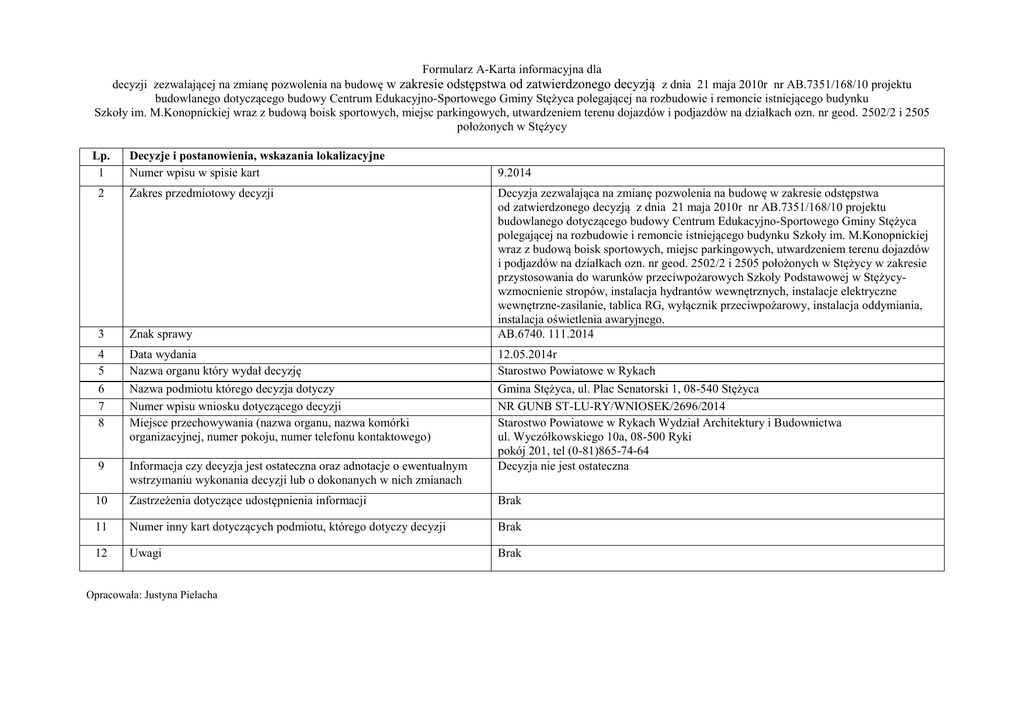 Formularz A-Karta informacyjna dla decyzji zezwalającej na zmianę pozwolenia na budowę w zakresie odstępstwa od zatwierdzonego decyzją z dnia 21 maja 2010r nr AB.7351/168/10 projektu budowlanego dotyczącego budowy Centrum Edukacyjno-Sportowego Gminy Stężyca polegającej na rozbudowie i remoncie istniejącego budynku Szkoły im. M.Konopnickiej wraz z budową boisk sportowych, miejsc parkingowych, utwardzeniem terenu dojazdów i podjazdów na działkach ozn. nr geod. 2502/2 i 2505 położonych w Stężycy Lp. 1 Decyzje i postanowienia, wskazania lokalizacyjne Numer wpisu w spisie kart 9.2014 Decyzja zezwalająca na zmianę pozwolenia na budowę w zakresie odstępstwa od zatwierdzonego decyzją z dnia 21 maja 2010r nr AB.7351/168/10 projektu budowlanego dotyczącego budowy Centrum Edukacyjno-Sportowego Gminy Stężyca polegającej na rozbudowie i remoncie istniejącego budynku Szkoły im. M.Konopnickiej wraz z budową boisk sportowych, miejsc parkingowych, utwardzeniem terenu dojazdów i podjazdów na działkach ozn. nr geod. 2502/2 i 2505 położonych w Stężycy w zakresie przystosowania do warunków przeciwpożarowych Szkoły Podstawowej w Stężycywzmocnienie stropów, instalacja hydrantów wewnętrznych, instalacje elektryczne wewnętrzne-zasilanie, tablica RG, wyłącznik przeciwpożarowy, instalacja oddymiania, instalacja oświetlenia awaryjnego. AB.6740. 111.2014 2 Zakres przedmiotowy decyzji 3 Znak sprawy 4 5 6 7 8 Data wydania Nazwa organu który wydał decyzję Nazwa podmiotu którego decyzja dotyczy Numer wpisu wniosku dotyczącego decyzji Miejsce przechowywania (nazwa organu, nazwa komórki organizacyjnej, numer pokoju, numer telefonu kontaktowego) 9 Informacja czy decyzja jest ostateczna oraz adnotacje o ewentualnym wstrzymaniu wykonania decyzji lub o dokonanych w nich zmianach 10 Zastrzeżenia dotyczące udostępnienia informacji Brak 11 Numer inny kart dotyczących podmiotu, którego dotyczy decyzji Brak 12 Uwagi Brak Opracowała: Justyna Pielacha 12.05.2014r Starostwo Powiatowe w Rykach Gmina Stężyca, ul. Plac Senatorski 1, 08-540 Stężyca NR GUNB ST-LU-RY/WNIOSEK/2696/2014 Starostwo Powiatowe w Rykach Wydział Architektury i Budownictwa ul. Wyczółkowskiego 10a, 08-500 Ryki pokój 201, tel (0-81)865-74-64 Decyzja nie jest ostateczna