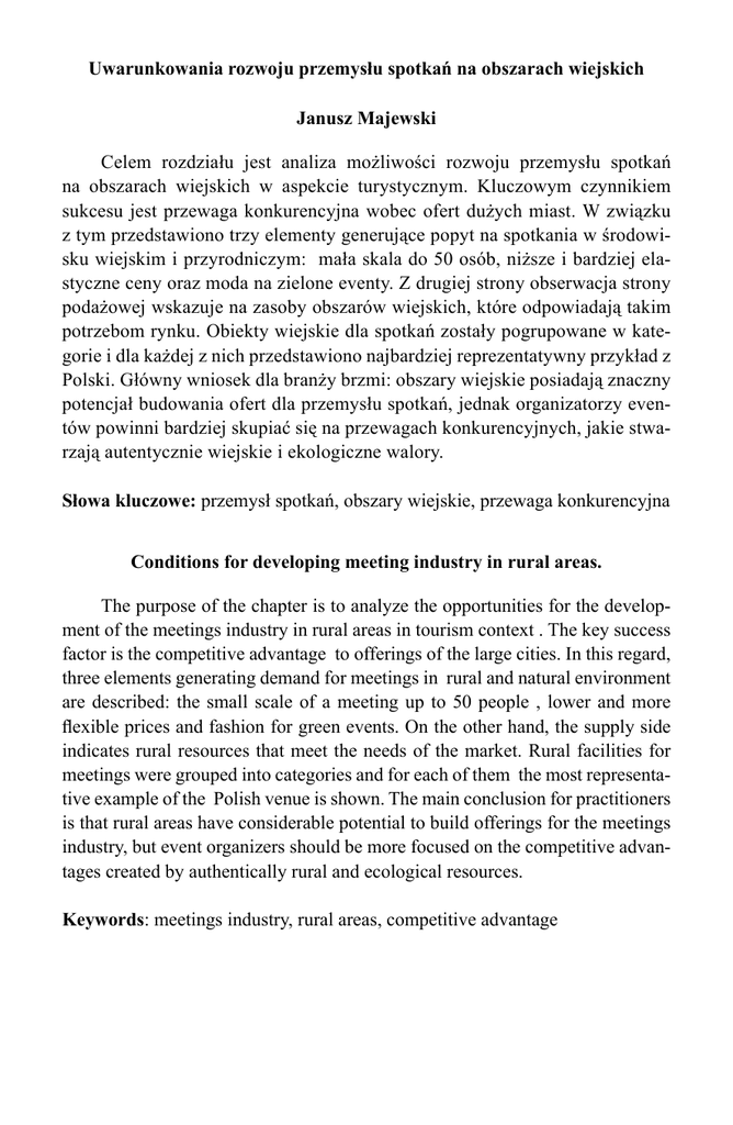Uwarunkowania rozwoju przemysłu spotkań na obszarach wiejskich Janusz Majewski Celem rozdziału jest analiza możliwości rozwoju przemysłu spotkań na obszarach wiejskich w aspekcie turystycznym. Kluczowym czynnikiem sukcesu jest przewaga konkurencyjna wobec ofert dużych miast. W związku z tym przedstawiono trzy elementy generujące popyt na spotkania w środowisku wiejskim i przyrodniczym: mała skala do 50 osób, niższe i bardziej elastyczne ceny oraz moda na zielone eventy. Z drugiej strony obserwacja strony podażowej wskazuje na zasoby obszarów wiejskich, które odpowiadają takim potrzebom rynku. Obiekty wiejskie dla spotkań zostały pogrupowane w kategorie i dla każdej z nich przedstawiono najbardziej reprezentatywny przykład z Polski. Główny wniosek dla branży brzmi: obszary wiejskie posiadają znaczny potencjał budowania ofert dla przemysłu spotkań, jednak organizatorzy eventów powinni bardziej skupiać się na przewagach konkurencyjnych, jakie stwarzają autentycznie wiejskie i ekologiczne walory. Słowa kluczowe: przemysł spotkań, obszary wiejskie, przewaga konkurencyjna Conditions for developing meeting industry in rural areas. The purpose of the chapter is to analyze the opportunities for the development of the meetings industry in rural areas in tourism context . The key success factor is the competitive advantage to offerings of the large cities. In this regard, three elements generating demand for meetings in rural and natural environment are described: the small scale of a meeting up to 50 people , lower and more flexible prices and fashion for green events. On the other hand, the supply side indicates rural resources that meet the needs of the market. Rural facilities for meetings were grouped into categories and for each of them the most representative example of the Polish venue is shown. The main conclusion for practitioners is that rural areas have considerable potential to build offerings for the meetings industry, but event organizers should be more focused on the competitive advantages created by authentically rural and ecological resources. Keywords: meetings industry, rural areas, competitive advantage