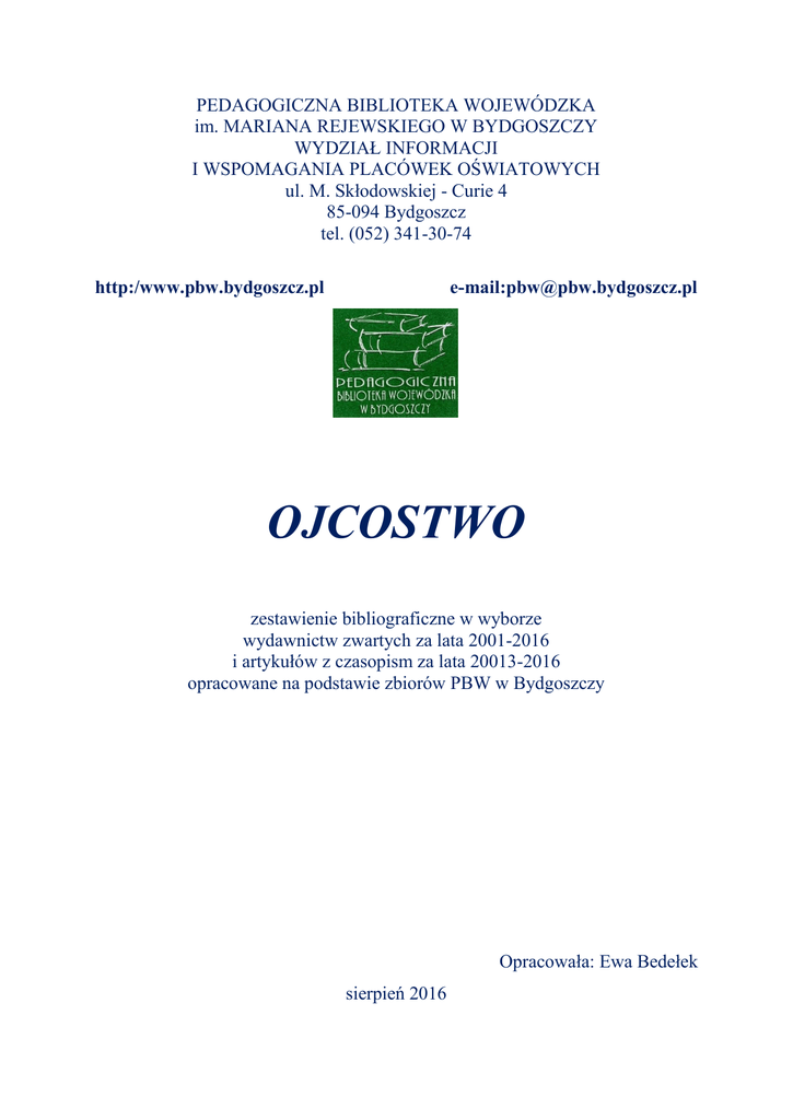 PEDAGOGICZNA BIBLIOTEKA WOJEWÓDZKA im. MARIANA REJEWSKIEGO W BYDGOSZCZY WYDZIAŁ INFORMACJI I WSPOMAGANIA PLACÓWEK OŚWIATOWYCH ul. M. Skłodowskiej - Curie 4 85-094 Bydgoszcz tel. (052) 341-30-74 http:/www.pbw.bydgoszcz.pl e-mail:[email protected] OJCOSTWO zestawienie bibliograficzne w wyborze wydawnictw zwartych za lata 2001-2016 i artykułów z czasopism za lata 20013-2016 opracowane na podstawie zbiorów PBW w Bydgoszczy Opracowała: Ewa Bedełek sierpień 2016 Wydawnictwa zwarte Artykuły w wydawnictwach zwartych 1. Adopcja dziecka : psychologiczna analiza decyzji u kobiet i mężczyzn / Anna Jarmołowska. - Lublin : Towarzystwo Naukowe Katolickiego Uniwersytetu Lubelskiego Jana Pawła II, 2007. - 230 s. sygnatura 151259 2. Autorytet rodzicielski i jego rola w wychowaniu młodego pokolenia / Anna Błasiak // W: Odpowiedzialne rodzicielstwo wobec wyzwań XXI wieku / red. nauk. Małgorzata Duda. - Kraków : Wydawnictwo św. Stanisława BM Archidiecezji Krakowskiej, 2010. – S. 89-96 sygnatura 157863 3. Być rodzicem we współczesnej Polsce : nowe wzory w konfrontacji z rzeczywistością / pod red. Małgorzaty Sikorskiej. - Warszawa : Wydawnictwa Uniwersytetu Warszawskiego, 2009. - 195 s. sygnatura 159878 Zawiera części: Część I – Nowe ideologie, wzory, presje społeczne, z którymi borykają się współcześni polscy młodzi rodzice. Część II – Rzeczywistość rodzicielstwa we współczesnej Polsce. 4. Człowiek w obliczu ojcostwa Boga – sens życia i śmierci / Natalia Maria Ruman // W: Współczesne ojcostwo : konteksty kulturowe, pedagogiczne i prawne / redakcja naukowa Ewa Ogrodzka-Mazur, Grzegorz Błahut, Teresa Bogusława Chmiel. - Toruń : Wydawnictwo Adam Marszałek, 2016. – S. 181195 sygnatura 160479 5. Czy dzieci są radością ojców i utrapieniem matek? / Joanna KoniecznaSałamatin // W: Być rodzicem we współczesnej Polsce : nowe wzory w konfrontacji z rzeczywistością / pod red. Małgorzaty Sikorskiej. - Warszawa : Wydawnictwa Uniwersytetu Warszawskiego, 2009. – S. 178-187 sygnatura 159878 6. Czynniki determinujące pozycję procesową ojca w sprawach o powierzenie wykonywania władzy rodzicielskiej / Anna Szczepaniak, Rafał Szczepaniak // W: Współczesne ojcostwo : konteksty kulturowe, pedagogiczne i prawne / redakcja naukowa Ewa Ogrodzka-Mazur, Grzegorz Błahut, Teresa Bogusława Chmiel. - Toruń : Wydawnictwo Adam Marszałek, 2016. – S. 108-124 sygnatura 160479 7. Jak być wspaniałym tatą / Ian Bruce ; przekł. Tomasz Illg. - Poznań : Vesper, 2010. - 259, [1] s. sygnatura 157246 Zawiera m. in. rozdziały: Co to znaczy być wspaniałym tatą? Jak znaleźć czas na ojcostwo? Bycie wspaniałym ojcem dorosłego dziecka. Wychowanie dzieci specjalnej troski. 8. Kastrowane ojcostwo? W poszukiwaniu tożsamości współczesnego ojca / Teresa Bogusława Chmiel // W: Współczesne ojcostwo : konteksty kulturowe, pedagogiczne i prawne / redakcja naukowa Ewa Ogrodzka-Mazur, Grzegorz Błahut, Teresa Bogusława Chmiel. - Toruń : Wydawnictwo Adam Marszałek, 2016. – S. 24-38 sygnatura 160479 9. Kryzys ojcostwa / Małgorzata Duda // W: Odpowiedzialne rodzicielstwo wobec wyzwań XXI wieku / red. nauk. Małgorzata Duda. - Kraków : Wydawnictwo św. Stanisława BM Archidiecezji Krakowskiej, 2010. – S. 213-216 sygnatura 157863 10. Międzypokoleniowa transmisja postaw wychowawczych ojców / Małgorzata Sitarczyk. - Lublin : Wydawnictwo UMCS, 2002. - 91 s. sygnatura 145185 – 145186 Zawiera m. in. rozdziały: Kształtowanie postaw rodzicielskich. Postawy ojcowskie w świetle wyników kwestionariusza CRPBI E.S.SCHAEFERA. 1. Postawa ojcowska typu „bliskość uczuciowa” 2. Postawa ojcowska typu „dystans uczuciowy” 3. Postawa ojcowska typu „kontrola” 4. Postawa ojcowska typu „autonomia”. Rola doświadczeń z rodziny pochodzenia w genezie postaw ojcowskich. 11. O naskórkowej (lub kosmetycznej) przemianie męskości / Tomasz Szlendak // W: Być rodzicem we współczesnej Polsce : nowe wzory w konfrontacji z rzeczywistością / pod red. Małgorzaty Sikorskiej. - Warszawa : Wydawnictwa Uniwersytetu Warszawskiego, 2009. – S. 62- 76 sygnatura 159878 12. Oblicza empatii w procesie adaptacji do rodzicielstwa / Maria Kaźmierczak. - Warszawa : Wydawnictwo Naukowe SCHOLAR, 2015. 320, s. sygnatura 159316 Zawiera m. in. rozdziały: Rodzicielstwo jako zmiana życiowa. Adaptacja do ojcostwa jako proces. Rodzicielstwo jako zmiana w funkcjonowaniu pary. Orientacje wobec macierzyństwa i ojcostwa a jakość relacji miedzy rodzicami. Osobowościowe uwarunkowania adaptacji do rodzicielstwa. Obraz siebie jako matki i ojca a proces adaptacji do ról rodzicielskich. Empatia matek i ojców a ich emocjonalne przystosowanie do rodzicielstwa. Empatia w parze rodzicielskiej a proces adaptacji do macierzyństwa i ojcostwa. 13. Oblicza ojcostwa / red. Dorota Kornas-Biela. - Lublin : TN KUL, 2001. 623 s. sygnatura 138487 Zawiera części: Teologiczny kontekst ojcostwa. Wychowawcze aspekty ojcostwa. Ojcostwo w sytuacjach trudnych życiowo. Ojcostwo w społecznym odbiorze. 14. Odpowiedzialne rodzicielstwo wobec wyzwań XXI wieku / red. nauk. Małgorzata Duda. - Kraków : Wydawnictwo św. Stanisława BM Archidiecezji Krakowskiej, 2010. - 216 s. sygnatura 157863 15. Ojcem być i stawać się / Henryk Krzysteczko // W: Współczesne ojcostwo : konteksty kulturowe, pedagogiczne i prawne / redakcja naukowa Ewa Ogrodzka-Mazur, Grzegorz Błahut, Teresa Bogusława Chmiel. - Toruń : Wydawnictwo Adam Marszałek, 2016. – S. 145-161 sygnatura 160479 16. Ojciec / red. nauk. Sławomir Jabłoński. - Poznań : Wydaw. Fundacji Humaniora, 2000. - 190 s. sygnatura 139098 p / 316 Zawiera części: Ojcostwo duchowe. Znaczący ojciec. Historia roli ojca. Być ojcem… 17. Ojciec a wychowanie dziecka / Kazimierz Pospiszyl. - Warszawa : Wydawnictwo Akademickie "Żak", 2007. - 166, [2] s. sygnatura 148224 – 148225, 147981 p / 37.018 Zawiera rozdziały: Specyficzne cechy roli ojca w wycho