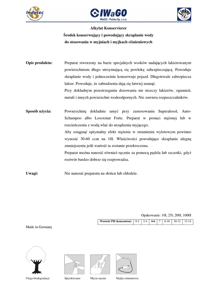 Alkylat Konservierer Środek konserwujący i powodujący skraplanie wody do stosowania w myjniach i myjkach ciśnieniowych Opis produktu: Preparat stworzony na bazie specjalnych wosków nadających lakierowanym powierzchniom długo utrzymującą się powłokę zabezpieczającą. Powoduje skraplanie wody i jednocześnie konserwuje pojazd. Długotrwale zabezpiecza lakier. Powoduje, że zabrudzenia dają się łatwiej usunąć. Przy dokładnym przestrzeganiu dozowania nie niszczy lakierów, ogumień, metali i innych powierzchni wodoodpornych. Nie zawiera rozpuszczalników. Sposób użycia: Powierzchnię dokładnie umyć przy zastosowaniu Superalosol, AutoSchampoo albo Losoxinat Forte. Preparat w postaci stężonej lub w rozcieńczeniu z wodą wlać do urządzenia myjącego. Aby osiągnąć optymalny efekt stężenie w strumieniu wylotowym powinno wynosić 30-60 ccm na 10l. Właściwości powodujące skraplanie ulegną zmniejszeniu jeśli wartość ta zostanie przekroczona. Preparat można nanosić również ręcznie za pomocą pędzla lub szczotki, gdyż roztwór bardzo dobrze się rozprowadza. Uwagi: Nie nanosić preparatu na słońcu lub chłodzie. Opakowanie: 10l, 25l, 200l, 1000l Wartość PH (koncentrat) 0-2 Made in Germany Ulega biodegradacji Spryskiwanie Mycie ręczne Myjka ciśnieniowa 2-4 4-6 7 8-10 10-12 12-14