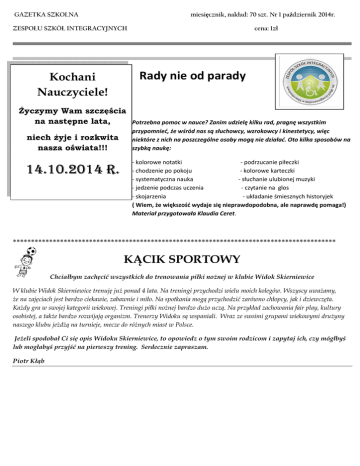GAZETKA SZKOLNA miesięcznik, nakład: 70 szt. Nr 1 październik 2014r. ZESPOŁU SZKÓŁ INTEGRACYJNYCH Rady nie od parady Kochani Nauczyciele! Życzymy Wam szczęścia na następne lata, niech żyje i rozkwita nasza oświata!!! 14.10.2014 R. cena: 1zł Potrzebna pomoc w nauce? Zanim udzielę kilku rad, pragnę wszystkim przypomnieć, że wśród nas są słuchowcy, wzrokowcy i kinestetycy, więc niektóre z nich na poszczególne osoby mogą nie działać. Oto kilka sposobów na szybką naukę: - kolorowe notatki - podrzucanie piłeczki - chodzenie po pokoju - kolorowe karteczki - systematyczna nauka - słuchanie ulubionej muzyki - jedzenie podczas uczenia - czytanie na glos - skojarzenia - układanie śmiesznych historyjek ( Wiem, że większość wydaje się nieprawdopodobna, ale naprawdę pomaga!) Materiał przygotowała Klaudia Ceret. ***************************************************************************************** KĄCIK SPORTOWY Chciałbym zachęcić wszystkich do trenowania piłki nożnej w klubie Widok Skierniewice W klubie Widok Skierniewice trenuję już ponad 4 lata. Na treningi przychodzi wielu moich kolegów. Wszyscy uważamy, że na zajęciach jest bardzo ciekawie, zabawnie i miło. Na spotkania mogą przychodzić zarówno chłopcy, jak i dziewczęta. Każdy gra w swojej kategorii wiekowej. Treningi piłki nożnej bardzo dużo uczą. Na przykład zachowania fair play, kultury osobistej, a także bardzo rozwijają organizm. Trenerzy Widoku są wspaniali. Wraz ze swoimi grupami wiekowymi drużyny naszego klubu jeżdżą na turnieje, mecze do różnych miast w Polsce. Jeżeli spodobał Ci się opis Widoku Skierniewice, to opowiedz o tym swoim rodzicom i zapytaj ich, czy mógłbyś lub mogłabyś przyjść na pierwszy trening. Serdecznie zapraszam. Piotr Kłąb GAZETKA SZKOLNA ZESPOŁU SZKÓŁ INTEGRACYJNYCH W SKIERNIEWICACH – Nr 10 – Październik 2014 r. Ciekawostki o „dziewiątce” w liczbach Czy wiecie, ile sal lekcyjnych jest w naszej szkole? Sprawdziliśmy to. Naszym źródłem informacji był Pan Tadeusz – czyli kierownik gospodarczy. W naszej szkole znajduje się 27 sal lekcyjnych. Długość korytarza wokół auli wynosi 281 stóp. Nasze stopy maja około 23 cm długości. Kto sprytny policzy, ile to metrów? W naszej stołówce wydaje się 5623 obiady miesięcznie. Nie zgadniecie, ile jest toalet... Aż 23 toalety. W naszej szkole pracuje 104 nauczycieli. Ciekawscy redaktorzy gazetki Coś dla ciała, czyli Herkules na Widoku Nasi redaktorzy postanowili osobiście sprawdzić funkcjonalność nowej siłowni Herkules. Jest to pierwsza w Skierniewicach siłownia na świeżym powietrzu. Zainstalowano ją koło placu zabaw przy ul. Wańkowicza. W sumie można skorzystać z 26 urządzeń. Najciekawsze naszym zdaniem to piechur, pajacyk i narciarz. Oprócz nich można ćwiczyć na trenażerze nóg, drabince, rowerku, wioślarzu, jeźdźcu konnym, prostowniku pleców, nartach biegówkach, orbiteku i kole Tai Chi. Dla zmęczonych polecamy masażer pleców. Z placu zabaw mogą korzystać osoby powyżej 10 roku życia. Młodzież do 14 lat powinna korzystać z urządzeń pod opieka osób dorosłych. Teren, na którym znajduje się siłownia, jest bardzo czysty, porośnięty trawą. Wokół są ławeczki, na których można odpocząć. Zachęcamy do korzystania z siłowni w celach towarzyskich, ale także dla zwiększenia sprawności fizycznej. Podobno z siłowni korzystają już w czasie lekcji w-fu uczniowie z Gimnazjum nr 1. Namówcie rodziców, aby w weekend razem z Wami poćwiczyli. Zanim zaczniecie ćwiczyć, przeczytajcie opis i instrukcję korzystania z danego urządzenia. Pamiętajcie o regulaminie. Agata, Marika, Kamila Wieści z ratusza Do Samorządu Uczniowskiego, którego opiekunem jest pani J. Szwajkosz, pani M. Biskupska-Duda oraz pan K.Skoneczny, przyjęto 45 uczniów. W czasie głosowania dokonaliśmy wyboru na najważniejsze stanowiska. Przewodnicząca: Oliwia Walichowska Zastępca: Maja Mitkowska oraz Wiktoria Czapnik Sekretarz: Kinga Jasik oraz Julia Wach Wybranym serdecznie gratulujemy i życzymy powodzenia w nadchodzącym roku. Klaudia Ceret 2 GAZETKA SZKOLNA ZESPOŁU SZKÓŁ INTEGRACYJNYCH W SKIERNIEWICACH – Nr 10 – Październik 2014 r. Dietetyk Maja radzi: Aby zapobiec próchnicy, trzeba ograniczyć ilość cukierków, myć trzy razy dziennie zęby. Można skorzystać z nici dentystycznej, która wyciągnie nam resztki jedzenia z zębów czy pomiędzy zębami. Bakterie znajdują się również na języku. Język też trzeba szczotkować. Po umyciu zębów niektóre bakterie są usunięte, ale jak chcemy, żeby w naszej jamie ustnej nie było bakterii, to trzeba opłukać również zęby płynem do jamy ustnej. Niewłaściwe odżywianie się produktami zawierającymi dużą ilość cukrów prostych oraz niedostateczna higiena jamy ustnej lub jej brak jest najkrótszą drogą do próchnicy. Higiena jamy ustnej jest bardzo ważna, jeżeli nie byśmy dbali o zęby to... Sami się przekonacie, co się stanie. Dziękuję oraz proszę, dbajcie o swe zęby. Dietetyk Maja. Wróżbita Gumiś przewiduje, że: Wróżby uczniów klas 4-6 i gimnazjum: -Na pierwszej dyskotece spotkają swoją drugą połowę klasy 2 gimnazjum i klasy 5 i 6. -Pierwszy miesiąc nauki dla klas 4 będzie dosyć kiepski. Odradzamy bieganie na terenie szkoły w czasie przerwy, bo grozić to może kontuzją, bądź poważną rozmową z pedagogiem. -W grudniu wybrane dzieci odwiedzi Czerwony Pan. -W przyszłym miesiącu wybrane klasy odwiedzi Pani Dyrektor. -Klasy 5 pod koniec października mogą się spodziewać licznych kartkówek. -W najbliższym czasie na bieżni za szkołą odbędzie się maraton ślimaków. Prosimy o kibicowanie w wyznaczonej strefie, żeby nie przeszkadzać zawodnikom. Ucho od śledzia, czyli co w trawie piszczy Przeprowadziliśmy sondę wśród uczniów klas 4-6, co sądzą o powrocie z wakacji do szkoły. Oto zebrane wypowiedzi: -Ten rok będzie bardz