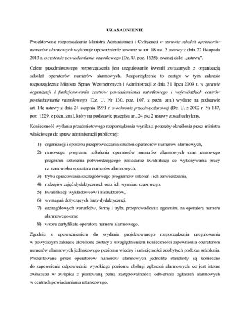 UZASADNIENIE Projektowane rozporządzenie Ministra Administracji i Cyfryzacji w sprawie szkoleń operatorów numerów alarmowych wykonuje upoważnienie zawarte w art. 18 ust. 3 ustawy z dnia 22 listopada 2013 r. o systemie powiadamiania ratunkowego (Dz. U. poz. 1635), zwanej dalej „ustawą”. Celem przedmiotowego rozporządzenia jest uregulowanie kwestii związanych z organizacją szkoleń operatorów numerów alarmowych. Rozporządzenie to zastąpi w tym zakresie rozporządzenie Ministra Spraw Wewnętrznych i Administracji z dnia 31 lipca 2009 r. w sprawie organizacji i funkcjonowania centrów powiadamiania ratunkowego i wojewódzkich centrów powiadamiania ratunkowego (Dz. U. Nr 130, poz. 107, z późn. zm.) wydane na podstawie art. 14e ustawy z dnia 24 sierpnia 1991 r. o ochronie przeciwpożarowej (Dz. U. z 2002 r. Nr 147, poz. 1229, z późn. zm.), który na podstawie przepisu art. 24 pkt 2 ustawy został uchylony. Konieczność wydania przedmiotowego rozporządzenia wynika z potrzeby określenia przez ministra właściwego do spraw administracji publicznej: 1) organizacji i sposobu przeprowadzania szkoleń operatorów numerów alarmowych, 2) ramowego programu szkolenia operatorów numerów alarmowych oraz ramowego programu szkolenia potwierdzającego posiadanie kwalifikacji do wykonywania pracy na stanowisku operatora numerów alarmowych, 3) trybu opracowania szczegółowego programów szkoleń i ich zatwierdzania, 4) rodzajów zajęć dydaktycznych oraz ich wymiaru czasowego, 5) kwalifikacji wykładowców i instruktorów, 6) wymagań dotyczących bazy dydaktycznej, 7) szczegółowych warunków, formy i trybu przeprowadzania egzaminu na operatora numeru alarmowego oraz 8) wzoru certyfikatu operatora numeru alarmowego. Zgodnie z upoważnieniem do wydania projektowanego rozporządzenia uregulowania w powyższym zakresie określone zostały z uwzględnieniem konieczności zapewnienia operatorom numerów alarmowych jednakowego poziomu wiedzy i umiejętności zdobytych podczas szkolenia. Prezentowane przez operatorów numerów alarmowych jednolite standardy są konieczne do zapewnienia odpowiednio wysokiego poziomu obsługi zgłoszeń alarmowych, co jest istotne zwłaszcza w związku z planowaną pełną zastępowalnością odbierania zgłoszeń alarmowych w centrach powiadamiania ratunkowego. Projektowane rozporządzenie zawiera następujące uregulowania: W § 2 w określona została organizacja i sposób przeprowadzenia szkolenia operatorów numerów alarmowych. Na potrzeby takiego szkolenia ośrodek szkolący (tj. wojewoda lub podmiot, któremu powierza się przeprowadzenie szkolenia i egzaminowania operatorów numerów alarmowych) obowiązany jest zapewnić bazę dydaktyczną w postaci sali wykładowej wyposażonej w terminal wideokonferencyjny – na potrzeby zajęć teoretycznych oraz sal wykładowych i sal ćwiczeniowych wyposażonych w sprzęt teleinformatyczny wykorzystywany na stanowisku pracy operatora i inne wyposażenie niezbędne do realizacji celów szkolenia (jak urządzenia na których będą przedstawiane informacje, sprzęt nagłośnieniowy, „fantom” do nauki przeprowadzania resuscytacji krążeniowo oddechowej, apteczka pierwszej pomocy, materiały dydaktyczne, itp.) – na potrzeby zajęć praktycznych. Konieczne jest także zapewnienie przez ośrodek szkolący kadry wykładowców i instruktorów. Zgodnie z § 3, szkolenie obejmuje zarówno część teoretyczną, jak i praktyczną. W szkoleniu (w tym potwierdzającym posiadanie wymaganych kwalifikacji) uczestniczyć mogą jedynie osoby wyznaczone przez kierownika lub zastępcę centrum. W § 4 określono niezbędne kompetencje wykładowców i instruktorów, gwarantujące że szkolenie przeprowadzone zostanie w sposób fachowy i rzetelny oraz obejmie swoim zakresem wszystkie zagadnienia wymagane do pracy na stanowisku operatora numerów alarmowych. Kwalifikacje wykładowców i instruktorów będzie sprawdzał i weryfikował podmiot szkolący, któremu powierzono zadanie przeprowadzenia szkolenia. W § 5 – 7 uregulowano kwestie dotyczące podstaw szkolenia, tj. ramowych i szczegółowych programów szkolenia operatorów numerów alarmowych. Załączniki Nr 1 i 2 określają rodzaje zajęć dydaktycznych i ich wymiar czasowy odpowiednio dla ramowego programu szkolenia operatorów alarmowych oraz ramowego programu szkolenia potwierdzającego posiadanie kwalifikacji do dalszego wykonywania pracy na tym stanowisku. Szczegółowe programy opracowywać będzie ośrodek szkolący, w oparciu o ww. programy ramowe. Kwestię zgodności programów szczegółowych z programami ramowymi oceniać będzie minister właściwy do spraw administracji publicznej, który zatwierdzać będzie treść programów szczegółowych, a także wszystkie ich zmiany. W § 8 uregulowano tryb przeprowadzenia egzaminu na operatora numerów alarmowych. Określono, że egzamin przeprowadzany będzie przez 3-osobową komisję, w skład której wchodzić będą kierownik centrum powiadamiania ratunkowego albo jego zastępca (w roli przewodniczącego), przedstawiciel ośrodka szkolącego i psycholog. Ośrodek szkolący opracowywać będzie na dany rok projekt planu pracy komisji, uzgadniać go ze wszystkimi wojewodami i przedstawiać do zatwierdzenia ministrowi właściwemu do spraw administracji publicznej. Warunkiem przystąpienia do egzaminu, zgodnie z § 9, jest udział kandydata na operatora numerów alarmowych we wszystkich zajęciach teoretycznych i praktycznych objętych programem ramowym i szczegółowym, a w przypadku egzaminu potwierdzającego posiadanie kwalifikacji do wykonywania pracy na stanowisku operatora numerów alarmowych udział we wszystkich zajęciach teoretycznych i praktycznych objętych programem ramowym i programem szczegółowym szkolenia w ramach doskonalenia zawodowego. W § 10 określono przesłanki wyłączenia członków komisji z udziału w egzaminie, natomiast w § 11 obowiązki członków komisji. Służy to za