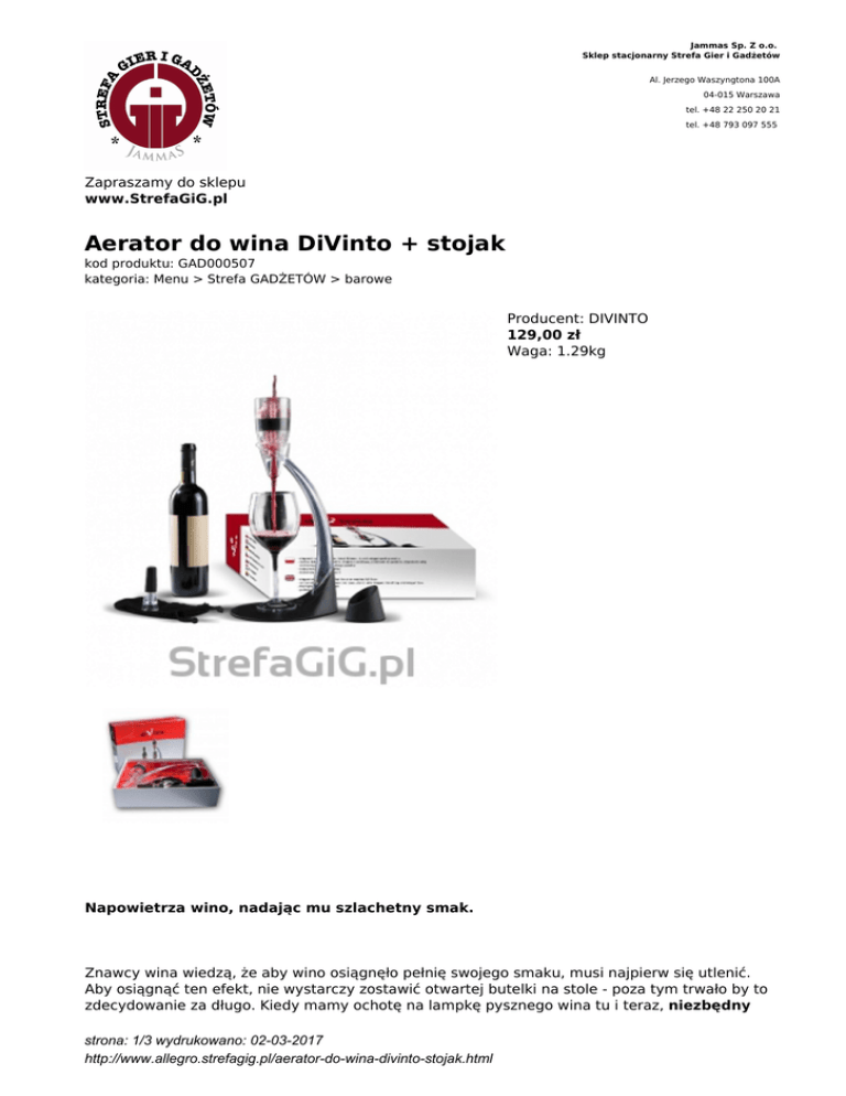 Jammas Sp. Z o.o. Sklep stacjonarny Strefa Gier i Gadżetów Al. Jerzego Waszyngtona 100A 04-015 Warszawa tel. +48 22 250 20 21 tel. +48 793 097 555 Zapraszamy do sklepu www.StrefaGiG.pl Aerator do wina DiVinto + stojak kod produktu: GAD000507 kategoria: Menu > Strefa GADŻETÓW > barowe Producent: DIVINTO 129,00 zł Waga: 1.29kg Napowietrza wino, nadając mu szlachetny smak. Znawcy wina wiedzą, że aby wino osiągnęło pełnię swojego smaku, musi najpierw się utlenić. Aby osiągnąć ten efekt, nie wystarczy zostawić otwartej butelki na stole - poza tym trwało by to zdecydowanie za długo. Kiedy mamy ochotę na lampkę pysznego wina tu i teraz, niezbędny strona: 1/3 wydrukowano: 02-03-2017 http://www.allegro.strefagig.pl/aerator-do-wina-divinto-stojak.html będzie elegancki i stylowy aerator. Dzięki niemu wino będzie doskonale smakować już po pierwszym łyku. Wystarczy postawić urządzenie na stojaku i wlewać przez nie wino. Trunek będzie filtrowany i wlewany do naczynia. Dzięki temu wino zostanie wystarczająco utlenione, aby osiągnąć pełnię swojego smaku. Do zestawu dołączono elegancki stojak na stół, aby wino nie rozlało się, podstawkę do aeratora, etui chroniące przed kurzem i stoper do wina. Wszystko jest wykończone z najwyższą dbałością o szczegóły i zapakowane w eleganckie pudełko. Trudno wyobrazić sobie bardziej elegancki prezent dla wielbicieli wina. Gadżet w pigułce: - zestaw składa się z: aeratora, stojaka z podstawą, podstawki do aeratora, stopera do wina, podróżnego etui i eleganckiego pudełka Przed pierwszym użyciem należy dokładnie wymyć produkt. strona: 2/3 wydrukowano: 02-03-2017 http://www.allegro.strefagig.pl/aerator-do-wina-divinto-stojak.html strona: 3/3 wydrukowano: 02-03-2017 http://www.allegro.strefagig.pl/aerator-do-wina-divinto-stojak.html
