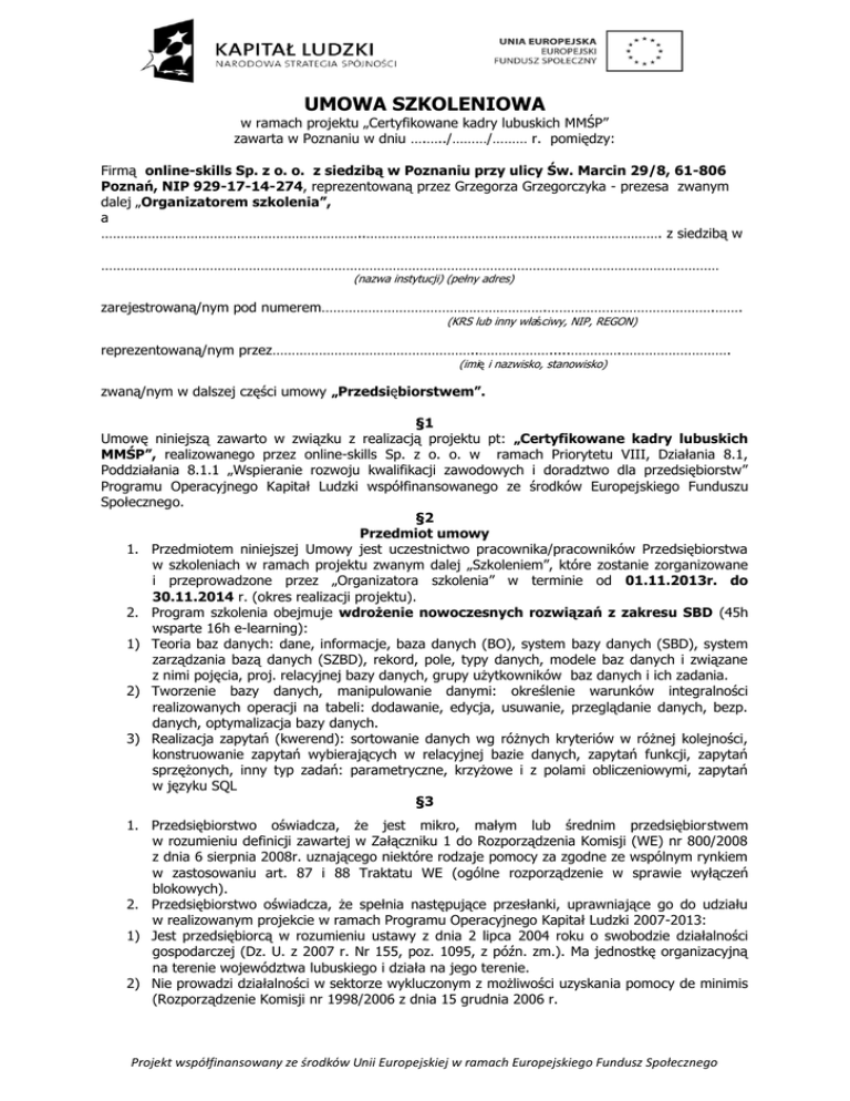 UMOWA SZKOLENIOWA w ramach projektu „Certyfikowane kadry lubuskich MMŚP” zawarta w Poznaniu w dniu ….…../………/……… r. pomiędzy: Firmą online-skills Sp. z o. o. z siedzibą w Poznaniu przy ulicy Św. Marcin 29/8, 61-806 Poznań, NIP 929-17-14-274, reprezentowaną przez Grzegorza Grzegorczyka - prezesa zwanym dalej „Organizatorem szkolenia”, a …………………………………………………………..…………………………………………………………………. z siedzibą w …………………………………………………………………………………………………………………………………………… (nazwa instytucji) (pełny adres) zarejestrowaną/nym pod numerem………………………………………………….…………………………………….……. (KRS lub inny właściwy, NIP, REGON) reprezentowaną/nym przez……………………………………………..……………….....………….………………………. (imię i nazwisko, stanowisko) zwaną/nym w dalszej części umowy „Przedsiębiorstwem”. §1 Umowę niniejszą zawarto w związku z realizacją projektu pt: „Certyfikowane kadry lubuskich MMŚP”, realizowanego przez online-skills Sp. z o. o. w ramach Priorytetu VIII, Działania 8.1, Poddziałania 8.1.1 „Wspieranie rozwoju kwalifikacji zawodowych i doradztwo dla przedsiębiorstw” Programu Operacyjnego Kapitał Ludzki współfinansowanego ze środków Europejskiego Funduszu Społecznego. §2 Przedmiot umowy 1. Przedmiotem niniejszej Umowy jest uczestnictwo pracownika/pracowników Przedsiębiorstwa w szkoleniach w ramach projektu zwanym dalej „Szkoleniem”, które zostanie zorganizowane i przeprowadzone przez „Organizatora szkolenia” w terminie od 01.11.2013r. do 30.11.2014 r. (okres realizacji projektu). 2. Program szkolenia obejmuje wdrożenie nowoczesnych rozwiązań z zakresu SBD (45h wsparte 16h e-learning): 1) Teoria baz danych: dane, informacje, baza danych (BO), system bazy danych (SBD), system zarządzania bazą danych (SZBD), rekord, pole, typy danych, modele baz danych i związane z nimi pojęcia, proj. relacyjnej bazy danych, grupy użytkowników baz danych i ich zadania. 2) Tworzenie bazy danych, manipulowanie danymi: określenie warunków integralności realizowanych operacji na tabeli: dodawanie, edycja, usuwanie, przeglądanie danych, bezp. danych, optymalizacja bazy danych. 3) Realizacja zapytań (kwerend): sortowanie danych wg różnych kryteriów w różnej kolejności, konstruowanie zapytań wybierających w relacyjnej bazie danych, zapytań funkcji, zapytań sprzężonych, inny typ zadań: parametryczne, krzyżowe i z polami obliczeniowymi, zapytań w języku SQL §3 1. Przedsiębiorstwo oświadcza, że jest mikro, małym lub średnim przedsiębiorstwem w rozumieniu definicji zawartej w Załączniku 1 do Rozporządzenia Komisji (WE) nr 800/2008 z dnia 6 sierpnia 2008r. uznającego niektóre rodzaje pomocy za zgodne ze wspólnym rynkiem w zastosowaniu art. 87 i 88 Traktatu WE (ogólne rozporządzenie w sprawie wyłączeń blokowych). 2. Przedsiębiorstwo oświadcza, że spełnia następujące przesłanki, uprawniające go do udziału w realizowanym projekcie w ramach Programu Operacyjnego Kapitał Ludzki 2007-2013: 1) Jest przedsiębiorcą w rozumieniu ustawy z dnia 2 lipca 2004 roku o swobodzie działalności gospodarczej (Dz. U. z 2007 r. Nr 155, poz. 1095, z późn. zm.). Ma jednostkę organizacyjną na terenie województwa lubuskiego i działa na jego terenie. 2) Nie prowadzi działalności w sektorze wykluczonym z możliwości uzyskania pomocy de minimis (Rozporządzenie Komisji nr 1998/2006 z dnia 15 grudnia 2006 r. Projekt współfinansowany ze środków Unii Europejskiej w ramach Europejskiego Fundusz Społecznego 3) Nie pozostaje w trudnej sytuacji ekonomicznej zgodnie z Rozporządzeniem Komisji (WE) nr 800/2008 z dnia 6 sierpnia 2008 r. uznającym niektóre rodzaje pomocy za zgodne ze wspólnym rynkiem w zastosowaniu art. 87 i 88 Traktatu WE (ogólne rozporządzenie w sprawie wyłączeń blokowych). 4) Nie jest podmiotem, na którym ciąży obowiązek zwrotu pomocy, wynikający z decyzji Komisji Europejskiej uznającej pomoc za niezgodną z prawem oraz wspólnym rynkiem (Ustawa z dn. 30 kwietnia 2004r. o postępowaniu w sprawach dotyczących pomocy publicznej Dz. U. z 2007r., Nr 59, poz. 404). 5) Należy do branż wskazanych w SRWL/LRSI (min. przetwórstwo przemysłowe, motoryzacyjna, chemiczna, materiałów budowlanych, informatyczna, drzewna, spożywcza, turystyczna, elektroniczna, informatyczna, papiernicza, produkcji tworzyw sztucznych, tekstylna, wydawnicza). §4 1. Uczestnikiem/uczestniczką szkolenia może zostać tylko oddelegowany pracownik/pracownica bądź kadra zarządzająca Przedsiębiorstwa, w dniu podpisania deklaracji przystąpienia do projektu spełniający łącznie poniższe kryteria kwalifikowalności: 1) Pracuje i / lub mieszka w województwie lubuskim. 2) Jest zatrudniony/a w Przedsiębiorstwie na podstawie umowy o pracę, bądź jest osobą samozatrudnioną. 2. Przedsiębiorstwo deleguje na szkolenie pracownika/pracowników wykazanych w formularzu zgłoszeniowym. Zmiana osób delegowanych na szkolenie jest możliwa wyłącznie za pisemną zgodą Organizatora szkolenia, po sprawdzeniu spełniania przez daną osobę kryteriów uczestnictwa w projekcie. 3. Szkolenie, będące przedmiotem niniejszej umowy, stanowi dla Przedsiębiorcy kierującego swojego pracownika na szkolenie pomoc de minimis, która jest udzielana zgodnie z Rozporządzenia Ministra Rozwoju Regionalnego z dnia 15 grudnia 2010 r. w sprawie udzielania pomocy publicznej w ramach Programu Operacyjnego Kapitał Ludzki. 4. Wysokość pomocy publicznej (pomocy de minimis) udzielonej w ramach Projektu wynosi 3 023,75 PLN (słownie: trzy tysiące dwadzieścia trzy złote siedemdziesiąt pięć groszy) w przeliczeniu na każdego oddelegowane