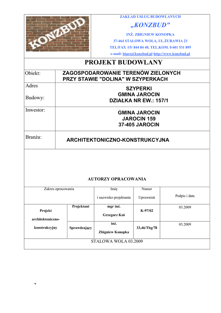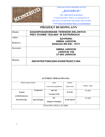 ZAK AD US UG BUDOWLANYCH „KONZBUD” IN . ZBIGNIEW KONOPKA 37-464 STALOWA WOLA, UL. URAWIA 23 TEL/FAX /15/ 844 84 40, TEL.KOM. 0 601 531 895 e-mail: [email protected] http://www.konzbud.pl PROJEKT BUDOWLANY ZAGOSPODAROWANIE TERENÓW ZIELONYCH PRZY STAWIE "DOLINA" W SZYPERKACH Obiekt: Adres SZYPERKI GMINA JAROCIN DZIA KA NR EW.: 157/1 Budowy: Inwestor: Bran a: GMINA JAROCIN JAROCIN 159 37-405 JAROCIN ARCHITEKTONICZNO-KONSTRUKCYJNA AUTORZY OPRACOWANIA Zakres opracowania Projektant Imi Numer i nazwisko projektanta Uprawnie mgr in . Projekt Podpis i data 03.2009 K-97/02 Grzegorz Ku architektonicznoin . konstrukcyjny Sprawdzaj cy 03.2009 33,46/Tbg/78 Zbigniew Konopka STALOWA WOLA 03.2009 + SPIS ZAWARTO CI PROJEKTU Lp zawarto 1. Strona tytu owa 2. Spis zawarto ci opracowania 3. Opis techniczny Rysunki: -Plan zagospodarowania –rys.1 Projekt budowlany -Wiata grillowa – rzut przyziemia i dachu – rys.2 zagospodarowanie -Wiata grillowa – przekrój i elewacje – rys.3 terenów zielonych -Wiata do ta ca – rzut przyziemia i dachu – rys.4 – rys.5 przy stawie"Dolina" -Wiata do ta ca – przekrój i elewacje -Altana z magazynkiem – rzut przyziemia i dachu – rys.6 w Szyperkach - Altana z magazynkiem – przekroje – rys.7 - Altana z magazynkiem – elewacje – rys.8 -Chodniki – rys.9 4. Kopie uprawnie projektantów 5. Kopie za wiadcze z PIIB 6. O wiadczenie o kompletno ci dokumentacji Opis do projektu zagospodarowania terenu Pod zagospodarowanie terenów zielonych przy stawie "Dolina" w Szyperkach 1. PODSTAWA OPRACOWANIA wizja lokalna z dokonaniem niezb dnych pomiarów inwentaryzacyjnych, uzgodnienia z Inwestorem, mapa sytuacyjno-wysoko ciowa 2. PRZEDMIOT I ZAKRES OPRACOWANIA Przedmiotem opracowania jest projekt zagospodarowania terenu pod zagospodarowanie terenów zielonych przy stawie "Dolina" w Szyperkach 3. ISTNIEJ CY STAN ZAGOSPODAROWANIA TERENU Teren dzia ki jest niezagospodarowany i nieogrodzony poro ni ty krzewami i drzewami . Nie jest zabudowany . Przebiegaj przez niego sieci : wody , telefoniczna oraz napowietrzna energii elektrycznej . 4. PROJEKTOWANE ZAGOSPODAROWANIE TERENU Projektowane jest wyci cie starych drzew z pozostawieniem zdrowych . Teren inwestycji powinien by wyrównany . Przewiduje si nawiezienie oko o 15cm ziemi urodzajnej . Na tak przygotowanym terenie przewiduje si lokalizacj przeno nej estrady ze scen , wiaty drewnianej do grillowania i wiaty drewnianej do ta ca . Nad stawem „Dolina” projektowana jest budowa altany z magazynkiem . Przewiduje si równie budow miejsca na ognisko , zadaszone awosto y oraz drewniane kosze na mieci z wk adem stalowym . Przy stawie wzd drogi powiatowej oraz drogi gminnej przewiduje si budow chodnika o nawierzchni z kostki betonowej . Od strony projektowanego placu przewiduje si budow chodnika o nawierzchni z t ucznia kamiennego. Przy drodze gminnej przewiduje si lokalizacj dwóch sztuk toalet . 4.1 WIATA GRILLOWA Wiata o konstrukcji drewnianej o kszta cie sze cioboku w rzucie . Fundamenty z betonu C16/20 zag bione w ziemi min.100cm . Podwaliny , s upki i p atwie z drewna o przekroju 12x12cm . Krokwie 8x16cm . Na poziomie p atwi przewiduje si ci gi z pr ta stalowego Ø12 ze rub rzymsk . Pokrycie dachu gontem papowym na deskowaniu pe nym deskami 25mm. Rynny , rury spustowe i obróbki blacharskie z blachy powlekanej gr. 0,55mm. Piec grillowi murowany z ceg y palonej klasy 15 na zaprawie cementowej o wytrz. 8MPa. Okap i komin z blachy stalowej grubo ci 1mm . Posadzka z ceg y ceramicznej , palonej klasy 15 na podsypce piaskowo-cementowej . Wokó grilla przewidziano trzy sto y z awkami z bali gr.8cm. Drewno sosnowe klasy C35 zagruntowa i zabezpieczy przed wilgoci , owadami i promieniowaniem UV olejem do drewna lub podobnym preparatem . Powierzchnia zabudowy - 23,40m2 4.2 WIATA DO TA CA Wiata o konstrukcji drewnianej o kszta cie sze cioboku w rzucie . Fundamenty z betonu C16/20 zag bione w ziemi min.100cm . Podwaliny , s upki i p atwie z drewna o przekroju 12x12cm . Krokwie 8x16cm . Na poziomie p atwi przewiduje si ci gi z pr ta stalowego Ø12 ze rub rzymsk . Pokrycie dachu gontem papowym na deskowaniu pe nym deskami 25mm. Rynny , rury spustowe i obróbki blacharskie z blachy powlekanej gr. 0,55mm. Posadzka z ceg y ceramicznej , palonej klasy 15 na podsypce piaskowo-cementowej . Drewno sosnowe klasy C35 zagruntowa i zabezpieczy przed wilgoci , owadami i promieniowaniem UV olejem do drewna lub podobnym preparatem . Powierzchnia zabudowy - 23,40m2 4.3 Altana z magazynkiem Nad stawem zaprojektowano budynek altany z magazynkiem , drewniany parterowy , niepodpiwniczony . Fundamenty z betonu C16/20 zag bione w ziemi min.100cm . Krokwie 8x16cm . Podwaliny 12x12cm . P atwie 12x14cm . Miecze 12x12cm . Posadzka betonowa oraz z desek o grubo ci 4cm . Obudowa cian z desek struganych gr. 25mm czonych na pióro i wpust . Pokrycie dachu gontem papowym na deskowaniu pe nym deskami 25mm. Rynny , rury spustowe i obróbki blacharskie z blachy powlekanej gr. 0,55mm. Drewno sosnowe klasy C35 zagruntowa i zabezpieczy przed wilgoci , owadami i promieniowaniem UV olejem do drewna lub podobnym preparatem . Powierzchnia zabudowy - 24,00m2 4.4 Estrada przeno na Estrada przeno na rozk adana na czas imprez lokalnych i nast pnie sk adana . Konstrukcja metalowa skr cana . Pomost drewniany . 4.5 awostó zadaszony Na projektowanym terenie rekreacyjnym przewidziano rozmieszczenie awosto ów zadaszonych. Sto y i awki z bali drewnianych grubo ci 8cm . Zadaszenie awosto u drewniane z pokryciem gontem papowym b drewnianym . 4.6 Miejsce na ognisko W pobli u projektowanych wiat grillowych przewidziano miejsce na ognisko wykonane z kamieni polnych . 4.7 Kosze na mieci Kosze na mieci drewniane z wk adami metalowymi kotwione do pod a. 4.8 Tolaety Przewidziano monta dwóch toalet . Konstrukcja: kabiny wykonane z laminatu poliestrowo-szklanego , kotwione do pod wyposa one w wentylacj . , przystosowane do opró niania przez wóz asenizacyjny. Wyposa enie: umywalka, bateria,