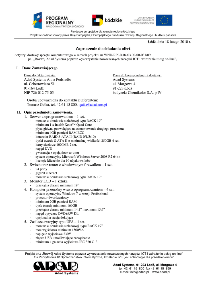 Fundusze europejskie dla rozwoju regionu łódzkiego Projekt współfinansowany przez Uni Europejsk z Europejskiego Funduszu Rozwoju Regionalnego i bud etu pa stwa Łód , dnia 18 lutego 2010 r. Zaproszenie do składania ofert dotyczy: dostawy sprz tu komputerowego w ramach projektu nr WND-RPLD.04.03.00-00-031/09, pn. „Rozwój Adad Systems poprzez wykorzystanie nowoczesnych narz dzi ICT i wdro enie usług on-line”, I. Dane Zamawiaj cego. Dane do fakturowania: Adad Systems Anna Podsiadło ul. Cebertowicza 51 91-164 Łód NIP 726-012-75-05 Dane do korespondencji i dostawy: Adad Systems ul. Morgowa 4 91-223 Łód budynek: Chemikolor S.A. p.IV Osoba upowa niona do kontaktu z Oferentem: Tomasz Gałka, tel. 42 61 15 800, [email protected] II. Opis przedmiotu zamówienia. 1. Serwer z oprogramowaniem – 1 szt. - monta w obudowie stela owej typu RACK 19” minimum 1 x Intel® Xeon™ Quad-Core płyta główna pozwalaj ca na zamontowanie drugiego procesora minimum 4GB pami ci RAM ECC kontroler RAID S-ATA II (RAID 0/1/5/10) dyski twarde S-ATA II o minimalnej wielko ci 250GB 4 szt. karty sieciowe 1000MB 2 szt. nap d DVD gwarancja z opcj door-to-door system operacyjny Microsoft Windows Server 2008 R2 64bit licencje klienckie dla 10 u ytkowników - 24 porty gigabit ethernet monta w obudowie stela owej typu RACK 19” 2. Switch oraz router z wbudowanym firewallem – 1 szt. 3. Monitor LCD – 1 sztuka - przek tna ekranu minimum 19” 4. Komputer przeno ny wraz z oprogramowaniem – 4 szt. - system operacyjny Windows 7 w wersji Professional - procesor dwurdzeniowy - minimum 2GB pami ci RAM - dysk twardy minimum 160GB - przek tna ekranu minimum 14,1” maximum 15,6” - nap d optyczny DVD±RW DL - opcjonalna stacja dokuj ca 5. Zasilacz awaryjny typu UPS – 1 szt. - monta w obudowie stela owej typu RACK 19” moc wyj ciowa minimum 1500VA napi cie wyj ciowe 230V zł cze USB umo liwiaj ce zarz dzanie minimum 4 gniazda wyj ciowe IEC 320 C13 Projekt pn.: „Rozwój Adad Systems poprzez wykorzystanie nowoczesnych narz dzi ICT i wdro enie usług on-line” O Priorytetowa IV Społecze stwo Informatyczne, Działanie IV.3 „e-Technologie dla przedsi biorstw” Adad Systems, 91-223 Łód , ul. Morgowa 4 tel. 42 61 15 800 fax 42 61 15 859 e-mail: [email protected] www.adad.pl 6. Laserowa drukarka kolorowa – 1 szt. - karta sieciowa - wbudowany interfejs Fast Ethernet 10/100 format A4 druk dwustronny (duplex) 7. Instalacja serwera, komputerów, instalacja oprogramowania III. Miejsce i termin składania ofert Termin składania ofert upływa 10.03.2010 r. do godz.24:00. Decyduj ce znaczenie dla oceny zachowania powy szego terminu ma data i godzina wpływu oferty do Zamawiaj cego, a nie data jej wysłania. Oferty nale y składa za po rednictwem poczty elektronicznej na adres wskazany w punkcie „Dane Zamawiaj cego dotycz cym osoby uprawnionej do kontaktu. IV. Opis kryteriów oceny ofert 1. cena i koszty eksploatacji – waga 40% 2. zastosowane technologie i jako wykonania – waga 20% 3. warunki serwisu i gwarancji – waga 40% V. Termin i miejsce wykonania zamówienia Wymagany termin realizacji zamówienia: w ci gu 7 dni roboczych od podpisania umowy. Wykonawca zapewni dostaw towarów w ilo ci zgodnej z zamówieniem. VI. Sposób porozumienia si z wykonawcami oraz przekazania o wiadcze i dokumentów Wszelkiego rodzaju o wiadczenia, wnioski, zawiadomienia, informacje itp. Zamawiaj cy i Oferenci przekazuj za po rednictwem poczty elektronicznej. Dla Zamawiaj cego na adres wskazany w punkcie I. „Dane Zamawiaj cego” jako adres poczty elektronicznej osoby upowa nionej do kontaktu. Dla Oferenta na adres poczty elektronicznej osoby wskazanej w ofercie jako osoba upowa niona do kontaktu. Oferty nale y składa za po rednictwem poczty elektronicznej w formie plików zał czonych do korespondencji. Pliki powinny by zapisane w formacie umo liwiaj cym odczytanie ich tre ci np. pdf. Korespondencj uwa a si za zło on w terminie, je eli jej tre dotarła do Zamawiaj cego przed upływem wyznaczonego terminu i fakt jej otrzymania został niezwłocznie potwierdzony na wskazany adres poczty elektronicznej Oferenta. Informacja o wyniku post powania przetargowego albo o jego zamkni ciu bez dokonania wyboru zamieszczona zostanie na stronie internetowej Adad Systems w sekcji dotycz cej realizacji projektu. VII. Uwagi Oferta powinna: • posiada dat sporz dzenia i dat wa no ci, • zawiera dane Oferenta i wskazan osob upowa nion do kontaktu. Do oferty nale y doł czy projekt umowy dostawy zawieraj cy: • o wiadczenie o pochodzeniu sprz tu z oficjalnego kanału dystrybucji w Polsce, • szczegółow specyfikacj oferowanego sprz tu z cenami netto oraz brutto wyra onymi w PLN, • informacje o warunkach gwarancji i serwisu sprz tu obj tego ofert , • informacje o terminie dostawy i sposobie płatno ci, • informacje o warunkach instalacji przedmiotu zapytania w miejscu wskazanym przez Zamawiaj cego. Dopuszcza si składanie ofert cz ciowych. Zamawiaj cy zastrzega sobie prawo do odwołania lub uniewa nienia przetargu a tak e zmiany jego warunków na ka dym etapie post powania bez podania przyczyn. Do prowadzenia post powania przetargowego nie stosuje si przepisów ustawy – Prawo zamówie publicznych. Anna Podsiadło Projekt pn.: „Rozwój Adad Systems poprzez wykorzystanie nowoczesnych narz dzi ICT i wdro enie usług on-line” O Priorytetowa IV Społecze stwo Informatyczne, Działanie IV.3 „e-Technologie dla przedsi biorstw” Adad Systems, 91-223 Łód , ul. Morgowa 4 tel. 42 61 15 800 fax 42 61 15 859 e-mail: [email protected] www.adad.pl