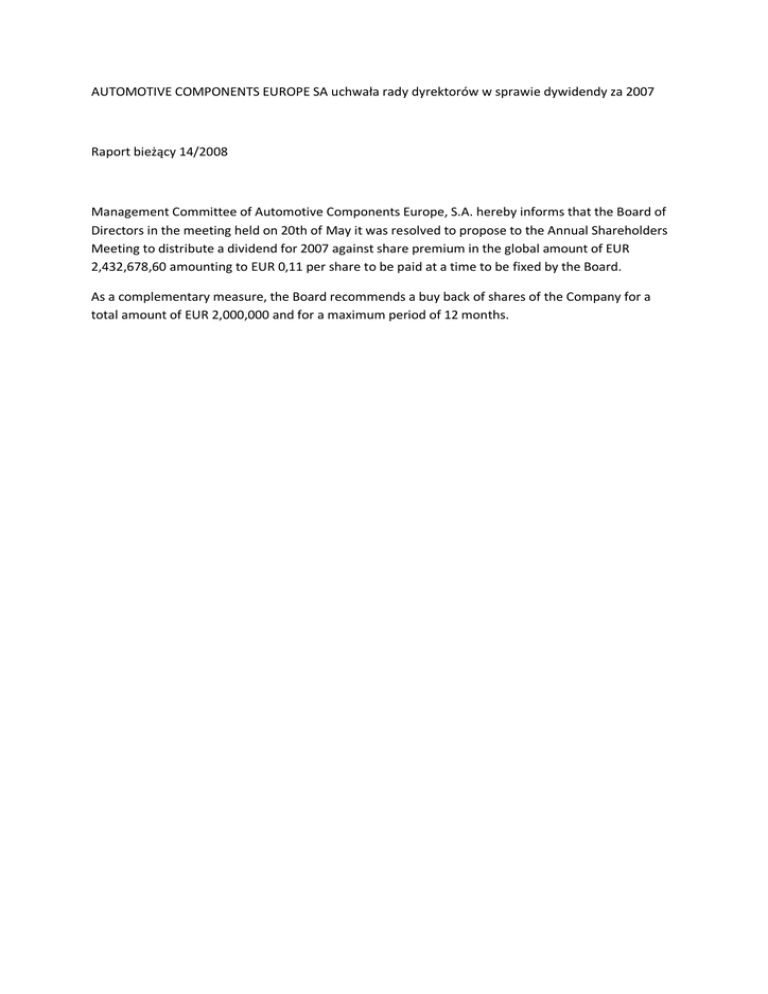 AUTOMOTIVE COMPONENTS EUROPE SA uchwała rady dyrektorów w sprawie dywidendy za 2007 Raport bieżący 14/2008 Management Committee of Automotive Components Europe, S.A. hereby informs that the Board of Directors in the meeting held on 20th of May it was resolved to propose to the Annual Shareholders Meeting to distribute a dividend for 2007 against share premium in the global amount of EUR 2,432,678,60 amounting to EUR 0,11 per share to be paid at a time to be fixed by the Board. As a complementary measure, the Board recommends a buy back of shares of the Company for a total amount of EUR 2,000,000 and for a maximum period of 12 months.