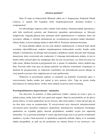 „Ekstaza spadania” Dnia 29 maja na krakowskich Błoniach odbył się V Integracyjny Studencki Piknik Lotniczy w ramach XII Tygodnia Osób Niepełnosprawnych „Kocham Kraków z wzajemnością”. Na odwiedzające imprezę osoby czekało wiele atrakcji. Niemniej jednak największą z nich była moŜliwość przelotu nad Krakowem specjalnie sprowadzonym ze Słowacji śmigłowcem. Nagrodą główną były natomiast skoki spadochronowe w tandemie, które ich zwycięzcy odbędą w terminie późniejszym po wcześniejszym przejściu badań lekarskich. NaleŜy dodać, Ŝe koszt jednego skoku to około 600 zł. WraŜenie natomiast bezcenne. W czasie pikniku odbyły się trzy serie skoków tandemowych, w których brali udział wcześniej zakwalifikowani studenci niepełnosprawni krakowskich uczelni. KaŜda osoba skakała z instruktorem, do którego była przypięta a dodatkowo kaŜdy skoczek miał własnego kamerzystę, który uwieczniał całe wydarzenie. Z własnego doświadczenia dodam, Ŝe jest to bardzo dobry pomysł gdyŜ juŜ następnego dnia nie jest się pewnym, czy skok był jawą czy tylko snem. Miałem bowiem tą przyjemność być w gronie 18 studentów, którzy skakali tego dnia. Pozwolę sobie więc przy tej okazji podzielić się kilkoma wraŜeniami związanymi ze skokiem bo przypuszczam, Ŝe większość czytelników nie doświadczyła jeszcze takiego na swój sposób wyczynu a bez wątpienia jest on wart spróbowania. Właściwie to powinienem napisać, Ŝe postaram się podzielić wraŜeniami gdyŜ w rzeczywistości bardzo trudno jest opisać je przy pomocy słów. Tego po prostu trzeba doświadczyć na własnej skórze. Osoby, które skakały na pewno mnie rozumieją. Prawdopodobieństwo niepowodzenia - minimalne Nie ukrywam, Ŝe pomimo, iŜ lubię podziwiać widoki i patrzeć na świat z góry, to jednak jestem osobą, która lubi czuć grunt pod nogami. Stąd teŜ przychodziły mi do głowy pewne obawy, Ŝe moŜe spadochron się nie otworzy, albo moŜe podrze. Często tak jest gdy ma się zbyt duŜo czasu na zastanawianie. W rzeczywistości przy obecnych zabezpieczeniach uŜywanych przez skoczków (zapasowy spadochron, automatyczny mechanizm otwierający spadochron na wypadek gdyby skoczek przykładowo zemdlał) ryzyko jest naprawdę minimalne. To co przeraŜa poniekąd w czasie tego pierwszego razu to po prostu świadomość spadania z wysoka i brak pewności Ŝe spadochron naprawdę zadziała. Sądzę, Ŝe to normalna ludzka przypadłość, Ŝe jeśli się nie przekonasz na własnej skórze to nie uwierzysz i nie 1 będziesz miał pewności a tej, czy moŜe raczej takiego przekonania, nabywa się po kilku lub nawet kilkunastu skokach – zgodnie z tym co powiedział mi mój instruktor. TuŜ przed skokiem – częściowa dezorientacja Przed skokiem, poza badaniem lekarskim, dwukrotnie przeszliśmy krótkie szkolenie techniczne dotyczące zachowania się w czasie skoku – począwszy do chwili wyskoku aŜ po lądowanie. Powiem szczerze, Ŝe nie było to nic trudnego. Właściwie treść szkolenia zamykała się w kilkunastu zdaniach i polegała na przećwiczeniu ułoŜeń ciała w zaleŜności od fazy skoku. Niemniej jednak niezaleŜnie od tego jak proste byłoby szkolenie to w rzeczywistości gdy stanie się pierwszy raz na krawędzi pokładu śmigłowca czy samolotu, 3 kilometry nad ziemią, słysząc praktycznie sam huk silnika, spoglądając z przynajmniej małym przeraŜeniem na dystans dzielący cię od ziemi to uwierzcie mi, Ŝe wytyczne instruktora dotyczące wyskoku nie są tym tematem, o którym się w tej chwili myśli. A tu dodatkowo przy tobie stoi kamerzysta, który krzyczy do Ciebie abyś się uśmiechnął do obiektywu. Pozytywnym aspektem skoku w tandemie jest właśnie to, Ŝe nawet gdyby nowicjusz się zawahał i chciał zrezygnować w ostatniej chwili, to … ma go kto wypchnąć. Najlepszym rozwiązaniem jest po prostu zaufać instruktorowi i uświadomić sobie w głowie, Ŝe to przykładowo jego tysiąc dwusetny skok (jak było w przypadku mojego instruktora) i Ŝe skoro nic się do tej pory nie stało to jakie jest prawdopodobieństwo, Ŝe coś pójdzie nie tak – praktycznie zerowe. Motywowałem się poza tym jeszcze w jeden sposób. Jeśli bym się rozmyślił to moi kompani (zarówno instruktor jak i kamerzysta) nie byliby zbyt zadowoleni niemoŜnością oddania skoku. Tak po prawdzie to mogli mnie zostawić na pokładzie i oddać skok beze mnie gdybym się rozmyślił, ale wtedy to rozwiązanie nie przyszło mi do głowy – na moje szczęście. Sedno sprawy – czyli to co tygryski lubą najbardziej - spadanie Przechodząc juŜ do samego skoku trzeba jasno powiedzieć, Ŝe jest to ogrom pozytywnych wraŜeń i przypływ niesamowitej energii. Gdy przed skokiem (przynajmniej tym pierwszym) stajesz na krawędzi i spojrzysz na świat z góry ogarnia Cię pewna dezorientacja i teŜ lekkie przeraŜenie bo nie wiesz tak naprawdę co cię czeka. W tej sytuacji na szczęście nie ma czasu to zastanowienia. Raz, dwa i na trzy wyskok. Pierwsze kilka sekund w czasie, których instruktor wykonał ze mną pełny obrót wiąŜe się z dziwnym uczuciem świadomości spadania, które nie kończy się szybkim kontaktem z ziemią, jak to z reguły miało miejsce w przypadku skakania z drzew w czasach mojego dzieciństwa. Byłem bowiem przyzwyczajony do tego, iŜ po sekundzie moŜe dwóch lotu (a raczej spadania) następowało miękkie, a czasem 2 nieco twardsze lądowanie na ziemi. W tym przypadku tak nie było, mimo Ŝe w pewien sposób podświadomie tego oczekiwałem. Te kilka pierwszych sekund pozwoliły mi na uświadomienie sobie, Ŝe ziemi tak szybko nie dotknę i Ŝe juŜ tego nie zmienię. Wkrótce ta dezorientacja zmienia się w zachwyt. MoŜe do dziwnie zabrzmi ale zaczyna się odczuwać przyjemność ze spadania. Patrzysz na zbliŜająca się ziemię i zaczynasz „pochłaniać pozytywną energię”. Zastrzyk adrenaliny jest ogromny. Spada się z prę