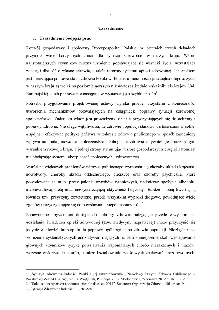 1 Uzasadnienie 1. Uzasadnienie podjęcia prac Rozwój gospodarczy i społeczny Rzeczpospolitej Polskiej w ostatnich trzech dekadach przyniósł wiele korzystnych zmian dla sytuacji zdrowotnej w naszym kraju. Wśród najistotniejszych czynników można wymienić poprawiające się warunki życia, wzrastającą wiedzę i dbałość o własne zdrowie, a także reformy systemu opieki zdrowotnej. Ich efektem jest nieustająca poprawa stanu zdrowia Polaków. Jednak umieralność i przeciętna długość życia w naszym kraju są wciąż na poziomie gorszym niż wynoszą średnie wskaźniki dla krajów Unii Europejskiej, a ich poprawa nie następuje w wystarczająco szybki sposób1. Potrzeba przygotowania projektowanej ustawy wynika przede wszystkim z konieczności utworzenia mechanizmów pozwalających na osiągnięcie poprawy sytuacji zdrowotnej społeczeństwa. Zadaniem władz jest prowadzenie działań przyczyniających się do ochrony i poprawy zdrowia. Nie ulega wątpliwości, że zdrowie populacji stanowi wartość samą w sobie, a spójna i efektywna polityka państwa w zakresie zdrowia publicznego w sposób zasadniczy wpływa na funkcjonowanie społeczeństwa. Dobry stan zdrowia obywateli jest niezbędnym warunkiem rozwoju kraju, z jednej strony stymulując wzrost gospodarczy, z drugiej natomiast nie obciążając systemu ubezpieczeń społecznych i zdrowotnych. Wśród największych problemów zdrowia publicznego wymienia się choroby układu krążenia, nowotwory, choroby układu oddechowego, cukrzycę oraz choroby psychiczne, które powodowane są m.in. przez palenie wyrobów tytoniowych, nadmierne spożycie alkoholu, nieprawidłową dietę oraz niewystarczającą aktywność fizyczną2. Bardzo istotną kwestią są również tzw. przyczyny zewnętrzne, przede wszystkim wypadki drogowe, powodujące wiele zgonów i przyczyniające się do powstawania niepełnosprawności3. Zapewnienie obywatelom dostępu do ochrony zdrowia polegające przede wszystkim na udzielaniu świadczeń opieki zdrowotnej (tzw. medycyny naprawczej) może przyczynić się jedynie w niewielkim stopniu do poprawy ogólnego stanu zdrowia populacji. Niezbędne jest wdrożenie systematycznych oddziaływań mających na celu zmniejszenie skali występowania głównych czynników ryzyka powstawania wspomnianych chorób niezakaźnych i urazów, wczesne wykrywanie chorób, a także kształtowanie właściwych zachowań prozdrowotnych, 1 „Sytuacja zdrowotna ludności Polski i jej uwarunkowania”, Narodowy Instytut Zdrowia Publicznego – Państwowy Zakład Higieny, red. B. Wojtyniak, P. Goryński, B. Moskalewicz, Warszawa 2012 r., str. 11-12. 2 “Global status report on noncommunicable diseases 2014”, Światowa Organizacja Zdrowia, 2014 r. str. 9. 3 „Sytuacja Zdrowotna ludności”…, str. 224. 2 ułatwianie dokonywania właściwych wyborów i kreowanie warunków środowiska (w tym społeczno-ekonomicznego) umożliwiających zachowanie i poprawę zdrowia. Zdrowie publiczne definiuje się jako naukę i sztukę zapobiegania chorobom, wydłużania życia oraz promowania zdrowia fiycznego i sprawności poprzez zorganizowane wysiłki społeczeństwa mające na celu higienizację środowiska, zwalczanie zakażeń występujących w społecznościach, edukację jednostek odnośnie zasad higieny osobistej, organizację świadczeń lekarskich i pielęgniarskich mających na celu wczesną diagnozę oraz profilaktycznie ukierunkowane leczenie oraz rozwój mechanizmów społecznych, które zapewnią każdej jednostce w społeczeństwie standard życia właściwy dla utrzymania zdrowia4. W chwili obecnej można wskazać na bardzo wiele działań wpisujących się w mniejszym lub większym stopniu w obszar zdrowia publicznego. Obecnie obowiązują przepisy posługujące się terminem zdrowie publiczne, w szczególności ustawa z dnia 14 marca 1985 r. o Państwowej Inspekcji Sanitarnej (Dz. U. z 2011 r. Nr 212, poz. 1263, z późn. zm.), czy ustawa z dnia 5 grudnia 2008 r. o zapobieganiu oraz zwalczaniu zakażeń i chorób zakaźnych u ludzi (Dz. U. z 2013 r. poz. 947, z późn. zm) i regulują one znaczny obszar zadań realizowanych na rzecz zdrowia publicznego (zapobieganie oraz zwalczanie zakażeń i chorób zakaźnych u ludzi, nadzór na warunkami higieny środowiska, higieny pracy w zakładach pracy, higieny rekreacji i wypoczynku, nadzór nad jakością wody przeznaczonej do spożycia przez ludzi, jakością zdrowotną żywności i żywienia). Ustawa o zdrowiu publicznym stawia sobie jednak za cel stworzenie systemu prowadzenia spójnej polityki zdrowia publicznego, mając na uwadze wyzwania, jakim kraj rozwinięty musi sprostać w XXI wieku. Sektorowa polityka zdrowotna jest realizowana przez szereg programów polityki zdrowotnej prowadzonych przez Ministra Zdrowia i programów zdrowotnych Narodowego Funduszu Zdrowia, jak również inne działania, np. Program szczepień ochronnych. Wśród programów polityki zdrowotnej na pewno trzeba wymienić Narodowy program zwalczania chorób nowotworowych na lata 2006-2015, Narodowy program wyrównywania dostępności do profilaktyki i leczenia chorób układu sercowo-naczyniowego POLKARD na lata 2013–2016, Program badań przesiewowych noworodków w Polsce na lata 2015–2018, Program profilaktyki raka piersi, czy Program profilaktyki raka szyjki macicy. Wspomniane programy łączą elementy promocji zdrowia z działaniami profilaktycznymi różnej fazy. 4 „Zdrowie publiczne, wybrane zagadnienia”, J. Opolski (red.). Szkoła Zdrowia Publicznego Centrum Medycznego Kształcenia Podyplomowego, Warszawa 2011 r., str. 18. 3 Oczywistym jest fakt, że do zmian zdrowia populacji przyczynia się wiele czynników nieobjętych zakresem działania Ministra Zdrowia. Czynniki środowiskowe – zarówno społeczno-ekonomiczne, jak i te w miejscu pracy, nauki, zamieszkania i rekreacji determinują bardzo istotnie poziom ryzyka powstania wielu chorób. Dużą zasługą innych ministrów jest i