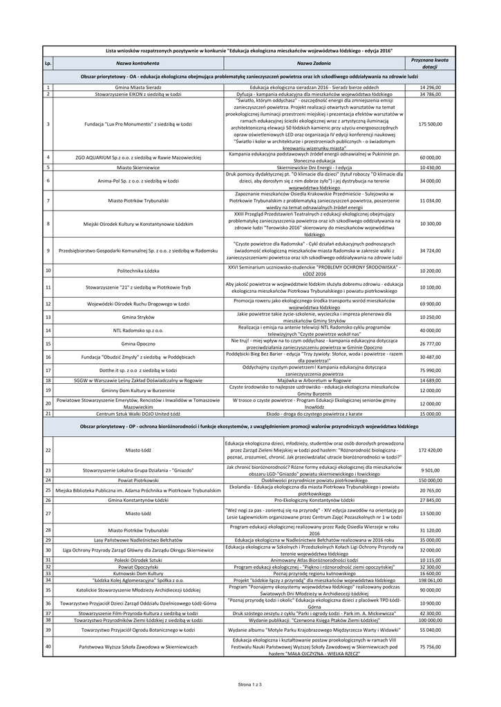 Lista wniosków rozpatrzonych pozytywnie w konkursie "Edukacja ekologiczna mieszkańców województwa łódzkiego - edycja 2016" Lp. Nazwa kontrahenta Nazwa Zadania Przyznana kwota dotacji Obszar priorytetowy - OA - edukacja ekologiczna obejmująca problematykę zanieczyszczeń powietrza oraz ich szkodliwego oddziaływania na zdrowie ludzi 1 2 Gmina Miasta Sieradz Stowarzyszenie EIKON z siedzibą w Łodzi 3 Fundacja "Lux Pro Monumentis" z siedzibą w Łodzi 4 ZGO AQUARIUM Sp.z o.o. z siedzibą w Rawie Mazowieckiej 5 Miasto Skierniewice 6 Anima-Pol Sp. z o.o. z siedzibą w Łodzi 7 Miasto Piotrków Trybunalski 8 Miejski Ośrodek Kultury w Konstantynowie Łódzkim 9 Przedsiębiorstwo Gospodarki Komunalnej Sp. z o.o. z siedzibą w Radomsku "Czyste powietrze dla Radomska" - Cykl działań edukacyjnych podnoszących świadomość ekologiczną mieszkańców miasta Radomska w zakresie walki z zanieczyszczeniami powietrza oraz ich szkodliwego oddziaływania na zdrowie ludzi 34 724,00 10 Politechnika Łódzka XXVI Seminarium uczniowsko-studenckie "PROBLEMY OCHRONY ŚRODOWISKA" ŁÓDŹ 2016 10 200,00 11 Stowarzyszenie "21" z siedzibą w Piotrkowie Tryb Aby jakość powietrza w województwie łódzkim służyła dobremu zdrowiu - edukacja ekologiczna mieszkańców Piotrkowa Trybunalskiego i powiatu piotrkowskiego 10 100,00 12 Wojewódzki Ośrodek Ruchu Drogowego w Łodzi 13 Gmina Stryków 14 NTL Radomsko sp.z o.o. 15 Gmina Opoczno 16 Fundacja "Obudzić Zmysły" z siedzibą w Poddębicach 17 Dotthe.it sp. z o.o z siedzibą w Łodzi 18 SGGW w Warszawie Leśny Zakład Doświadczalny w Rogowie 19 Gminny Dom Kultury w Burzeninie 20 21 Powiatowe Stowarzyszenie Emerytów, Rencistów i Inwalidów w Tomaszowie Mazowieckim Centrum Sztuk Walki DOJO United Łódź Edukacja ekologiczna sieradzan 2016 - Sieradz bierze oddech Dyfuzja - kampania edukacyjna dla mieszkańców województwa łódzkiego "Światło, którym oddychasz" - oszczędność energii dla zmniejszenia emisji zanieczyszczeń powietrza. Projekt realizacji otwartych warsztatów na temat proekologicznej iluminacji przestrzeni miejskiej i prezentacja efektów warsztatów w ramach edukacyjnej ścieżki ekologicznej wraz z artystyczną iluminacją architektoniczną elewacji 50 łódzkich kamienic przy użyciu energooszczędnych opraw oświetleniowych LED oraz organizacja IV edycji konferencji naukowej "Światło i kolor w architekturze i przestrzeniach publicznych - o świadomym kreowaniu wizerunku miasta" Kampania edukacyjna podstawowych źródeł energii odnawialnej w Pukininie pn. Słoneczna edukacja Skierniewickie Dni Energii - I edycja Druk pomocy dydaktycznej pt. "O klimacie dla dzieci" (tytuł roboczy "O klimacie dla dzieci, aby dorosłym się z nim dobrze żyło") i jej dystrybucja na terenie województwa łódzkiego Zapoznanie mieszkańców Osiedla Krakowskie Przedmieście - Sulejowska w Piotrkowie Trybunalskim z problematyką zanieczyszczeń powietrza, poszerzenie wiedzy na temat odnawialnych źródeł energii XXIII Przegląd Przedstawień Teatralnych z edukacji ekologicznej obejmujący problematykę zanieczyszczenia powietrza oraz ich szkodliwego oddziaływania na zdrowie ludzi "Torowisko 2016" skierowany do mieszkańców województwa łódzkiego Promocja roweru jako ekologicznego środka transportu wsród mieszkańców województwa łódzkiego Jakie powietrze takie życie-szkolenie, wycieczka i impreza plenerowa dla mieszkańców Gminy Stryków Realizacja i emisja na antenie telewizji NTL Radomsko cyklu programów telewizyjnych "Czyste powietrze wokół nas" Nie truj! - miej wpływ na to czym oddychasz - kampania edukacyjna dotycząca przeciwdziałania zanieczyszczeniu powietrza w Gminie Opoczno Poddębicki Bieg Bez Barier - edycja "Trzy żywioły: Słońce, woda i powietrze - razem dla powietrza!" Oddychajmy czystym powietrzem! Kampania edukacyjna dotycząca zanieczyszczenia powietrza Majówka w Arboretum w Rogowie Czyste środowisko to najlepsze uzdrowisko - edukacja ekologiczna mieszkańców Gminy Burzenin W trosce o czyste powietrze - Program Edukacji Ekologicznej seniorów gminy Inowłódz Ekodo - droga do czystego powietrza z karate 14 296,00 34 786,00 175 500,00 60 000,00 10 430,00 34 000,00 11 034,00 10 300,00 69 900,00 10 250,00 40 000,00 26 777,00 30 487,00 75 990,00 14 689,00 12 000,00 12 000,00 15 000,00 Obszar priorytetowy - OP - ochrona bioróżnorodności i funkcje ekosystemów, z uwzględnieniem promocji walorów przyrodniczych województwa łódzkiego 22 Miasto Łódź 23 Stowarzyszenie Lokalna Grupa Działania - "Gniazdo" 24 Powiat Piotrkowski 25 Miejska Biblioteka Publiczna im. Adama Próchnika w Piotrkowie Trybunalskim 26 Gmina Konstantynów Łódzki Edukacja ekologiczna dzieci, młodzieży, studentów oraz osób dorosłych prowadzona przez Zarząd Zieleni Miejskiej w Łodzi pod hasłem: "Różnorodność biologiczna poznać, zrozumieć, chronić. Jak przeciwdziałać utracie bioróżnorodności w Łodzi?" Jak chronić bioróżnorodność? Różne formy edukacji ekologicznej dla mieszkańców obszaru LGD-"Gniazdo" powiatu skierniewickiego i łowickiego Osobliwości przyrodnicze powiatu piotrkowskiego Ekolandia - Edukacja ekologiczna dla miasta Piotrkowa Trybunalskiego i powiatu piotrkowskiego Pro-Ekologiczny Konstantynów Łódzki "Weź nogi za pas - zorientuj się na przyrodę" - XIV edycja zawodów na orientację po Lesie Łagiewnickim organizowane przez Centrum Zajęć Pozaszkolnych nr 1 w Łodzi 172 420,00 9 501,00 150 000,00 20 765,00 27 845,00 27 Miasto Łódź 28 Miasto Piotrków Trybunalski 29 Lasy Państwowe Nadleśnictwo Bełchatów 30 Liga Ochrony Przyrody Zarząd Główny dla Zarządu Okręgu Skierniewice 31 32 33 34 Poleski Ośrodek Sztuki Powiat Opoczyński Kutnowski Dom Kultury "Łódzka Kolej Aglomeracyjna" Spółka z o.o. 35 Katolickie Stowarzyszenie Młodzieży Archidiecezji Łódzkiej 36 Towarzystwo Przyjaciół Dzieci Zarząd Oddziału Dzielnicowego Łódź-Górna 37 38 Stowarzyszenie Film-Przyroda-Ku