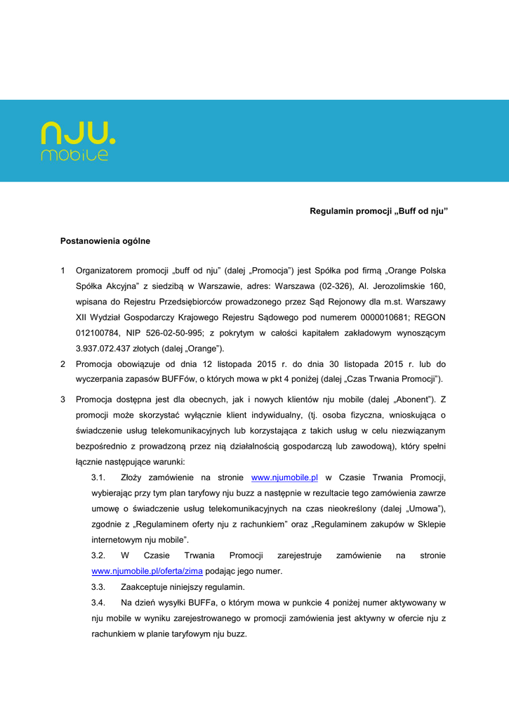 Regulamin promocji „Buff od nju” Postanowienia ogólne 1 Organizatorem promocji „buff od nju” (dalej „Promocja”) jest Spółka pod firmą „Orange Polska Spółka Akcyjna” z siedzibą w Warszawie, adres: Warszawa (02-326), Al. Jerozolimskie 160, wpisana do Rejestru Przedsiębiorców prowadzonego przez Sąd Rejonowy dla m.st. Warszawy XII Wydział Gospodarczy Krajowego Rejestru Sądowego pod numerem 0000010681; REGON 012100784, NIP 526-02-50-995; z pokrytym w całości kapitałem zakładowym wynoszącym 3.937.072.437 złotych (dalej „Orange”). 2 Promocja obowiązuje od dnia 12 listopada 2015 r. do dnia 30 listopada 2015 r. lub do wyczerpania zapasów BUFFów, o których mowa w pkt 4 poniżej (dalej „Czas Trwania Promocji”). 3 Promocja dostępna jest dla obecnych, jak i nowych klientów nju mobile (dalej „Abonent”). Z promocji może skorzystać wyłącznie klient indywidualny, (tj. osoba fizyczna, wnioskująca o świadczenie usług telekomunikacyjnych lub korzystająca z takich usług w celu niezwiązanym bezpośrednio z prowadzoną przez nią działalnością gospodarczą lub zawodową), który spełni łącznie następujące warunki: 3.1. Złoży zamówienie na stronie www.njumobile.pl w Czasie Trwania Promocji, wybierając przy tym plan taryfowy nju buzz a następnie w rezultacie tego zamówienia zawrze umowę o świadczenie usług telekomunikacyjnych na czas nieokreślony (dalej „Umowa”), zgodnie z „Regulaminem oferty nju z rachunkiem” oraz „Regulaminem zakupów w Sklepie internetowym nju mobile”. 3.2. W Czasie Trwania Promocji zarejestruje zamówienie na stronie www.njumobile.pl/oferta/zima podając jego numer. 3.3. Zaakceptuje niniejszy regulamin. 3.4. Na dzień wysyłki BUFFa, o którym mowa w punkcie 4 poniżej numer aktywowany w nju mobile w wyniku zarejestrowanego w promocji zamówienia jest aktywny w ofercie nju z rachunkiem w planie taryfowym nju buzz. Przedmiot Promocji 4. Abonent w ramach Promocji, po spełnieniu warunków, o których mowa w pkt. 3 powyżej otrzyma chustę wielofunkcyjną firmy BUFF® (dalej: Buff) w barwach i z logo nju mobile. 5. Buff zostanie przesłany Abonentowi za pośrednictwem kuriera firmy DPD na adres dostawy podany w zamówieniu na nju z rachunkiem po upływie jednego pełnego okresu rozliczeniowego licząc od momentu rozpoczęcia świadczenia usług w taryfie nju buzz. 6. Do procedury składania i realizowania zamówień w sklepie internetowym nju mobile stosuje się „Regulamin zakupów w Sklepie Internetowym nju mobile” dostępny pod adresem: http://www.njumobile.pl/b/articles/regulaminy/Regulamin-Sklepu-Internetowego.pdf 7. Każdy Abonent może skorzystać z Promocji maksymalnie 1 (słownie: jeden) raz. To oznacza, że w ramach Promocji może złożyć maksymalnie 1 zamówienie. Każde kolejne zamówienie mimo spełnienia warunków opisanych w pkt 4 nie będzie objęte Promocją. 8. W celu uniknięcia wszelkich wątpliwości Orange wskazuje, iż przy zawarciu umowy o świadczenie usług telekomunikacyjnych w ofercie innej niż nju z rachunkiem, Abonent nie ma możliwości otrzymania Buffa. 9. Promocja nie łączy się z innymi promocjami nju mobile, które umożliwiają otrzymanie kolejnego gadżetu/prezentu/kodu niewchodzącego w zakres umowy o świadczenie usług telekomunikacyjnych. Skorzystanie z Promocji nie wyklucza możliwości wzięcia udziału konkursie „zimowy zjazd” trwającym w tym samym czasie co niniejsza Promocja Postanowienia końcowe 10. Reklamacje dotyczące Promocji powinny być kierowane: 10.1. na piśmie pod adres: Orange Polska S.A., ul. Jagiellońska 34, 96-100 Skierniewice, o tytule „Reklamacja - Promocja Buff od nju” lub 10.2. mailowo do Orange na adres [email protected] z dopiskiem zamieszczonym w temacie wiadomości email „Reklamacja – Buff od nju”. 11. Reklamacje dotyczące Promocji można składać w okresie jej trwania oraz maksymalnie 60 dni od daty jej zakończenia. Reklamacje będą rozpatrywane w terminie 30 (trzydziestu) dni od dnia ich zgłoszenia. Za dzień wniesienia reklamacji uważa się datę stempla pocztowego (gdy reklamacja jest wnoszona drogą pocztową) lub datę wpływu reklamacji na skrzynkę mailową Organizatora (gdy reklamacja jest wnoszona drogą elektroniczną). W braku odmiennych wskazań ze strony Abonenta odpowiedzi na reklamacje będą kierowane tym samym kanałem komunikacji, jakim została złożona dana reklamacja na adres zwrotny podany przez Abonenta w przesyłanej przez tego Abonenta reklamacji. Reklamacje, które wpłyną po terminie określonym w niniejszym punkcie lub zostaną wysłane na inny adres niż podany pkt. 10 nie będą rozpatrywane. Tryb postępowania reklamacyjnego dotyczącego zawarcia Umowy, określa Umowa. 12. Koszty związane z dostarczeniem przesyłki do Abonenta ponosi Organizator. W zakresie nieuregulowanym niniejszym regulaminem, a dotyczącym korzystania z usług telekomunikacyjnych nju mobile zastosowanie mają postanowienia aktualnego na dzień zawarcia Umowy „Regulaminu promocji w ofercie nju z rachunkiem”, „Cennika usług w ofercie nju z rachunkiem” oraz „Regulaminu zakupów w sklepie internetowym nju mobile” dostępnych na stronie www.njumobile.pl. 13. Regulamin Promocji dostępny jest na stronie www.njumobile.pl/oferta/zima oraz w siedzibie Organizatora. 14. Organizator zastrzega sobie prawo do zmian zasad Promocji oraz Regulaminu z zastrzeżeniem, że nie naruszą one praw nabytych osób uczestniczących w Promocji. 15. Administratorem danych osobowych jest Orange Polska S.A. z siedzibą i adresem w Warszawie, przy Alejach Jerozolimskich 160. Abonent wyraża zgodę na ich przetwarzanie i przyjmuje do wiadomości, że podanie danych osobowych jest dobrowolne, jednak niezbędne dla celów związanych z realizacją Promocji. Każdemu Abonentowi przysługuje prawo wglądu w swoje dane i ich poprawiania.