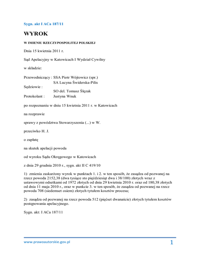 Sygn. akt I ACa 187/11 WYROK W IMIENIU RZECZYPOSPOLITEJ POLSKIEJ Dnia 15 kwietnia 2011 r. Sąd Apelacyjny w Katowicach I Wydział Cywilny w składzie: Przewodniczący : SSA Piotr Wójtowicz (spr.) SA Lucyna Świderska-Pilis Sędziowie : SO del. Tomasz Ślęzak Protokolant : Justyna Wnuk po rozpoznaniu w dniu 15 kwietnia 2011 r. w Katowicach na rozprawie sprawy z powództwa Stowarzyszenia (...) w W. przeciwko H. J. o zapłatę na skutek apelacji powoda od wyroku Sądu Okręgowego w Katowicach z dnia 29 grudnia 2010 r., sygn. akt II C 419/10 1) zmienia zaskarżony wyrok w punktach 1. i 2. w ten sposób, że zasądza od pozwanej na rzecz powoda 2152,38 (dwa tysiące sto pięćdziesiąt dwa i 38/100) złotych wraz z ustawowymi odsetkami od 1972 złotych od dnia 29 kwietnia 2010 r. oraz od 180,38 złotych od dnia 11 maja 2010 r., oraz w punkcie 3. w ten sposób, że zasądza od pozwanej na rzecz powoda 708 (siedemset osiem) złotych tytułem kosztów procesu; 2) zasądza od pozwanej na rzecz powoda 512 (pięćset dwanaście) złotych tytułem kosztów postępowania apelacyjnego. Sygn. akt: I ACa 187/11 www.prawoautorskie.gov.pl 1 UZASADNIENIE Powód wniósł o zasądzenie na jego rzecz od pozwanej 2152,38 zł z odsetkami od 1972,-zł od 29 kwietnia 2010 r. oraz od 180,38,-zł od dnia wytoczenia powództwa do dnia zapłaty z tym uzasadnieniem, że w ramach swej działalności pozwana wykorzystuje utwory objęte ochroną prawa autorskiego, że na mocy umowy licencyjnej zobowiązała się ona płacić co miesiąc 116,-zł z tytułu publicznego odtwarzania utworów i że nie uregulowała wynikających z umowy należności za okres od 1 listopada 2008 r. do 31 marca 2010 r. W sprzeciwie od wydanego w dniu 25 maja 2010 r. nakazu zapłaty pozwana wniosła o oddalenie powództwa i zarzuciła, że w prowadzonej działalności nie wykorzystuje utworów objętych ochroną prawa autorskiego oraz że umowa spółki, w ramach której zawarto umowę, została rozwiązana. Podniosła też zarzut braku swej legitymacji procesowej oraz zarzut nieprawidłowego przeprowadzenia kontroli przez inspektorów powoda. Zaskarżonym wyrokiem Sąd Okręgowy zasądził od pozwanej na rzecz powoda 930,01 zł z ustawowymi odsetkami od 812,-zł od 29 kwietnia 2010 r. i od 118,01 zł od 11 maja 2010 r., w pozostałej zaś części powództwo oddalił oraz orzekł o kosztach i przytoczył następujące motywy swego rozstrzygnięcia: Dnia 14 stycznia 2007 r. między powodem a spółką cywilną pod nazwą „(...)”, której wspólnikami były R. M. i pozwana, została zawarta, podpisana przez pozwaną, umowa licencyjna na publiczne odtwarzanie utworów. W umowie spółka cywilna zobowiązała się przekazywać na rzecz powoda zryczałtowane wynagrodzenie autorskie w wysokości 116,-zł do dnia 15 każdego miesiąca. Do końca października 2008 r. spółka należne opłaty uiszczała. Spółka cywilna została rozwiązana w październiku 2008 r. Wspólnicy zgłosili do urzędu skarbowego zaprzestanie działalności gospodarczej z dniem 31 października 2008 r., a pismem z 1 czerwca 2009 r. pozwana poinformowała powoda, że spółka została rozwiązana w październiku 2008r., i przy piśmie z 2 lipca 2009 r. przesłała mu kopię zgłoszenia o zaprzestaniu działalności. Pozwana prowadzi w tym samym lokalu gastronomicznym, co wcześniej spółka cywilna, działalność pod firmą „(...)” w L.; działalność ta stanowi kontynuację działalności spółki cywilnej. Lokal składa się z trzech sal; w każdej zainstalowane są kolumny głośnikowe. W lokalu zainstalowany jest wzmacniacz marki D. i odtwarzacz CD marki M.. Odtwarzana z płyt chorwackich muzyka jest dobrze słyszalna przez potencjalnych klientów. Zgodnie z art. 17 ustawy z dnia 4 lutego 1994 o prawie autorskim i prawach pokrewnych podmiotem prawa autorskiego jest twórca i tylko jemu służy prawo do korzystania z utworu i rozporządzania nim na wszystkich polach eksploatacji oraz do wynagrodzenia za korzystanie z utworu. Art. 79 ustawy przewiduje, że w przypadku naruszenia prawa twórcy, stosownym wynagrodzeniem będzie takie, które autor otrzymałby, gdyby osoba naruszająca jego prawa zawarła umowę o korzystanie w zakresie dokonanego naruszenia. Bez zezwolenia twórcy wolno korzystać z jego utworu już rozpowszechnionego w zakresie własnego użytku osobistego. www.prawoautorskie.gov.pl 2 Art. 24 ust. 2 ustawy stanowi, że posiadacze urządzeń służących do odbioru programu radiowego lub telewizyjnego mogą za ich pomocą odbierać nadawane utwory, choćby urządzenia te były umieszczone w miejscu ogólnie dostępnym, jeżeli nie łączy się z tym osiąganie korzyści majątkowych. Uregulowanie to wprowadza ograniczenie prawa twórcy do wynagrodzenia. Podmiot uprawniony powinien zawsze partycypować w korzyściach, jakie inne osoby uzyskują z rozpowszechniania jego utworu, nawet jeśli są to korzyści pośrednie. W niniejszej sprawie pozwana kwestionowała swoją legitymację procesową. Podzielić należy jej stanowisko, że umowa licencyjna zawarta została przez powoda ze spółką cywilną „(...)”, a nie z nią jako osobą fizyczną prowadzącą działalność gospodarczą pod firmą „(...)”. Okoliczność, iż po rozwiązaniu spółki cywilnej kontynuowała ona działalność gospodarczą pod tą samą nazwą, w tym samym lokalu i o takim samym charakterze, nie ma znaczenia dla jej odpowiedzialności. W okresie objętym żądaniem pozwu H. J., jako osoba fizyczna prowadząca działalność na podstawie wpisu do ewidencji, nie była stroną umowy licencyjnej, powód zatem nie może domagać się od niej z tego tytułu należności. Jako wspólnik dawnej spółki cywilnej odpowiadać może jedynie za zobowiązania tej spółki. Od 1 listopada 2008 r. spółka cywilna już nie istniała. Nie oznacza to jednak, że pozwana w ogóle nie ponosi odpowiedzialności. Zgodnie z §9 umowy licencjobiorca zobowiązany był zawiadomić (...) o