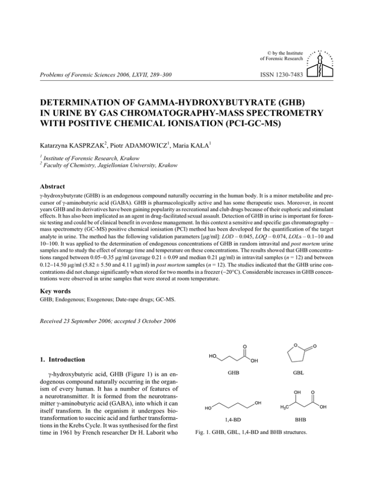 © by the Institute of Forensic Research ISSN 1230-7483 Problems of Forensic Sciences 2006, LXVII, 289–300 DETERMINATION OF GAMMA-HYDROXYBUTYRATE (GHB) IN URINE BY GAS CHROMATOGRAPHY-MASS SPECTROMETRY WITH POSITIVE CHEMICAL IONISATION (PCI-GC-MS) Katarzyna KASPRZAK2, Piotr ADAMOWICZ1, Maria KA£A1 1 2 Institute of Forensic Research, Krakow Faculty of Chemistry, Jagiellonian University, Krakow Abstract g-hydroxybutyrate (GHB) is an endogenous compound naturally occurring in the human body. It is a minor metabolite and precursor of g-aminobutyric acid (GABA). GHB is pharmacologically active and has some therapeutic uses. Moreover, in recent years GHB and its derivatives have been gaining popularity as recreational and club drugs because of their euphoric and stimulant effects. It has also been implicated as an agent in drug-facilitated sexual assault. Detection of GHB in urine is important for forensic testing and could be of clinical benefit in overdose management. In this context a sensitive and specific gas chromatography – mass spectrometry (GC-MS) positive chemical ionisation (PCI) method has been developed for the quantification of the target analyte in urine. The method has the following validation parameters [mg/ml]: LOD – 0.045, LOQ – 0.074, LOLs – 0.1-10 and 10-100. It was applied to the determination of endogenous concentrations of GHB in random intravital and post mortem urine samples and to study the effect of storage time and temperature on these concentrations. The results showed that GHB concentrations ranged between 0.05-0.35 mg/ml (average 0.21 ± 0.09 and median 0.21 mg/ml) in intravital samples (n = 12) and between 0.12-14.50 mg/ml (5.82 ± 5.50 and 4.11 mg/ml) in post mortem samples (n = 12). The studies indicated that the GHB urine concentrations did not change significantly when stored for two months in a freezer (-20°C). Considerable increases in GHB concentrations were observed in urine samples that were stored at room temperature. Key words GHB; Endogenous; Exogenous; Date-rape drugs; GC-MS. Received 23 September 2006; accepted 3 October 2006 1. Introduction g-hydroxybutyric acid, GHB (Figure 1) is an endogenous compound naturally occurring in the organism of every human. It has a number of features of a neurotransmitter. It is formed from the neurotransmitter g-aminobutyric acid (GABA), into which it can itself transform. In the organism it undergoes biotransformation to succinic acid and further transformations in the Krebs Cycle. It was synthesised for the first time in 1961 by French researcher Dr H. Laborit who Fig. 1. GHB, GBL, 1,4-BD and BHB structures. 290 K. Kasprzak, P. Adamowicz, M. Ka³a was investigating the effects caused by GABA in the brain [28]. In the beginning, GHB was used for medical purposes as an anaesthetic agent. Because of side effects, its use was limited to treatment of narcolepsy (United States) and alcohol abuse (Italy) [15]. In some youth circles it is propagated and sold as a substitute for anabolic steroids, supposed to increase muscle mass, and in others, contrarily, it is recommended as a natural product causing reduction of body weight. GHB is also promoted as an agent for insomnia treatment, preventing ageing, going bald, improving mood, eliminating anxiety and depression, increasing sexual efficiency [5, 20]. Since the nineties of the twentieth century GHB abuse for recreational purposes as a club drug – in order to induce a state of intoxication – has risen dramatically. GHB and its analogues (and at the same time precursors), i.e. g-hydroxybutyrolactone (GBL) and 1,4-butanediol (1,4-BD) also belong to the group of date-rape drugs that are used to facilitate sexual assault. Sexual assaults are committed when the victim is under the influence of the drug, taken intentionally or unknowingly. In the latter case, the substance is usually added unnoticed into the drink of a potential victim. Effects caused by these drugs are, among other things, loss of consciousness, amnesia and reduced psychological inhibition. The fact that the course of the incident is remembered unclearly results in victims of rapes most frequently reporting to the police only after a long period has elapsed. Due to the natural presence of GHB in the organism, rapid elimination of the administered dose (it is detected up to 8 hours in the blood and up to 12 hours in the urine), and lapse of a time from consumption, it is often practically impossible to prove use of GHB as a date-rape drug [1, 2, 3]. The critical issue is establishing the limit of endogenous GHB concentrations in biological material. While some researchers cite insignificant levels – about 0.1 mg/ml in plasma and about 2.5 mg/ml in urine – materials collected from living persons [28], others publish values of 2-3 mg/ml for blood and 5-6 mg/ml for urine [11], and even propose a limit of concentration of 10 mg/ml in urine [20]. Acceptance of a such value for the threshold of concentration differentiating between GHB of exogenous and endogenous origin meant that after a single therapeutic dose (50 mg/kg) in 12.5%, 81.3% and 100% of urine samples collected in the following time ranges: 3-6 h, 6-12 h and 12-24 h, respectively, the concentration of this compound was below the proposed limit [15]. After consumption of higher doses, up to 7 g (~100 mg/kg), its concentration in blood and urine reaches values that are hard to interpret after 8 and 12 h [5]. From numerous data obtained from the literature [5, 8, 10, 13, 17, 29] it transpires that, according to current knowledge, establishment of an unambiguous threshold value is still open to discussion. Values of GHB concentrations in biological material change and depend on many factors. The influence of sex, race, age, health conditions, treatment [20] and diet, and especially drinking of alcohol and smoking tobacco [23, 24], and lowered pH of urine on concentration of endogenous GHB in body fluids was studied intravitally. A large 