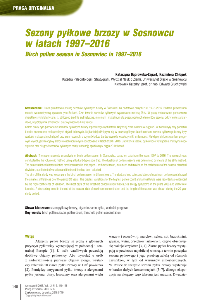 PRACA ORYGINALNA Sezony pyłkowe brzozy w Sosnowcu w latach 1997–2016 Birch pollen season in Sosnowiec in 1997–2016 Katarzyna Dąbrowska-Zapart, Kazimiera Chłopek Katedra Paleontologii i Stratygrafii, Wydział Nauk o Ziemi, Uniwersytet Śląski w Sosnowcu Kierownik Katedry: prof. dr hab. Edward Głuchowski Streszczenie: Praca przedstawia analizę sezonów pyłkowych brzozy w Sosnowcu na podstawie danych z lat 1997–2016. Badania prowadzono metodą wolumetryczną aparatem typu Burkard. Czas trwania sezonów pyłkowych wyznaczono metodą 98%. W pracy zastosowano podstawowe charakterystyki statystyczne, tj. obliczono średnią arytmetyczną, minimum i maksimum dla poszczególnych elementów sezonu, odchylenie standardowe, współczynnik zmienności oraz wyznaczono linię trendu. Celem pracy było porównanie sezonów pyłkowych brzozy w poszczególnych latach. Najmniej zróżnicowane w ciągu 20 lat badań były daty początku i końca sezonu oraz maksymalnych stężeń dobowych. Najbardziej różniącymi się w poszczególnych latach cechami sezonu pyłkowego brzozy były wartości maksymalnych stężeń oraz sum rocznych, o czym świadczą bardzo wysokie współczynniki zmienności. Najwięcej dni ze stężeniem progowym wywołującym objawy alergii u osób uczulonych odnotowano w latach 2008 i 2016. Daty końca sezonu pyłkowego i wystąpienia maksymalnego stężenia oraz długość sezonów pyłkowych miały tendencję spadkową w ciągu 20 lat badań. Abstract: The paper presents an analysis of birch pollen season in Sosnowiec, based on data from the years 1997 to 2016. The research was conducted by the volumetric method using a Burkard-type spore trap. The duration of pollen seasons was determined by means of the 98% method. The basic statistical characteristics have been used in this paper – arithmetic mean, minimum and maximum for each feature of the season, standard deviation, coefficient of variation and the trend line has been selected. The aim of this study was to compare the birch pollen season in different years. The start and end dates and dates of maximum pollen count showed the smallest differences over the period 20 years. The greatest variations for the highest pollen count and annual totals were recorded as evidenced by the high coefficients of variation. The most days of the threshold concentration that causes allergy symptoms in the years 2008 and 2016 were founded. A decreasing trend in the end of the season, date of maximum concentration and the length of the season was shown during the 20-year study period. Słowa kluczowe: sezon pyłkowy brzozy, stężenie ziaren pyłku, wartości progowe Key words: birch pollen season, pollen count, threshold pollen concentration Wstęp Alergeny pyłku brzozy są jedną z głównych przyczyn pyłkowicy występującej w północnej i centralnej Europie [1]. U osób wrażliwych powodują dotkliwe objawy pyłkowicy. Aby wywołać u osób z nadwrażliwością pierwsze objawy alergii, wystarczy zaledwie 20 ziaren pyłku brzozy w 1 m3 powietrza [2]. Pomiędzy antygenami pyłku brzozy a alergenami pyłku jesionu, olszy, leszczyny oraz alergenami wielu 140 Alergoprofil 2016, Vol. 12, Nr 3, 140-146 Pracę otrzymano: 2016.07.12 Zaakceptowano do druku: 2016.07.19 “Copyright by Medical Education” warzyw i owoców, tj. marchwi, selera, soi, brzoskwini, gruszki, wiśni, orzechów laskowych, często obserwuje się reakcje krzyżowe [3, 4]. Ziarna pyłku brzozy występują w powietrzu najobficiej wiosną, a termin początku sezonu pyłkowego i jego przebieg zależą od różnych czynników, w tym od warunków atmosferycznych. W Polsce w szczycie sezonu pyłek brzozy występuje w bardzo dużych koncentracjach [5–7], dlatego ekspozycja na alergeny tego taksonu jest znaczna. Dwudzie- PRACA ORYGINALNA stoletnia seria pomiarów aerobiologicznych w Sosnowcu potwierdziła ten fakt, co oznacza, że rokrocznie jesteśmy narażeni na wysokie stężenia pyłku brzozy. Cel pracy Cele niniejszego opracowania stanowią analiza przebiegu sezonów pyłkowych brzozy w latach 1997– 2016 w Sosnowcu oraz porównanie sum rocznych i wartości maksymalnych stężeń ziaren pyłku, ze szczególnym uwzględnieniem wartości progowych. Materiał i metody Koncentracje ziaren pyłku brzozy były analizowane na podstawie danych uzyskanych w Sosnowcu w latach 1997–2016. Pomiary aerobiologiczne wykonano metodą wolumetryczną z użyciem aparatu typu Burkard. Aparat zlokalizowany jest na wysokości ok. 20 m na terenie zabudowań Wydziału Nauk o Ziemi Uniwersytetu Śląskiego. Sezony pyłkowe zostały wyznaczone metodą 98%. W charakterystyce sezonu określono następujące parametry: daty początku i końca, długość, całkowitą liczbę ziaren pyłku, maksymalne stężenie dobowe, datę wystąpienia najwyższego stężenia oraz liczbę dni, w których stężenie przekraczało wartości progowe (20, 75, 90 i 155 ziaren/m3) [2]. W celu prześledzenia różnic w przebiegu sezonów pyłkowych w badanych latach zastosowano statystyki opisowe, takie jak: średnia arytmetyczna, minimum i maksimum liczby ziaren pyłku, odchylenie standardowe, współczynnik zmienności. Dla każdej cechy sezonu pyłkowego oceniono zmienność przy zastosowaniu regresji prostej. Do powyższych analiz wykorzystano programy MS Excel i Statistica (wersja 6). W celu analizy poszczególnych zmiennych za pomocą podstawowych miar statystyki opisowej daty dzienne poszczególnych charakterystyk sezonów pyłkowych zastąpiono liczbą dni, która upłynęła od początku roku. Do oceny współczynnika zmienności (V) zastosowano interpretację: V < 20% – mała zmienność, 20% < V < 40% – przeciętna zmienność, 40% < V < 100% – duża zmienność. Wyniki W ciągu 20 lat badań obserwowano znaczne różnice w charakterystykach sezonów pyłkowych brzozy (tab. 1). Zdecydowanie najmniej zróżnicowane były daty początku sezonu pyłkowego, co potwierdza niski współczynnik zmienności