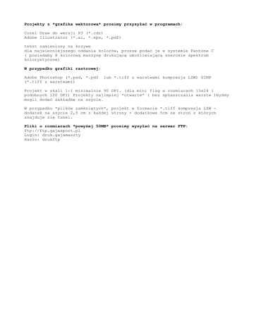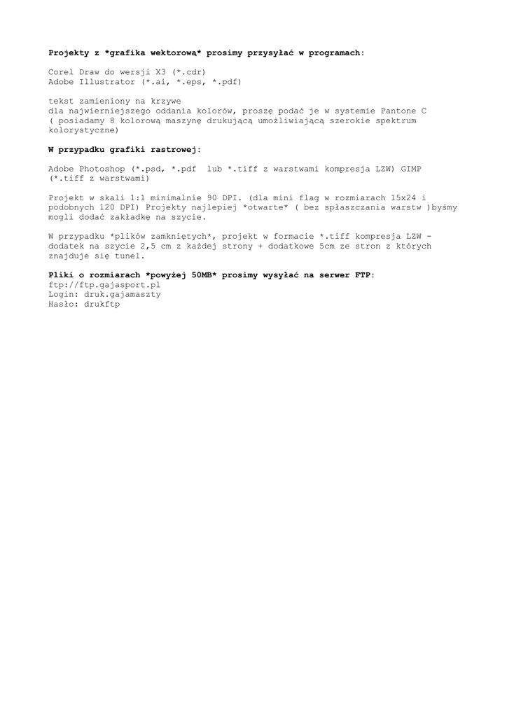 Projekty z *grafika wektorową* prosimy przysyłać w programach: Corel Draw do wersji X3 (*.cdr) Adobe Illustrator (*.ai, *.eps, *.pdf) tekst zamieniony na krzywe dla najwierniejszego oddania kolorów, proszę podać je w systemie Pantone C ( posiadamy 8 kolorową maszynę drukującą umożliwiającą szerokie spektrum kolorystyczne) W przypadku grafiki rastrowej: Adobe Photoshop (*.psd, *.pdf (*.tiff z warstwami) lub *.tiff z warstwami kompresja LZW) GIMP Projekt w skali 1:1 minimalnie 90 DPI. (dla mini flag w rozmiarach 15x24 i podobnych 120 DPI) Projekty najlepiej *otwarte* ( bez spłaszczania warstw )byśmy mogli dodać zakładkę na szycie. W przypadku *plików zamkniętych*, projekt w formacie *.tiff kompresja LZW dodatek na szycie 2,5 cm z każdej strony + dodatkowe 5cm ze stron z których znajduje się tunel. Pliki o rozmiarach *powyżej 50MB* prosimy wysyłać na serwer FTP: ftp://ftp.gajasport.pl Login: druk.gajamaszty Hasło: drukftp