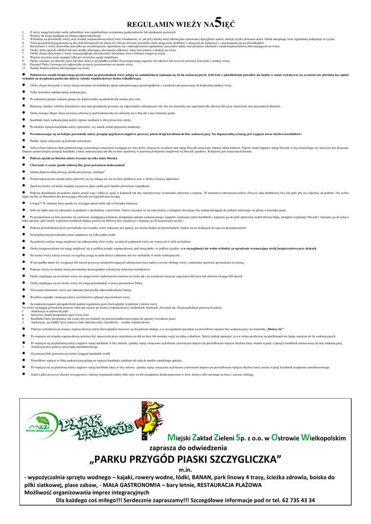 5 REGULAMIN WIEŻY NA IĘĆ 1. 2. 3. 4. 5. 6. 7. 8. 9. 10. 11. Z wieży mogą korzystać osoby pełnoletnie oraz niepełnoletnie za pisemną zgodą rodziców lub opiekunów prawnych. Wejście na wieżę następuje na własną odpowiedzialność. Wchodząc na przeszkody wieży oraz ściankę wspinaczkową należy mieć świadomość, iż jak przy każdej innej rekreacyjnie uprawianej dyscyplinie sportu, istnieje ryzyko doznania urazu. Osoba akceptując treść regulaminu podejmuje to ryzyko. Trasa przeszkód przygotowana są dla osób mierzących nie mniej niż 160 cm wzrostu, pozostałe osoby mogą mieć problemy z wpięciem do asekuracji i z poruszaniem się po przeszkodach. Korzystanie z wieży dozwolone jest tylko po wcześniejszym zapoznaniu się i zaakceptowaniu regulaminu, uiszczeniu opłaty oraz przejściu szkolenia z zasad bezpieczeństwa obowiązujących na wieży. Osoby, które spożyły alkohol lub inne środki odurzające obowiązuje całkowity zakaz korzystania z atrakcji na wieży. Osoby chcące skorzystać z wieży muszą podpisać oświadczenie, otrzymane wraz z biletem wstępu na wieżę. Wejście na wieżę może nastąpić tylko po wyrażeniu zgody instruktora. Osoby cierpiące na choroby serca lub inne, które w przypadku wysiłku fizycznego mogą zagrażać ich zdrowiu lub życiu nie powinny korzystać z atrakcji wieży. Personel Parku Linowego nie odpowiada za rzeczy pozostawione na terenie wieży. Zasady bezpieczeństwa obowiązujące na wieży: Podstawowa zasada bezpiecznego przebywania na przeszkodach wieży polega na samodzielnym wpinaniu się do lin asekuracyjnych. Jeśli ktoś z jakichkolwiek powodów nie będzie w stanie wykonywać tej czynności nie powinien bez opieki wchodzić na urządzenia parku (nie dotyczy ścianki wspinaczkowej i skoku wahadłowego). Osoby chcące korzystać z wieży muszą otrzymać od instruktora sprzęt zabezpieczający przed upadkiem z wysokości przystosowany do konkretnej atrakcji wieży. Tylko instruktor zakłada sprzęt asekuracyjny. Po założeniu sprzętu asekuracyjnego nie dopuszczalne są jakiekolwiek zmiany przy nim. Biżuterię, okulary, telefony komórkowe oraz inne przedmioty powinno się odpowiednio zabezpieczyć tak, aby nie stwarzały one zagrożenia dla zdrowia lub życia właściciela oraz pozostałych klientów. Osoby noszące długie włosy powinny schować je pod kaskiem aby nie wkręciły się w bloczki i inne elementy parku. Karabinki lonży asekuracyjnej należy wpinać zamkami w dwie przeciwne strony. Po każdym wpięciu karabinka należy sprawdzić, czy zamek został poprawnie zamknięty. Przemieszczając się na kolejne przeszkody należy przepiąć pojedynczo najpierw pierwszy potem drugi karabinek do liny asekuracyjnej. Nie dopuszczalną sytuacją jest wypięcie naraz obydwu karabinków! Punkty wpięć oznaczone są kolorem czerwonym. Jeśli na linie stalowej obok podstawowego czerwonego oznaczenia występuje też inny kolor oznacza to, że należy tam wpiąć bloczek oznaczony właśnie takim kolorem. Należy wtedy najpierw wpiąć bloczek w linę, kontrolując czy lonża nie jest skręcona. Dopiero potem kolejno przepiąć karabinki z lonży asekuracyjnej tak aby na linie zjazdowej w pierwszej kolejności znajdował się bloczek zjazdowy. Kolejność jest oznaczona kolorami. Podczas zjazdu na bloczku należy trzymać się tylko lonży bloczka. Chwytanie w czasie zjazdu stalowej liny grozi poważnym skaleczeniem! Jedyną dopuszczalną pozycją zjazdu jest pozycja „siedząca”. Przed rozpoczęciem zjazdu należy upewnić się czy nikogo nie ma na linie zjazdowej oraz w okolicy miejsca lądowania. Zjazd na tyrolce, na której znajduje się jeszcze jakaś osoba grozi bardzo poważnym wypadkiem. Podczas dojeżdżania do podestu należy unieść nogi i lekko je zgiąć w kolanach tak aby zamortyzować ewentualne uderzenie o materac. W momencie zatrzymania należy chwycić ręką dodatkowej liny lub pętli aby nie odjechać od podestu. Nie wolno łapać się liny za bloczkiem aby powracający bloczek nie najechał nam na rękę. Uwaga!!! W ostatniej fazie zjazdu nie wyciągać przed siebie rąk w kierunku materaca. Jeśli nie udało nam się zatrzymać na podeście i zjechaliśmy z powrotem. Należy zaczekać aż się zatrzymamy a następnie chwytając liny nośnej dociągnąć do podestu ustawiając się głową w kierunku jazdy. Po przejechaniu na linie powinno się zachować następującą kolejność przepinania sprzętu asekuracyjnego; najpierw wypinamy jeden karabinek i wpinamy go do pętli oplecionej wokół drzewa/słupa, następnie wypinamy bloczek i wpinamy go do ucha u boku uprzęży, jako ostatni wypinamy karabinek będący jeszcze na stalowej linie zjazdowej i wpinamy go do kontynuacji tej liny. Podczas przechodzenia przez przeszkody oraz ściankę wieży wskazany jest spokój, nie można skakać po przeszkodach i huśtać się na atrakcjach do tego nie przeznaczonych. Na pojedynczej przeszkodzie może znajdować się tylko jedna osoba. Na podeście małym mogą znajdować się maksymalnie dwie osoby, na dużych podestach wieży nie więcej niż 6 osób na każdym. Osoby nieupoważnione nie mogą znajdować się w pobliżu ścianki wspinaczkowej, pod trasą parku i w pobliżu zjazdów, a w szczególności nie wolno wchodzić za ogrodzenie wyznaczające strefę bezpieczeństwa przy skokach. Na terenie wieży należy zwrócić szczególną uwagę na małe dzieci i pilnować aby nie wchodziły w strefy niebezpieczne. W przypadku utraty sił, rezygnacji lub innych przyczyn uniemożliwiających zakończenie trasy należy wezwać obsługę wieży, zostaniemy sprawnie sprowadzeni na ziemię. Podczas wizyty na terenie wieży powinniśmy bezwzględnie wykonywać polecenia instruktorów. Osoby znajdujące się na terenie wieży nie mogą swoim zachowaniem zarówno na ziemi jak i na wysokości stwarzać zagrożenia dla życia lub zdrowia swojego lub innych. Osoby znajdujące się na terenie wieży nie m