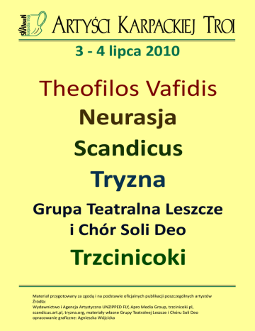 Artyœci Karpackiej Troi 3 - 4 lipca 2010 Theofilos Vafidis Neurasja Scandicus Tryzna Grupa Teatralna Leszcze i Chór Soli Deo Trzcinicoki Materiał przygotowany za zgodą i na podstawie oficjalnych publikacji poszczególnych artystów Źródła: Wydawnictwo i Agencja Artystyczna UNZIPPED FLY, Apro Media Group, trzcinicoki.pl, scandicus.art.pl, tryzna.org, materiały własne Grupy Teatralnej Leszcze i Chóru Soli Deo opracowanie graficzne: Agnieszka Wójcicka Theofilos Vafidis Ekspert i Doradca Kulinarny Executive Chef Grecka Kuchnia; Ekspert & Cooking Adviser of Greek Cuisine; Członek Fundacji Klubu Szefów Kuchni w Polsce oraz Honorowy Członek Klubu Szefów Kuchni Ateny Jego ojczyzną jest Grecja, kolebka cywilizacji europejskiej, której pełne oblicze i różnorodne smaki proponuje na co dzień na szklanym ekranie. Brał udział w programach „Europa da się lubić”, „Europa bez granic”, „Pytanie na śniadanie” i „Kawa czy herbata” a także w licznych programach kulinarnych oraz w eterze. Jako rodowity Grek stara się jak najlepiej zaprezentować swoją ojczyznę, jej historie i tradycje, ale przede wszystkim kuchnię grecką i jej produkty, które sam dla wybiera. vafidis.pl Neurasja Neurasja to nowa grupa Asji Czajkowskiej i trzech muzyków zespołu Alamut. W repertuarze grupy słychać jeszcze echa muzyki etnicznej, penetrowanej w poprzednim składzie. Neurasja to przede wszystkim jednak mocno zagrane, elektryzujące piosenki o silnych inspiracjach bluesem, brzmieniem bristolskim i alternatywnym jazzem. Piosenki napisane przez Asję i Karola Czajkowskiego to z jednej strony oszczędne i surowe w brzmieniu, emocjonalne utwory o bardzo melancholijnych tekstach. Z drugiej zaś wypełnione improwizacją i nasączone narkotycznym, transowym klimatem. Asja - wokal, harmonium; Wojtek Traczyk - bas; Hubert Zemler - perkusja; Karol Czajkowski - gitara, produkcja unzippedfly.pl Scandicus Zespół Muzyki Dawnej Scandicus zajmuje się wykonywanie muzyki średniowiecznej, przede wszystkim wokalnej. W jego repertuarze znajdują się zarówno pieśni religijne jaki i świeckie, pochodzące z wielu źródeł, m.in. Laudario di Cortona, Contigas de Santa Maria, Llibre Vermell. W skład instrumentarium wchodzą: fidel, flety proste, harfa, lutnia, symfonia oraz instrumenty perkusyjne: riq, darabuka, bendir. Zespół koncertuje w Polsce a także poza granicami kraju. Brał udział w takich wydarzeniach jak: Międzynarodowy Festiwal Muzyki Sakralnej „Salve Regina” w Wigrach, IV Międzynarodowy Festiwal im. Agricoli w Świebodzinie, IV Międzynarodowy Festiwal Muzyki Dawnej im. G.G. Gorczyckiego. Scandicus chętnie występuje także w muzeach i podczas obchodów uroczystości związanych z upamiętnieniem wydarzeń historycznych. Zespół ma w swoim dorobku dwie płyty. Spektakl teatru HoM „La Rosa” z udziałem Zespołu Scandicus został nagrodzony wyróżnieniem w 2010 roku na XXXVII Tyskich Spotkaniach Teatralnych za oprawę muzyczną. Agata Kachel-Flis oud, darabuka, riqq Agnieszka Leśniak śpiew, darabuka, symfonia, triangel Tymoteusz Dorda śpiew, fidel Jakub Kabus śpiew, bendir, darabuka, symfonia, flet prosty Piotr Flis harfa romańska, flet prosty, oud, kierownictwo artystyczne scandicus.art.pl Tryzna Grupa muzyki dawnej ze Szczecina zajmującą się poszukiwaniem źródeł muzyki wczesnośredniowiecznej ze Wschodu i Północy Europy oraz praktycznym wykorzystaniem tej wiedzy na scenie, w celu zaprezentowania jej szerszemu gronu publiczności. Wykonywany przez nich repertuar jest dosyć szeroki. Obejmuje utwory z Estonii, Bałkan, Danii, Szwecji. Śpiewany jest w ponad dziesięciu językach, wśród których często zdarzają się te niebędące już w użyciu, jak chociażby staronordycki. Autentyczność historyczna jest dla nich niezmiernie ważna, jednakże tam gdzie nauka zostawia luki, pozwalają sobie na improwizacje bądź stylizacje. Dlatego też, mimo dalekich inspiracji, naczelną ideą przyświecającą zespołowi jest jak najwierniejsze odzwierciedlenie tego, jak mogłaby brzmieć muzyka europejska we wczesnym średniowieczu, a przy okazji zapewnienie rozrywki muzycznej dla słuchającej ich publiczności. Michał Matynia - Gusli, Nyckelharpa, Bagpipes, Wooden Pipes, Lute Dariusz Dżaman - Bagpipes, Wooden Pipes Sonia Ślusarczyk - Vocals, Bowed Instruments Christo Radew - Rim Drum Stanisław Mazurek - Baglama, Oud, Lute, Hurdy Gurdy tryzna.org Grupa Teatralna Leszcze i Chór Soli Deo Nazywają się „Leszcze” i mają na swoim koncie udział w licznych konkursach artystycznych, w których odnieśli liczne sukcesy m.in. zdobycie prestiżowej nagrody Złotej Leszczyny za najlepsze przedstawienie pt. „Balladyna”. Są ambitni i kochają to co robią. W lipcu w Trzcinicy wystąpią z najnowszym przedstawieniem pt. „Troja historia prawdziwa”, które podobnie jak „Balladyna” jest teatralną adaptacją znanej wszystkim opowieści. Chór młodzieżowy „Soli Deo” istnieje od 2006 roku przy I LO w Jaśle. Składa się z około 35 osób. Śpiewają w układzie czterogłosowym pieśni religijne, patriotyczne a także rozrywkowe. Dyrygentem chóru jest mgr Monika Twarduś, absolwentka wydziału dyrygentury Akademii Muzycznej w Bydgoszczy. Ich największym osiągnięciem jest zdobycie wyróżnienia w XVI Ogólnopolskim Festiwalu Kolęd i Pastorałek w Będzinie. Brali także udział w przesłuchaniach chórów wykonujących kolędy i pastorałki, które miały miejsce w Wyższym Seminarium Duchownym w Rzeszowie. Jako jedyny chór tych przesłuchań zostali wyróżnieni, a dyrygent otrzymała nagrodę dla najlepszego dyrygenta. 1lo.jaslo.pl Trzcinicoki Trzcinicoki z Trzcinicy to zespół ściśle trzymający się reguł dawnego muzykowania, niezwykle dbający o szczegóły takie jak: ubiór, instrumenty, oryginalne teksty przyśpiewek. Wszystko to sprawia, że koncertując, podbija serca słuchaczy w kraju i za granicą. Muzykanci grający w kapeli pr