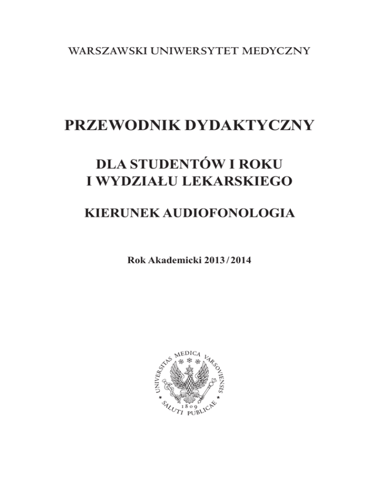 WARSZAWSKI UNIWERSYTET MEDYCZNY PRZEWODNIK DYDAKTYCZNY DLA STUDENTÓW I ROKU I WYDZIAŁU LEKARSKIEGO Kierunek AUDIOFONOLOGIA Rok Akademicki 2013 / 2014 Opracowanie edytorskie i druk: Oficyna Wydawnicza Warszawskiego Uniwersytetu Medycznego Zam. ......... / 2013 nakład 50 egz. tel. (22) 5720 327 e-mail: [email protected] www.oficynawydawnicza.wum.edu.pl Koledzy Studenci! Pierwszy rok studiów na Wydziale Lekarskim Warszawskiego Uniwersytetu Medycznego jest dla Was początkiem drogi, która za sześć lat zakończy się uzyskaniem Dyplomu Lekarza. Osiągnięcie tego celu to spełnienie marzeń wszystkich, którzy rozpoczynają studia medyczne. Czas studiów to okres piękny ale i trudny. Wraz z przekroczeniem progu naszej Alma Mater bierzecie na siebie nie tylko prawa, ale i obowiązki studentów, które nie są jeszcze Wam dobrze znane. W tych trudnych początkach będą pomagać Wam władze dziekańskie, pracownicy dziekanatu, nauczyciele akademiccy, samorząd studentów i organizacje studenckie. W czasie pierwszych lat studiów nie będzie wielu okazji do sprawdzenia się w niesieniu pomocy chorym. Jest to jednak okres bardzo ważny, bo poświęcony przede wszystkim naukom podstawowym, których zgłębienie pozwoli potem na łatwe zrozumienie przedmiotów klinicznych. Program jest obszerny, a jego opanowanie będzie wymagało nie tylko zmiany sposobu uczenia się w stosunku do poprzednich lat, ale również dużej mobilizacji i wewnętrznej dyscypliny. Przewodnik Dydaktyczny, który w tej chwili dotarł do Waszych rąk, pozwala na uzyskanie informacji o przedmiotach nauczania, programie zajęć, ich organizacji, a także zasadach i formach ich zaliczania. Przy każdym z przedmiotów podane zostały podręczniki i piśmiennictwo, które pomagają w opanowaniu obowiązujących wiadomości. Dane te, mamy nadzieję, ułatwią przygotowanie się do zajęć i pozwolą na uzyskanie lepszych wyników. Ważną informacją zawartą w przewodniku są nazwiska nauczycieli akademickich odpowiedzialnych za nauczanie danego przedmiotu. Od pierwszych lat studiów zachęcamy do uczestniczenia w pracach Studenckich Kół Naukowych przy zakładach i katedrach. Aktywne uczestnictwo w pracach kół, chociaż zazwyczaj absorbujące czasowo, pozwala nie tylko na rozwinięcie własnych zainteresowań, ale także na nawiązanie bliższych kontaktów z pracownikami naukowymi zakładu, przy którym działa Koło i zdobywanie zazwyczaj najnowszej, nie zawartej jeszcze w podręcznikach wiedzy z danej dziedziny. Władze Dziekańskie zapewniają, że będą otwarte na wszelkie konstruktywne propozycje i uwagi młodzieży akademickiej dotyczące procesu dydaktycznego w Uczelni. Prodziekan ds. I roku Dziekan I Wydziału Lekarskiego Prof. dr hab. Barbara Górnicka Prof. dr hab. Mirosław Wielgoś Spis treści . WŁADZE WARSZAWSKIEGO UNIWERSYTETU MEDYCZNEGO...............5 . PODZIAŁ ROKU AKADEMICKIEGO 2013/2014 ................................................6 . SKŁAD ZARZĄDU SAMORZĄDU STUDENTÓW WUM W KADENCJI 2012-2014.........................................................................................7 4. Patologia słuchu, głosu, mowy i równowagi..................................10 5. NAUKA O CZŁOWIEKU.........................................................................................12 6. Promocja zdrowia i edukacja zdrowotna........................................14 7. PODSTAWY ZDROWIA PUBLICZNEGO..............................................................15 8. ETYKA......................................................................................................................16 9. PRAWO......................................................................................................................17 0. SOCJOLOGIA...........................................................................................................18 . Ochrona środowiska.....................................................................................19 . EKONOMIA..............................................................................................................22 . EKONOMIKA I FINANSOWANIE W OCHRONIE ZDROWIA............................23 14. ORGANIZACJA I ZARZĄDZANIE W OCHRONIE ZDROWIA...........................24 15. UBEZPIECZENIA SPOŁECZNE I ZDROWOTNE.................................................25 6. POLITYKA SPOŁECZNA I ZDROWOTNA...........................................................26 17. ZDROWIE ŚRODOWISKOWE ..............................................................................27 8. Zaburzenia porozumiewania się językowego..................................29 9. KWALIFIKOWANA PIERWSZA POMOC..............................................................31 0. ELEMENTY FIZYKI Z ELEKTRONIKĄ................................................................32 . ELEMENTY MATEMATYKI...................................................................................33 . PROPEDEUTYKA ZDROWIA I CHOROBY..........................................................34 . JĘZYK OBCY(do wyboru język angielski, francuski, niemiecki lub rosyjski)........35 24. WYCHOWANIE FIZYCZNE....................................................................................37 25. PRZYSPOSOBIENIE BIBLIOTECZNE..................................................................39 6. BEZPIECZEŃSTWO I HIGIENA PRACY...............................................................40 27. Nadzór Sanitarno-Epidemiologiczny...................................................41 KIERUNEK AUDIOFONOLOGIA RAMOWY PROGRAM PRAKTYKI DLA STUDENTÓW I ROKU AUDIOFONOLOGII Po pierwszym roku studiów obowiązuje studentów 4 tygodniowa (20 dni roboczych) praktyka zawodowa w tym 2 tygodnie ze zdrowia publicznego oraz 2 tygodnie badań słuchu, równowagi i mowy. Termin, miejsce oraz harmonogram praktyki ze zdrowia publicznego oraz praktyki z badań narządu słuchu równowagi i mowy należy ustalić z Kierownikiem/Dyrektorem ośrodka lub 