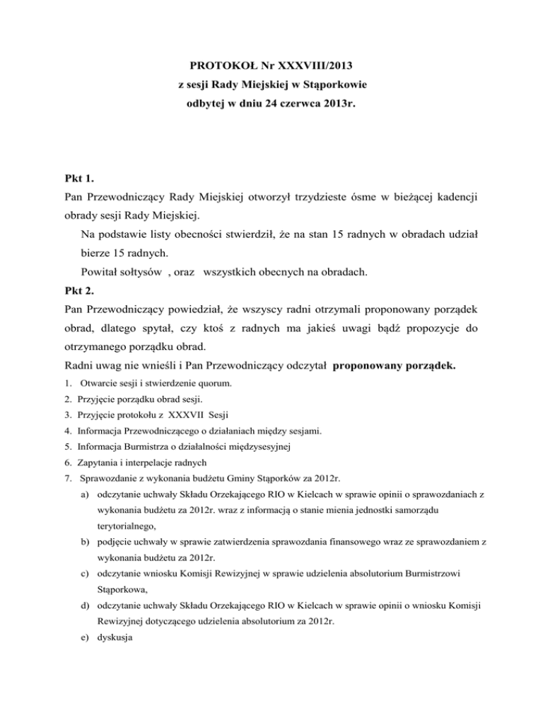 PROTOKOŁ Nr XXXVIII/2013 z sesji Rady Miejskiej w Stąporkowie odbytej w dniu 24 czerwca 2013r. Pkt 1. Pan Przewodniczący Rady Miejskiej otworzył trzydzieste ósme w bieżącej kadencji obrady sesji Rady Miejskiej. Na podstawie listy obecności stwierdził, że na stan 15 radnych w obradach udział bierze 15 radnych. Powitał sołtysów , oraz wszystkich obecnych na obradach. Pkt 2. Pan Przewodniczący powiedział, że wszyscy radni otrzymali proponowany porządek obrad, dlatego spytał, czy ktoś z radnych ma jakieś uwagi bądź propozycje do otrzymanego porządku obrad. Radni uwag nie wnieśli i Pan Przewodniczący odczytał proponowany porządek. 1. Otwarcie sesji i stwierdzenie quorum. 2. Przyjęcie porządku obrad sesji. 3. Przyjęcie protokołu z XXXVII Sesji 4. Informacja Przewodniczącego o działaniach między sesjami. 5. Informacja Burmistrza o działalności międzysesyjnej 6. Zapytania i interpelacje radnych 7. Sprawozdanie z wykonania budżetu Gminy Stąporków za 2012r. a) odczytanie uchwały Składu Orzekającego RIO w Kielcach w sprawie opinii o sprawozdaniach z wykonania budżetu za 2012r. wraz z informacją o stanie mienia jednostki samorządu terytorialnego, b) podjęcie uchwały w sprawie zatwierdzenia sprawozdania finansowego wraz ze sprawozdaniem z wykonania budżetu za 2012r. c) odczytanie wniosku Komisji Rewizyjnej w sprawie udzielenia absolutorium Burmistrzowi Stąporkowa, d) odczytanie uchwały Składu Orzekającego RIO w Kielcach w sprawie opinii o wniosku Komisji Rewizyjnej dotyczącego udzielenia absolutorium za 2012r. e) dyskusja f) podjęcie uchwały w sprawie absolutorium dla Burmistrza Gminy Stąporków z tytułu wykonania budżetu Gminy Stąporków za 2012r. 8. Rozpatrzenie projektów uchwał w sprawach: a) zmiany Wieloletniej Prognozy Finansowej Gminy Stąporków na lata 2013 – 2018 b) zmian w budżecie Gminy Stąporków na 2013r. c)wyrażenia zgody na umorzenie należności Gminy Stąporków od Stowarzyszenia Monar w Warszawie, d) sprzedaży nieruchomości stanowiącej własność Gminy Stąporków. 9. Odpowiedzi na zapytania i interpelacje radnych. 10. Sprawy różne. 11. Zamknięcie obrad sesji W głosowaniu jawnym radni jednogłośnie przyjęli proponowany porządek obrad dzisiejszej sesji. Pkt 3. Radni w głosowaniu jawnym przyjęli jednogłośnie protokołu z XXXVII sesji. Pkt 4. Pan Wiceprzewodniczący w imieniu Pana Przewodniczącego odczytał Informację o działaniach między sesjami. Pkt 5. Pan Sekretarz w imieniu Pani Burmistrz odczytał informacji o działalności międzysesyjnej. Pkt 6. W punkcie tym radni zgłaszali interpelacje i zapytania: Pan Krzysztof Chrzan – Wiceprzewodniczący RM – - w związku z podtopieniami poprosił Panią Burmistrz o udrożnienie rowów oraz wycięcie poboczy przy drogach gminnych w miejscowościach: Gustawów w stronę Lutej II oraz w Lutej II w stronę Kucębowa. Woda tam cały czas płynie drogą co powoduje jej uszkodzenia nawierzchni asfaltowej. Radny Dariusz Młodawski – pytania do Pani Burmistrz: - jak wygląda kwestia wprowadzenia w naszej gminie „ustawy śmieciowej” od 1 lipca. Z tego co jest zorientowany miała być podpisana umowa z PGK Końskie, ale chyba nie doszło do jej podpisania. W przyszłym tygodniu mamy już lipiec i staniemy przed dylematem co robimy ze śmieciami, ponieważ firmy które do tej pory śmieci odbierały przestaną realizować to zadanie. - oficjalnie chciałby poprosić, aby w trybie pilnym pozbierać nagromadzony po ostatnich ulewach żwir i piach znajdujący się na drogach. Wracając do sytuacji z podtopieniami z radnym Mazurem był u Pana Tomasza Wojny na posesji i wygląda to katastroficznie. Podtopienie tej posesji nie jest po raz pierwszy, a pojawia się po każdej ulewie. Dlatego sprawę tą należy pilnie załatwić. Radny Edward Mazur zadał pytania Pani Burmistrz: - kiedy zostanie ogłoszony przetarg na odwodnienie boisk w Niekłaniu Wielkim. Jak się dowiedział znów są boiska zalane mułem i błotem. Już od roku się upomina o zrealizowanie tego zadania i nic się nie dzieje w tym temacie. Boiska były robione z naszych podatków za ciężko wypracowane pieniądze i nie można tego lekceważyć. - odnośnie podtopienia posesji Pana Wojny – zadzwonił do Pana Guli po straż pożarną i on temat ruszył. Umówił się z Panem Wojną, że dziś na sesji odczyta to pismo. ( pismo w załączeniu do protokołu) Radny Robert Dziubiński – - na ostatniej sesji prosił o skontrolowanie ulic i chodników na ul. 1 Maja, Moniuszki i Krasińskiego w Stąporkowie. Nie otrzymał żadnej odpowiedzi i nie wie czy jeszcze trwa kontrola bo są one na gwarancji. Prosi o zwrócenie uwagi na kratki ściekowe, bo są one na jednej stronie a na drugiej stronie stoi woda. Pan Jacek Kołodziej – Przewodniczący RM - zwrócił się z prośbą o zajęcie się ulicą Szkolną w Niekłaniu. Jest to droga powiatowa. Prowadzi do Szkoły i do Ośrodka Zdrowia. Doszły do niego informacje, że park w Niekłaniu został odsprzedany nowemu właścicielowi i nieruchomość ta zostanie ogrodzona. Wówczas staniemy przed poważnym dylematem, że dzieci nie będą miały którędy uczęszczać do szkoły. Droga jest wąska i bardzo zniszczona a jeżdżą nią w obydwie strony samochody. Dlatego myśli, że w przyszłym roku będzie to zadanie priorytetowe i prosi Panią Burmistrz aby poczyniła jakieś ustalenia ze Starostwem, bo zostaniemy ze szkołą w lesie do której nie będzie można dojść. Pkt 7 „a” Pan Przewodniczący powiedział, że radni otrzymali na dwa tygodnie przed dzisiejszą sesją Sprawozdanie z wykonania budżetu Miasta i Gminy Stąporków za 2012r. Sprawozdanie to było również zaopiniowane przez Regionalną Izbę Obrachunkową. Dlatego też poprosił Panią Skarbnik o odczytanie Uchwały Nr 38/I/2013 VIII Składu Orzekającego Regionalnej Izby Obrachunkowej w Kielcach z dnia 8 maja 2013r. w sprawie opinii o sprawozdaniach z wykonania budżetu Mias