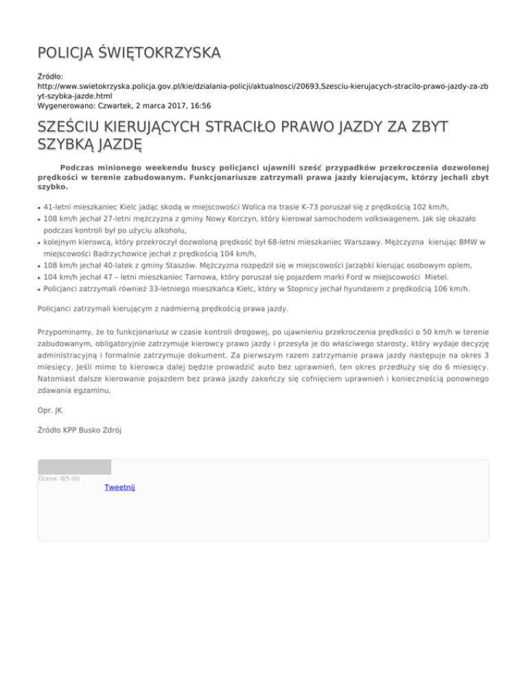POLICJA ŚWIĘTOKRZYSKA Źródło: http://www.swietokrzyska.policja.gov.pl/kie/dzialania-policji/aktualnosci/20693,Szesciu-kierujacych-stracilo-prawo-jazdy-za-zb yt-szybka-jazde.html Wygenerowano: Czwartek, 2 marca 2017, 16:56 SZEŚCIU KIERUJĄCYCH STRACIŁO PRAWO JAZDY ZA ZBYT SZYBKĄ JAZDĘ Podczas minionego weekendu buscy policjanci ujawnili sześć przypadków przekroczenia dozwolonej prędkości w terenie zabudowanym. Funkcjonariusze zatrzymali prawa jazdy kierującym, którzy jechali zbyt szybko. ● 41-letni mieszkaniec Kielc jadąc skodą w miejscowości Wolica na trasie K-73 poruszał się z prędkością 102 km/h, ● 108 km/h jechał 27-letni mężczyzna z gminy Nowy Korczyn, który kierował samochodem volkswagenem. Jak się okazało podczas kontroli był po użyciu alkoholu, ● kolejnym kierowcą, który przekroczył dozwoloną prędkość był 68-letni mieszkaniec Warszawy. Mężczyzna kierując BMW w miejscowości Badrzychowice jechał z prędkością 104 km/h, ● 108 km/h jechał 40-latek z gminy Staszów. Mężczyzna rozpędził się w miejscowości Jarząbki kierując osobowym oplem, ● 104 km/h jechał 47 – letni mieszkaniec Tarnowa, który poruszał się pojazdem marki Ford w miejscowości Mietel. ● Policjanci zatrzymali również 33-letniego mieszkańca Kielc, który w Stopnicy jechał hyundaiem z prędkością 106 km/h. Policjanci zatrzymali kierującym z nadmierną prędkością prawa jazdy. Przypominamy, że to funkcjonariusz w czasie kontroli drogowej, po ujawnieniu przekroczenia prędkości o 50 km/h w terenie zabudowanym, obligatoryjnie zatrzymuje kierowcy prawo jazdy i przesyła je do właściwego starosty, który wydaje decyzję administracyjną i formalnie zatrzymuje dokument. Za pierwszym razem zatrzymanie prawa jazdy następuje na okres 3 miesięcy. Jeśli mimo to kierowca dalej będzie prowadzić auto bez uprawnień, ten okres przedłuży się do 6 miesięcy. Natomiast dalsze kierowanie pojazdem bez prawa jazdy zakończy się cofnięciem uprawnień i koniecznością ponownego zdawania egzaminu. Opr. JK Źródło KPP Busko Zdrój Ocena: 0/5 (0) Tweetnij