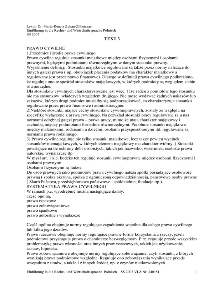 Lektor Dr. Maria-Renata Zykan-Zilberszac Einführung in die Rechts- und Wirtschaftssprache Polnisch SS 2007 TEXT 3 PRAWO CYWILNE 1.Przedmiot i źródła prawa cywilnego Prawo cywilne reguluje stosunki majątkowe między osobami fizycznymi i osobami prawnymi, będącymi podmiotami równorzędnymi w danym stosunku prawny. Wyjaśnienie definicji: Stosunku majątkowe regulowane są także przez normy należące do innych gałęzi prawa ( np. obowiązek płacenia podatków ma charakter majątkowy a regulowany jest przez prawo finansowe). Dlatego w definicji prawa cywilnego podkreślono, że reguluje ono te spośród stosunków majątkowych, w których podmioty są względem siebie równorzędne. Dla stosunków cywilnych charakterystyczne jest więc, 1)że żaden z pomiotów tego stosunku nie ma stosunków władczych względem drugiego. Nie może wydawać żadnych nakazów lub zakazów, którym drugi podmiot musiałby się podporządkować, co charakteryzuje stosunku regulowane przez prawo finansowe i administracyjne. 2)Niektóre stosunki, mające cechy stosunków cywilnoprawnych, zostały ze względu na specyfikę wyłączone z prawa cywilnego. Na przykład stosunki pracy regulowane są u nas normami odrębnej gałęzi prawa – prawa pracy, mimo że mają charakter majątkowy i zachodzą między podmiotami formalnie równorzędnymi. Podobnie stosunki majątkowe między małżonkami, rodzicami a dziećmi, osobami przysposobionymi itd. regulowane są normami prawa rodzinnego. 3) Prawo cywilne reguluje nie tylko stosunki majątkowe, lecz także pewien wycinek stosunków niemajątkowych, w których element majątkowy ma charakter wtórny. ( Stosunki powstające na tle ochrony dóbr osobistych, takich jak nazwisko, wizerunek, osobiste prawa autorskie, wynalazcze itp. W myśl art. 1 k.c. kodeks ten reguluje stosunki cywilnoprawne między osobami fizycznymi i osobami prawnymi. Osobami fizycznymi są ludzie. Do osób prawnych jako podmiotów prawa cywilnego należą spółki posiadające osobowość prawną ( spółka akcyjna, spółka z ograniczoną odpowiedzialnością, państwowe osoby prawne ( Skarb Państwa, przedsiębiorstwa państwowe , spółdzielnie, fundacje itp.). SYSTEMATYKA PRAWA CYWILNEGO W ramach p.c. wyodrębnić można następujące działy: część ogólną, prawo rzeczowe prawo zobowiązaniowe prawo spadkowe prawo autorskie i wynalazcze Część ogólna obejmuje normy regulujące zagadnienia wspólne dla całego prawa cywilnego lub kilku jego działów. Prawo rzeczowe obejmuje normy regulujące prawne formy korzystania z rzeczy, jeżeli podmiotowi przysługują prawa o charakterze bezwzględnym. P.rz. reguluje przede wszystkim problematykę prawa własności oraz innych praw rzeczowych, takich jak użytkowanie, zastaw, hipoteka. Prawo zobowiązaniowe obejmuje normy regulujące zobowiązania, czyli stosunki, z których wynikają prawa podmiotowe względne. Reguluje ono zobowiązania wynikające przede wszystkim z umów, a także i z innych źródeł, np. z czynów niedozwolonych. Einführung in die Rechts- und Wirtschaftssprache Polnisch – SS 2007 VLZ.Nr. 340151 1 Prawo spadkowe reguluje przejście praw i obowiązków osób zmarłych na inne podmioty. Prawo autorskie i wynalazcze określa prawa do dóbr niematerialnych. Prawa na dobrach niematerialnych to prawa dotyczące na przykład dzieł literacki, naukowych, artystycznych, wynalazków. Łączą one w sobie zarówno elementy niemajątkowe, jak i majątkowo. Przykładem elementu niemajątkowego jest prawo autora do jego utworu oraz ochrona tego prawa przez przywłaszczeniem autorstwa. Elementem majątkowym jest prawo autora do wynagrodzenia za wykorzystanie jego utworu. ŹRÓDŁA OBOWIĄZUJĄCEGO PRAWA CYWILNEGO kodeks cywilny z 1964 wielokrotnie później nowelizowany. Zasadnicze znaczenia miała nowelizacja 1990 mająca na celu przystosowanie k.c. do nowych warunków gospodarki rynkowej. K.c. podzielony jest na 4 księgi: I – część ogólna, II – własność i inne prawa rzeczowe, III- zobowiązania, IV-spadki Księgi z kolei dzielą się na tytuły, działy i rozdziały. W poszczególnych rozdziałach normy zawarte są w kolejnych artykułach, z których obszerniejsze dzielą się na paragrafy. K.c. nie jest jedynym źródłem prawa cywilnego. Nie reguluje on prawa autorskiego ani wynalazczego – te działy prawa cywilnego unormowane są: prawo autorskie w ustawie o prawie autorskim i prawach pokrewnych z 1994, prawo wynalazcze zaś w ustawie o wynalazczość. Ponadto – liczne akty normatywne dotyczące wyspecjalizowanej problematyki, której ustawodawca nie chciał z różnych przyczyn objąć unormowaniami kodeksowymi ( np. ze względu na zamieszczanie w nich obok norm cywilnych także norm wchodzących w zakres innych gałęzi prawa, ze względu na ich uszczegółowienie, a niekiedy ze względu na ich małą stabilność, jeżeli ulegają one częstym zmianom). Na przykład ustawa Prawo spółdzielcze, ustawa o przedsiębiorstwach państwowych, ustawa Prawo przewozowe, ustawa o działalności ubezpieczeniowej i inne. STOSUNEK CYWILNOPRAWNY = jest to stosunek społeczny regulowany normami prawa cywilnego. Cechami tego stosunku jest jego majątkowy charakter oraz równorzędność występujących w nim podmiotów. Ponadto cechą dodatkową jest znaczna swoboda podmiotów w ustanawianiu i kształtowaniu tych stosunków. Elementy stosunku cywilnoprawnego: strony ( podmioty) stosunku cywilnoprawnego przedmiot tego stosunku prawo podmiotowe ( uprawnienie) obowiązek, będący korelatem tego prawa. Podmiotami stosunków cywilnoprawnych mogą być bądź osoby fizyczne ( ludzie), bądź osoby prawne ( np. spółki kapitałowe, spółdzielnie, przedsiębiorstwa państwowe). Zdolność to tego, aby móc występować jako podmiot stosunków cywilnoprawnych, nosi nazwę zdolności prawnej. Prawa oraz obowiązki składają się na treść stosunku cywilnoprawnego, skorelowane są one w ten sposób, że prawu jednego podmiot