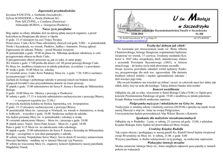 Zapowiedzi przedmałżeńskie U św. Mikołaja Krystian PANCZYK, s. Gerharda (Szczedrzyk) – Sylwia SCHNEIDER, c. Pawła (Dobrzeń M.) Piotr SZCZYPEL, s. Czesława (Żurawica) – Aleksandra BURDA, c. Grzegorza (Pustków) Nasze życie parafialne Bóg zapłać za ofiary składane dziś na dalszą spłatę naszych organów, a przed kościołem na Hospicjum dla dzieci w Opolu. O godz. 15.15 nieszpory ku czci Trójcy Świętej. Przed urocz. Ciała i Krwi Pana odwiedziny chorych (od godz. 9.00) – w poniedziałek: Niwki i Szczedrzyk, we wtorek: Pustków, Jedlice i Antoniów. Proszę zgłosić. Zaproszenie do sakram. Pokuty – przed Mszami świętymi. W poniedziałek o godz. 19.00 na placu św. Mikołaja spotkanie młodzieży w celu przygotowania ołtarza na Boże Ciało. O przygotowanie ołtarzy proszone są, jak co roku, te same grupy. We wtorek o godz. 17.00 próba dla dzieci z kl. III przed procesją Bożego Ciała. Po Mszy św. modlitwa różańcowa za młode pokolenie, za rodziny i o powołania. W środę o godz. 16.00 Msza św. szkolna. W czwartek urocz. Ciała i Krwi Pańskiej. Msze św. o godz. 7.30, 9.00 (z eucharystyczną procesją) i 16.00. Zachęta do licznego i pobożnego udziału w procesji (niech nie braknie dzieci sypiących kwiatki!) oraz przyozdobienia domów na trasie procesji. W piątek o godz. 15.00 nabożeństwo do Serca P. Jezusa z Koronką do Miłosierdzia Bożego. O godz. 18.00 Msza św. Oktawy z procesją w Pustkowie. W sobotę o godz. 17.15 w kościele nabożeństwo eucharystyczne z procesją Oktawy. - w następnym tygodniu (po 22.06.): W przyszłą niedzielę kolekta na Stolicę Apostolską, tzw. świętopietrze. O godz. 15.15 nieszpory eucharystyczne z procesją Oktawy. W poniedziałek Msza św. i procesja w Niwkach, we wtorek w Antoniowie, w środę w Jedlicach – wszystkie o godz. 18.00. Serdeczna zachęta do udziału. Nie będzie porannej Mszy św. w poniedziałek i szkolnej w środę. W czwartek zakończenie Oktawy – Msza św. i procesja o godz. 18.00. W piątek urocz. Najśw. Serca Pana Jezusa – Msza św. o godz. 18.00. Rano o godz. 8.15 Msza św. na zakończenie roku szkolnego. W piątek o godz. 15.00 nabożeństwo do Serca P. Jezusa z Koronką do Miłosierdzia Bożego – szczególnie w tym dniu pamiętajmy o udziale. W sobotę czcimy Niepokalane Serce Maryi. Jest to dzień 42 rocznicy ustanowienia Diecezji Opolskiej – módlmy się w intencji Diecezji i jej Pasterzy. W sobotę po wieczornej Mszy św. organowy koncert dyplomowy naszej parafianki Magdaleny Frasek. w Szczedrzyku Wiadomości parafialne Rzymskokatolickiej Parafii w Szczedrzyku 15.06.2014 Nr 306 PL 46-042 Szczedrzyk, Pl 1- go Maja 19 http://www.parafia-szczedrzyk.pl tel: (77) 4655192 Trzeba być dobrym jak chleb! To wezwanie jest streszczeniem nauki św. Brata Alberta Chmielowskiego, którego liturgiczne wspomnienie będziemy świętować we wtorek, 17 czerwca. Urodzony niedaleko Krakowa w 1845 roku, niespokojny duch, utalentowany malarz i uczestnik Powstania Styczniowego (1863), w którym utracił nogę – do końca życia miał drewniane szczudło . Swoje życiowe powołanie odnalazł wśród nędzarzy Krakowa, przygotowując dla nich tzw. ogrzewalnie. Dla służenia biednym założył żeńskie i męskie zgromadzenia zakonne – dziś noszące jego imię. Dla swych biedaków nie wstydził się żebrać i uczył, że człowiek musi być dobry jak chleb, który leży na stole dla każdego. Takiej dobroci bardzo dziś trzeba! Koncert uwielbienia Odbędzie się, jak co roku, wieczorem w dzień Bożego Ciała (19.06.) w Opolu przy kościele Przemienienia Pańskiego od godz. 19.00 z modlitwą za młode pokolenie – Ksiądz Biskup wszystkich serdecznie zaprasza. Pielgrzymka mężczyzn i młodzieńców na Górę św. Anny Tradycyjnie w ostatnią sobotę i niedzielę czerwca (28/29.06.) spotyka się męski świat naszej Diecezji u stóp św. Anny na swojej Pielgrzymce. Uroczystościom będzie przewodniczył Abp Wiktor Skworc z Katowic. Spotkanie dla małżeństw niesakramentalnych Odbędzie się w Prudniku – Lesie, w sobotę, 21 czerwca od godz. 15.00, z udziałem Księdza Biskupa, który będzie też przewodniczył Mszy świętej. Urodziny Księdza Rudolfa Tak często obecny i posługujący w naszej parafii Ks. Rudolf Gaweł będzie świętował swoje 80 urodziny na Mszy św. w sobotę, 21.06. o godz. 8.00. Wszyscy parafianie, w duchu wdzięczności za tę posługę, są serdecznie zaproszeni. Wakacyjne intencje mszalne Można zamawiać intencje Mszy św., które mógłbym odprawić poza parafią w ramach pobytu na wakacjach. NIEDZIELA – 15.06.2014 – Trójcy Przenajświętszej 730 (niem.) za + Anielę Spyra w 1 roczn. śmierci, jej + męża Alojzego, + siostrę Emilię w 1 roczn. śmierci, za ++ z pokrew. 1000 za + męża Jerzego Wycisk, jego ++ rodziców Marię i Filipa Wycisk, za ++ rodziców Marię i Pawła Ebisz, ++ brata, siostrę i szwagra – o zdrowie i błog. Boże w rodzinie i w rodzinach synów 1515 nieszpory ku czci Trójcy Świętej 1600 za + męża i ojca Pawła (w dniu urodzin), jego ++ rodziców Marię i Andrzeja Brandt, ++ rodziców Matyldę i Jana Ploch, ++ rodzeństwo i ++ z pokrew. PONIEDZIAŁEK – 16.06.2014 700 za + Józefa Pańczyk w 1 roczn. śmierci WTOREK – 17.06.2014 – św. Brata Alberta 2) w int. uczestników klasowego spotkania rocznicowego i ich rodzin – o zdrowie i błog. Boże NIEDZIELA – 22.06.2014 – XII zwykła 730 (niem.) dziękcz. – z prośbą o zdrowie i błog. Boże w int. rodziny Grabowski 1000 za ++ rodziców Piotra i Agnieszkę, 2 ++ synów, ++ rodziców Wiktora i Joannę, + brata Henryka Pytel, 2 ++ ciotki, 2 ++ szwagrów i bratową, za ++ z pokrew. Nowak – Pytel 1515 nieszpory eucharystyczne - z procesją Oktawy 1600 za + Edeltraudę Szczemirską (w dniu imienin) oraz za ++ rodziców i teściów PONIEDZIAŁEK – 23.06.2014 1800 ku czci św. Jana Chrzciciela w int. mieszkańców gromady Niwki – z prośbą o zdrowie i błog. 