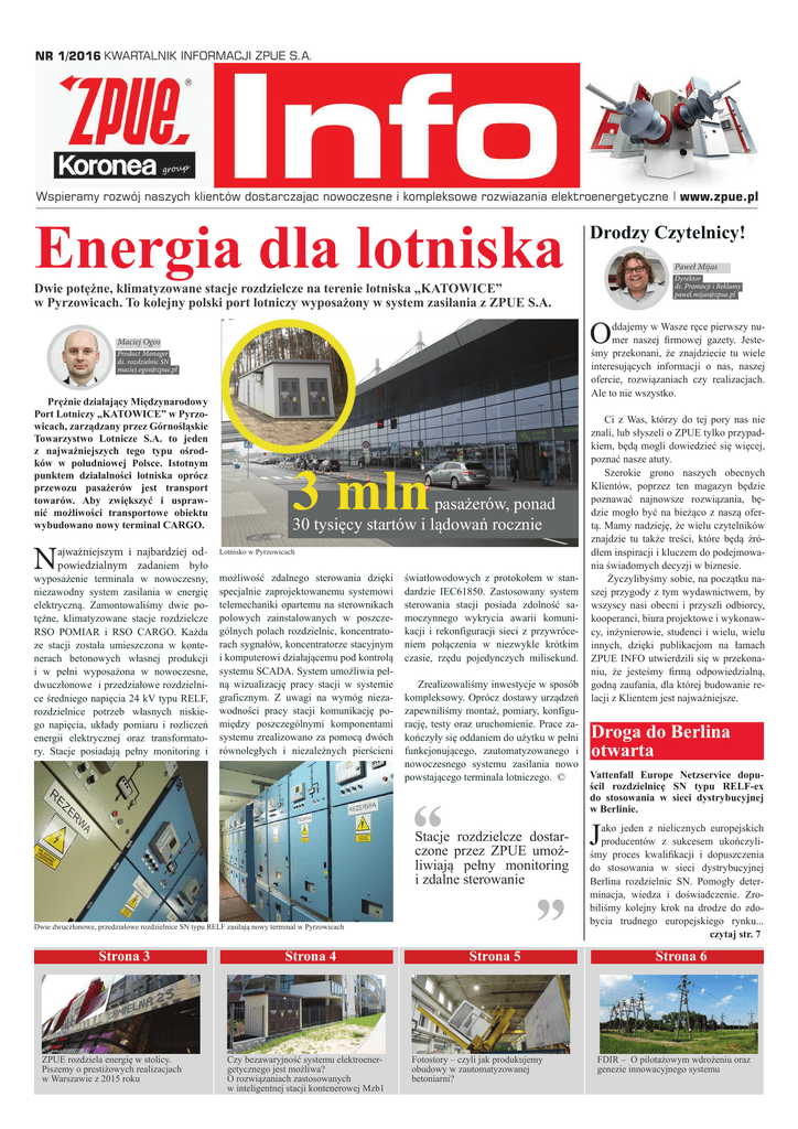 Energia dla lotniska Drodzy Czytelnicy! Paweł Mijas Dyrektor ds. Promocji i Reklamy [email protected] Dwie potężne, klimatyzowane stacje rozdzielcze na terenie lotniska „KATOWICE” w Pyrzowicach. To kolejny polski port lotniczy wyposażony w system zasilania z ZPUE S.A. ddajemy w Wasze ręce pierwszy numer naszej firmowej gazety. Jesteśmy przekonani, że znajdziecie tu wiele interesujących informacji o nas, naszej ofercie, rozwiązaniach czy realizacjach. Ale to nie wszystko. O Maciej Ogos Product Manager ds. rozdzielnic SN [email protected] N ajważniejszym i najbardziej odpowiedzialnym zadaniem było wyposażenie terminala w nowoczesny, niezawodny system zasilania w energię elektryczną. Zamontowaliśmy dwie potężne, klimatyzowane stacje rozdzielcze RSO POMIAR i RSO CARGO. Każda ze stacji została umieszczona w kontenerach betonowych własnej produkcji i w pełni wyposażona w nowoczesne, dwuczłonowe i przedziałowe rozdzielnice średniego napięcia 24 kV typu RELF, rozdzielnice potrzeb własnych niskiego napięcia, układy pomiaru i rozliczeń energii elektrycznej oraz transformatory. Stacje posiadają pełny monitoring i 3 mln pasażerów, ponad 30 tysięcy startów i lądowań rocznie Lotnisko w Pyrzowicach możliwość zdalnego sterowania dzięki specjalnie zaprojektowanemu systemowi telemechaniki opartemu na sterownikach polowych zainstalowanych w poszczególnych polach rozdzielnic, koncentratorach sygnałów, koncentratorze stacyjnym i komputerowi działającemu pod kontrolą systemu SCADA. System umożliwia pełną wizualizację pracy stacji w systemie graficznym. Z uwagi na wymóg niezawodności pracy stacji komunikację pomiędzy poszczególnymi komponentami systemu zrealizowano za pomocą dwóch równoległych i niezależnych pierścieni światłowodowych z protokołem w standardzie IEC61850. Zastosowany system sterowania stacji posiada zdolność samoczynnego wykrycia awarii komunikacji i rekonfiguracji sieci z przywróceniem połączenia w niezwykle krótkim czasie, rzędu pojedynczych milisekund. Zrealizowaliśmy inwestycje w sposób kompleksowy. Oprócz dostawy urządzeń zapewniliśmy montaż, pomiary, konfigurację, testy oraz uruchomienie. Prace zakończyły się oddaniem do użytku w pełni funkcjonującego, zautomatyzowanego i nowoczesnego systemu zasilania nowo powstającego terminala lotniczego. © " Prężnie działający Międzynarodowy Port Lotniczy „KATOWICE” w Pyrzowicach, zarządzany przez Górnośląskie Towarzystwo Lotnicze S.A. to jeden z najważniejszych tego typu ośrodków w południowej Polsce. Istotnym punktem działalności lotniska oprócz przewozu pasażerów jest transport towarów. Aby zwiększyć i usprawnić możliwości transportowe obiektu wybudowano nowy terminal CARGO. Stacje rozdzielcze dostarczone przez ZPUE umożliwiają pełny monitoring i zdalne sterowanie Dwie dwuczłonowe, przedziałowe rozdzielnice SN typu RELF zasilają nowy terminal w Pyrzowicach Strona 3 ZPUE rozdziela energię w stolicy. Piszemy o prestiżowych realizacjach w Warszawie z 2015 roku Strona 4 Czy bezawaryjność systemu elektroenergetycznego jest możliwa? O rozwiązaniach zastosowanych w inteligentnej stacji kontenerowej Mzb1 Strona 5 " Fotostory – czyli jak produkujemy obudowy w zautomatyzowanej betoniarni? Ci z Was, którzy do tej pory nas nie znali, lub słyszeli o ZPUE tylko przypadkiem, będą mogli dowiedzieć się więcej, poznać nasze atuty. Szerokie grono naszych obecnych Klientów, poprzez ten magazyn będzie poznawać najnowsze rozwiązania, będzie mogło być na bieżąco z naszą ofertą. Mamy nadzieję, że wielu czytelników znajdzie tu także treści, które będą źródłem inspiracji i kluczem do podejmowania świadomych decyzji w biznesie. Życzylibyśmy sobie, na początku naszej przygody z tym wydawnictwem, by wszyscy nasi obecni i przyszli odbiorcy, kooperanci, biura projektowe i wykonawcy, inżynierowie, studenci i wielu, wielu innych, dzięki publikacjom na łamach ZPUE INFO utwierdzili się w przekonaniu, że jesteśmy firmą odpowiedzialną, godną zaufania, dla której budowanie relacji z Klientem jest najważniejsze. Droga do Berlina otwarta Vattenfall Europe Netzservice dopuścił rozdzielnicę SN typu RELF-ex do stosowania w sieci dystrybucyjnej w Berlinie. J ako jeden z nielicznych europejskich producentów z sukcesem ukończyliśmy proces kwalifikacji i dopuszczenia do stosowania w sieci dystrybucyjnej Berlina rozdzielnic SN. Pomogły determinacja, wiedza i doświadczenie. Zrobiliśmy kolejny krok na drodze do zdobycia trudnego europejskiego rynku... czytaj str. 7 Strona 6 FDIR – O pilotażowym wdrożeniu oraz genezie innowacyjnego systemu Nadzór systemu nawet z ... domu Nowoczesne rozwiązania w zakresie wizualizacji rozdzielnic nN na przykładzie huty CMC Zawiercie Windys Jacek Product Manager ds. rozdzielnic nN [email protected] Konfiguracja sprawnego i wydajnego systemu monitoringu staje się możliwa bez konieczności ogromnych inwestycji. Dzisiaj kierownik utrzymania ruchu nawet w małym zakładzie czy obiekcie komercyjnym może mieć niezawodne wsparcie i bieżącą kontrolę pracy systemu zasilania. O możliwościach nowych rozwiązań na przykładzie rozdzielnic niskiego napięcia wykonanych w ZPUE, zainstalowanych w Elektrostalowni w hucie CMC Zawiercie opowiada Jacek Windys – Product Manager ZPUE S.A. J eszcze do niedawna automatyka i wizualizacja w rozdzielnicach nN kojarzyła się przede wszystkim z wysokimi kosztami. Drogie sterowniki, skomplikowane oprogramowanie, konieczność korzystania z usług fachowca, który programował, uruchamiał… Na tego typu rozwiązania mogli sobie pozwolić nieliczni – użytkownicy rozdzielnic WN i SN stosowanych w energetyce i dużych zakładach przemysłowych, tam gdzie stały monitoring parametrów ich pracy był konieczny. Kierownik utrzymania ruchu w małym zakładzie lub obiekcie komercyjnym był zdany sam na siebie. Tymczasem od jakiegoś czasu na r