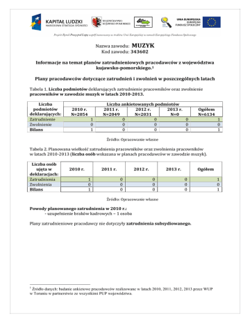 Nazwa zawodu: MUZYK Kod zawodu: 343602 Informacje na temat planów zatrudnieniowych pracodawców z województwa kujawsko-pomorskiego.1 Plany pracodawców dotyczące zatrudnień i zwolnień w poszczególnych latach Tabela 1. Liczba podmiotów deklarujących zatrudnienie pracowników oraz zwolnienie pracowników w zawodzie muzyk w latach 2010-2013. Liczba podmiotów deklarujących: Zatrudnienie Zwolnienie Bilans 2010 r. N=2054 1 0 1 Liczba ankietowanych podmiotów 2011 r. 2012 r. 2013 r. N=2049 N=2031 N=0 0 0 0 0 0 0 0 0 0 Ogółem N=6134 1 0 1 Źródło: Opracowanie własne Tabela 2. Planowana wielkość zatrudnienia pracowników oraz zwolnienia pracowników w latach 2010-2013 (liczba osób wskazana w planach pracodawców w zawodzie muzyk). Liczba osób ujęta w deklaracjach: Zatrudnienia Zwolnienia Bilans 2010 r. 2011 r. 1 0 1 2012 r. 0 0 0 2013 r. 0 0 0 Ogółem 0 0 0 Źródło: Opracowanie własne Powody planowanego zatrudnienia w 2010 r.: - uzupełnienie braków kadrowych – 1 osoba Plany zatrudnieniowe pracodawcy nie dotyczyły zatrudnienia subsydiowanego. 1 Źródło danych: badanie ankietowe pracodawców realizowane w latach 2010, 2011, 2012, 2013 przez WUP w Toruniu w partnerstwie ze wszystkimi PUP województwa. 1 0 1 DANE OGÓŁEM Z CZTERECH EDYCJI BADANIA – 2010, 2011, 2012, 2013; N=1 (liczba osób planowanych do zatrudnienia) Profil pracodawcy: 1. 1 osoba w zawodzie muzyk poszukiwana była w podmiocie dużym. 2. Pracodawca należał do sektora publicznego. 3. Oferta z sekcji: Działalność związana z kulturą, rozrywką i rekreacją Potrzeby pracodawców: Oczekiwania wobec kandydatów na stanowiska pracy w zawodzie muzyk: 1. Znajomość obsługi programów komputerowych Oferowane miejsce pracy nie wiązało się z wymaganiem znajomości obsługi komputera. 2. Znajomość języka obcego Znajomość języka nie była wymagana od kandydatów. 3. Ogólne doświadczenie zawodowe Pracodawca nie oczekiwał doświadczenia zawodowego. 4. Doświadczenie na podobnym stanowisku Na oferowanym stanowisku nie było wymagane wcześniejsze doświadczenie w zawodzie muzyka. 5. Cechy indywidualne Pracodawca nie wskazał żadnych cech indywidualnych, jakich będzie oczekiwał od kandydatów na stanowisko muzyka. 6. Wiedza specjalistyczna, ukończone dodatkowe specjalistyczne kursy, szkolenia Dodatkowe kwalifikacje nie były oczekiwane przez pracodawcę. 7. Prawo jazdy W przypadku oferowanego miejsca pracy prawo jazdy nie było wymagane. 8. Inne: Nie wskazywano.