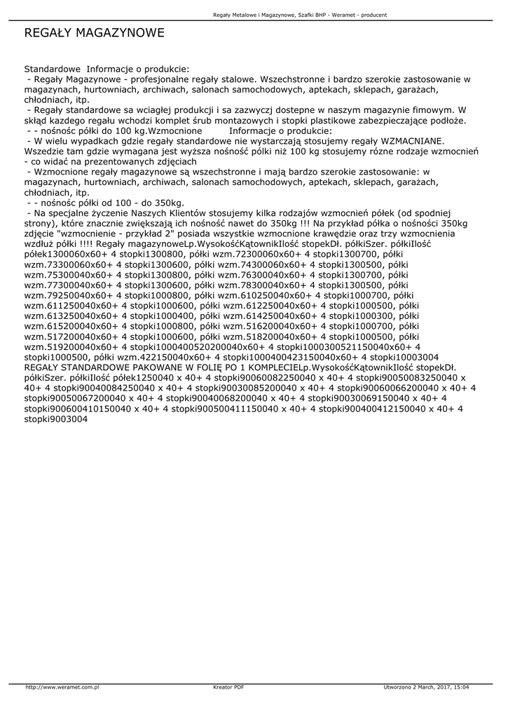 Regały Metalowe i Magazynowe, Szafki BHP - Weramet - producent REGAŁY MAGAZYNOWE Standardowe Informacje o produkcie: - Regały Magazynowe - profesjonalne regały stalowe. Wszechstronne i bardzo szerokie zastosowanie w magazynach, hurtowniach, archiwach, salonach samochodowych, aptekach, sklepach, garażach, chłodniach, itp. - Regały standardowe sa wciagłej produkcji i sa zazwyczj dostepne w naszym magazynie fimowym. W skłąd kazdego regału wchodzi komplet śrub montazowych i stopki plastikowe zabezpieczające podłoże. - - nośnośc półki do 100 kg.Wzmocnione Informacje o produkcie: - W wielu wypadkach gdzie regały standardowe nie wystarczają stosujemy regały WZMACNIANE. Wszedzie tam gdzie wymagana jest wyższa nośność pólki niż 100 kg stosujemy rózne rodzaje wzmocnień - co widać na prezentowanych zdjęciach - Wzmocnione regały magazynowe są wszechstronne i mają bardzo szerokie zastosowanie: w magazynach, hurtowniach, archiwach, salonach samochodowych, aptekach, sklepach, garażach, chłodniach, itp. - - nośnośc półki od 100 - do 350kg. - Na specjalne życzenie Naszych Klientów stosujemy kilka rodzajów wzmocnień półek (od spodniej strony), które znacznie zwiększają ich nośność nawet do 350kg !!! Na przykład półka o nośności 350kg zdjęcie "wzmocnienie - przykład 2" posiada wszystkie wzmocnione krawędzie oraz trzy wzmocnienia wzdłuż półki !!!! Regały magazynoweLp.WysokośćKątownikIlość stopekDł. półkiSzer. półkiIlość półek1300060x60+ 4 stopki1300800, półki wzm.72300060x60+ 4 stopki1300700, półki wzm.73300060x60+ 4 stopki1300600, półki wzm.74300060x60+ 4 stopki1300500, półki wzm.75300040x60+ 4 stopki1300800, półki wzm.76300040x60+ 4 stopki1300700, półki wzm.77300040x60+ 4 stopki1300600, półki wzm.78300040x60+ 4 stopki1300500, półki wzm.79250040x60+ 4 stopki1000800, półki wzm.610250040x60+ 4 stopki1000700, półki wzm.611250040x60+ 4 stopki1000600, półki wzm.612250040x60+ 4 stopki1000500, półki wzm.613250040x60+ 4 stopki1000400, półki wzm.614250040x60+ 4 stopki1000300, półki wzm.615200040x60+ 4 stopki1000800, półki wzm.516200040x60+ 4 stopki1000700, półki wzm.517200040x60+ 4 stopki1000600, półki wzm.518200040x60+ 4 stopki1000500, półki wzm.519200040x60+ 4 stopki1000400520200040x60+ 4 stopki1000300521150040x60+ 4 stopki1000500, półki wzm.422150040x60+ 4 stopki1000400423150040x60+ 4 stopki10003004 REGAŁY STANDARDOWE PAKOWANE W FOLIĘ PO 1 KOMPLECIELp.WysokośćKątownikIlość stopekDł. półkiSzer. półkiIlość półek1250040 x 40+ 4 stopki90060082250040 x 40+ 4 stopki90050083250040 x 40+ 4 stopki90040084250040 x 40+ 4 stopki90030085200040 x 40+ 4 stopki90060066200040 x 40+ 4 stopki90050067200040 x 40+ 4 stopki90040068200040 x 40+ 4 stopki90030069150040 x 40+ 4 stopki900600410150040 x 40+ 4 stopki900500411150040 x 40+ 4 stopki900400412150040 x 40+ 4 stopki9003004 http://www.weramet.com.pl Kreator PDF Utworzono 2 March, 2017, 15:04