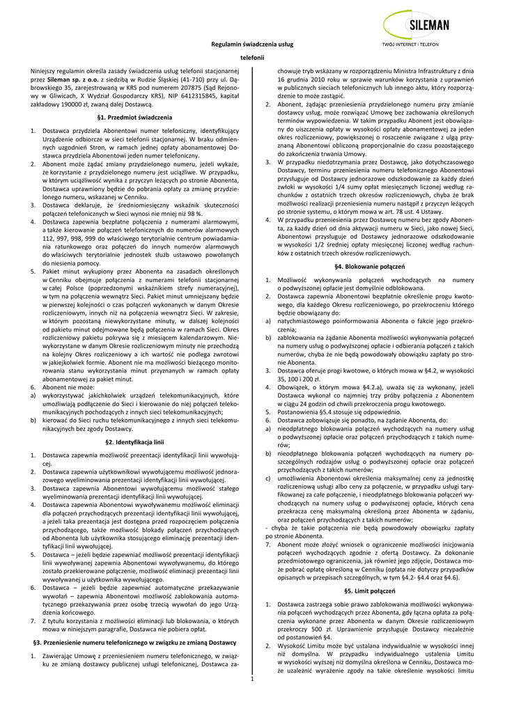 Regulamin świadczenia usług telefonii Niniejszy regulamin określa zasady świadczenia usług telefonii stacjonarnej przez Sileman sp. z o.o. z siedzibą w Rudzie Śląskiej (41-710) przy ul. Dąbrowskiego 35, zarejestrowaną w KRS pod numerem 207875 (Sąd Rejonowy w Gliwicach, X Wydział Gospodarczy KRS), NIP 6412315845, kapitał zakładowy 190000 zł, zwaną dalej Dostawcą. 2. §1. Przedmiot świadczenia 1. Dostawca przydziela Abonentowi numer telefoniczny, identyfikujący Urządzenie odbiorcze w sieci telefonii stacjonarnej. W braku odmiennych uzgodnień Stron, w ramach jednej opłaty abonamentowej Dostawca przydziela Abonentowi jeden numer telefoniczny. 2. Abonent może żądać zmiany przydzielonego numeru, jeżeli wykaże, że korzystanie z przydzielonego numeru jest uciążliwe. W przypadku, w którym uciążliwość wynika z przyczyn leżących po stronie Abonenta, Dostawca uprawniony będzie do pobrania opłaty za zmianę przydzielonego numeru, wskazanej w Cenniku. 3. Dostawca deklaruje, że średniomiesięczny wskaźnik skuteczności połączeń telefonicznych w Sieci wynosi nie mniej niż 98 %. 4. Dostawca zapewnia bezpłatne połączenia z numerami alarmowymi, a także kierowanie połączeń telefonicznych do numerów alarmowych 112, 997, 998, 999 do właściwego terytorialnie centrum powiadamiania ratunkowego oraz połączeń do innych numerów alarmowych do właściwych terytorialnie jednostek służb ustawowo powołanych do niesienia pomocy. 5. Pakiet minut wykupiony przez Abonenta na zasadach określonych w Cenniku obejmuje połączenia z numerami telefonii stacjonarnej w całej Polsce (poprzedzonymi wskaźnikiem strefy numeracyjnej), w tym na połączenia wewnątrz Sieci. Pakiet minut umniejszany będzie w pierwszej kolejności o czas połączeń wykonanych w danym Okresie rozliczeniowym, innych niż na połączenia wewnątrz Sieci. W zakresie, w którym pozostaną niewykorzystane minuty, w dalszej kolejności od pakietu minut odejmowane będą połączenia w ramach Sieci. Okres rozliczeniowy pakietu pokrywa się z miesiącem kalendarzowym. Niewykorzystane w danym Okresie rozliczeniowym minuty nie przechodzą na kolejny Okres rozliczeniowy a ich wartość nie podlega zwrotowi w jakiejkolwiek formie. Abonent nie ma możliwości bieżącego monitorowania stanu wykorzystania minut przyznanych w ramach opłaty abonamentowej za pakiet minut. 6. Abonent nie może: a) wykorzystywać jakichkolwiek urządzeń telekomunikacyjnych, które umożliwiają podłączenie do Sieci i kierowanie do niej połączeń telekomunikacyjnych pochodzących z innych sieci telekomunikacyjnych; b) kierować do Sieci ruchu telekomunikacyjnego z innych sieci telekomunikacyjnych bez zgody Dostawcy. 3. 4. §4. Blokowanie połączeń 1. Możliwość wykonywania połączeń wychodzących na numery o podwyższonej opłacie jest domyślnie odblokowana. 2. Dostawca zapewnia Abonentowi bezpłatnie określenie progu kwotowego, dla każdego Okresu rozliczeniowego, po przekroczeniu którego będzie obowiązany do: a) natychmiastowego poinformowania Abonenta o fakcie jego przekroczenia; b) zablokowania na żądanie Abonenta możliwości wykonywania połączeń na numery usług o podwyższonej opłacie i odbierania połączeń z takich numerów, chyba że nie będą powodowały obowiązku zapłaty po stronie Abonenta. 3. Dostawca oferuje progi kwotowe, o których mowa w §4.2, w wysokości 35, 100 i 200 zł. 4. Obowiązek, o którym mowa §4.2.a), uważa się za wykonany, jeżeli Dostawca wykonał co najmniej trzy próby połączenia z Abonentem w ciągu 24 godzin od chwili przekroczenia progu kwotowego. 5. Postanowienia §5.4 stosuje się odpowiednio. 6. Dostawca zobowiązuje się ponadto, na żądanie Abonenta, do: a) nieodpłatnego blokowania połączeń wychodzących na numery usług o podwyższonej opłacie oraz połączeń przychodzących z takich numerów; b) nieodpłatnego blokowania połączeń wychodzących na numery poszczególnych rodzajów usług o podwyższonej opłacie oraz połączeń przychodzących z takich numerów; c) umożliwienia Abonentowi określenia maksymalnej ceny za jednostkę rozliczeniową usługi albo ceny za połączenie, w przypadku usługi taryfikowanej za całe połączenie, i nieodpłatnego blokowania połączeń wychodzących na numery usług o podwyższonej opłacie, których cena przekracza cenę maksymalną określoną przez Abonenta w żądaniu, oraz połączeń przychodzących z takich numerów; - chyba że takie połączenia nie będą powodowały obowiązku zapłaty po stronie Abonenta. 7. Abonent może złożyć wniosek o ograniczenie możliwości inicjowania połączeń wychodzących zgodnie z ofertą Dostawcy. Za dokonanie przedmiotowego ograniczenia, jak również jego zdjęcie, Dostawca może pobrać opłatę określoną w Cenniku (opłata nie dotyczy przypadków opisanych w przepisach szczególnych, w tym §4.2- §4.4 oraz §4.6). §2. Identyfikacja linii 1. 2. 3. 4. 5. 6. 7. Dostawca zapewnia możliwość prezentacji identyfikacji linii wywołującej. Dostawca zapewnia użytkownikowi wywołującemu możliwość jednorazowego wyeliminowania prezentacji identyfikacji linii wywołującej. Dostawca zapewnia Abonentowi wywołującemu możliwość stałego wyeliminowania prezentacji identyfikacji linii wywołującej. Dostawca zapewnia Abonentowi wywoływanemu możliwość eliminacji dla połączeń przychodzących prezentacji identyfikacji linii wywołującej, a jeżeli taka prezentacja jest dostępna przed rozpoczęciem połączenia przychodzącego, także możliwość blokady połączeń przychodzących od Abonenta lub użytkownika stosującego eliminację prezentacji identyfikacji linii wywołującej. Dostawca – jeżeli będzie zapewniać możliwość prezentacji identyfikacji linii wywoływanej zapewnia Abonentowi wywoływanemu, do którego zostało przekierowane połączenie, możliwość eliminacji prezentacji linii wywoływanej u użytkownika wywołującego. 