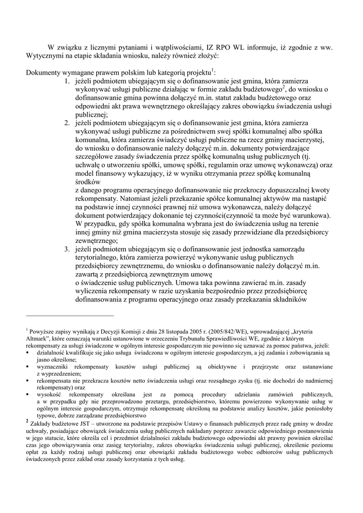 W związku z licznymi pytaniami i wątpliwościami, IZ RPO WL informuje, iŜ zgodnie z ww. Wytycznymi na etapie składania wniosku, naleŜy równieŜ złoŜyć: Dokumenty wymagane prawem polskim lub kategorią projektu1: 1. jeŜeli podmiotem ubiegającym się o dofinansowanie jest gmina, która zamierza wykonywać usługi publiczne działając w formie zakładu budŜetowego2, do wniosku o dofinansowanie gmina powinna dołączyć m.in. statut zakładu budŜetowego oraz odpowiedni akt prawa wewnętrznego określający zakres obowiązku świadczenia usługi publicznej; 2. jeŜeli podmiotem ubiegającym się o dofinansowanie jest gmina, która zamierza wykonywać usługi publiczne za pośrednictwem swej spółki komunalnej albo spółka komunalna, która zamierza świadczyć usługi publiczne na rzecz gminy macierzystej, do wniosku o dofinansowanie naleŜy dołączyć m.in. dokumenty potwierdzające szczegółowe zasady świadczenia przez spółkę komunalną usług publicznych (tj. uchwałę o utworzeniu spółki, umowę spółki, regulamin oraz umowę wykonawczą) oraz model finansowy wykazujący, iŜ w wyniku otrzymania przez spółkę komunalną środków z danego programu operacyjnego dofinansowanie nie przekroczy dopuszczalnej kwoty rekompensaty. Natomiast jeŜeli przekazanie spółce komunalnej aktywów ma nastąpić na podstawie innej czynności prawnej niŜ umowa wykonawcza, naleŜy dołączyć dokument potwierdzający dokonanie tej czynności(czynność ta moŜe być warunkowa). W przypadku, gdy spółka komunalna wybrana jest do świadczenia usług na terenie innej gminy niŜ gmina macierzysta stosuje się zasady przewidziane dla przedsiębiorcy zewnętrznego; 3. jeŜeli podmiotem ubiegającym się o dofinansowanie jest jednostka samorządu terytorialnego, która zamierza powierzyć wykonywanie usług publicznych przedsiębiorcy zewnętrznemu, do wniosku o dofinansowanie naleŜy dołączyć m.in. zawartą z przedsiębiorcą zewnętrznym umowę o świadczenie usług publicznych. Umowa taka powinna zawierać m.in. zasady wyliczenia rekompensaty w razie uzyskania bezpośrednio przez przedsiębiorcę dofinansowania z programu operacyjnego oraz zasady przekazania składników 1 PowyŜsze zapisy wynikają z Decyzji Komisji z dnia 28 listopada 2005 r. (2005/842/WE), wprowadzającej „kryteria Altmark”, które oznaczają warunki ustanowione w orzeczeniu Trybunału Sprawiedliwości WE, zgodnie z którym rekompensaty za usługi świadczone w ogólnym interesie gospodarczym nie powinno się uznawać za pomoc państwa, jeŜeli: działalność kwalifikuje się jako usługa świadczona w ogólnym interesie gospodarczym, a jej zadania i zobowiązania są jasno określone; wyznaczniki rekompensaty kosztów usługi publicznej są obiektywne i przejrzyste oraz ustanawiane z wyprzedzeniem; rekompensata nie przekracza kosztów netto świadczenia usługi oraz rozsądnego zysku (tj. nie dochodzi do nadmiernej rekompensaty) oraz wysokość rekompensaty określana jest za pomocą procedury udzielania zamówień publicznych, a w przypadku gdy nie przeprowadzono przetargu, przedsiębiorstwo, któremu powierzono wykonywanie usług w ogólnym interesie gospodarczym, otrzymuje rekompensatę określoną na podstawie analizy kosztów, jakie poniosłoby typowe, dobrze zarządzane przedsiębiorstwo 2 Zakłady budŜetowe JST – utworzone na podstawie przepisów Ustawy o finansach publicznych przez radę gminy w drodze uchwały, posiadające obowiązek świadczenia usług publicznych nakładany poprzez zawarcie odpowiedniego postanowienia w jego statucie, które określa cel i przedmiot działalności zakładu budŜetowego odpowiedni akt prawny powinien określać czas jego obowiązywania oraz zasięg terytorialny, zakres obowiązku świadczenia usługi publicznej, określenie poziomu opłat za kaŜdy rodzaj usługi publicznej oraz obowiązki zakładu budŜetowego wobec odbiorców usług publicznych świadczonych przez zakład oraz zasady korzystania z tych usług. 4. 3 majątkowych dofinansowanych z programu operacyjnego, jeśli dofinansowanie otrzymała jednostka samorządu terytorialnego. 3 • w przypadku, gdy dokonano juŜ we właściwym trybie wyboru operatora, a umowa o świadczenie usług publicznych nie została jeszcze zawarta, do wniosku o dofinansowanie naleŜy dołączyć dokument odzwierciedlający podstawowe załoŜenia umowy zgodne ze specyfikacją istotnych warunków zamówienia, • w przypadku, gdy jednostka samorządu terytorialnego nie dokonała jeszcze wyboru operatora we właściwym trybie, do wniosku o dofinansowanie naleŜy dołączyć harmonogram działań związanych z procedurą wyboru operatora oraz dokument odzwierciedlający podstawowe załoŜenia planowanej umowy. • w przypadku, gdy podmiotem ubiegającym się o dofinansowanie jest podmiot, który zawarł umowę o świadczenie usług publicznych przed ogłoszeniem Wytycznych nie spełniającą warunków określonych w Wytycznych, do wniosku o dofinansowanie naleŜy dołączyć umowę zmienioną w drodze aneksu, uwzględniającą m.in. reguły świadczenia usług publicznych. szczegółowa metodologia wyliczania: a) Rekompensaty, przez którą naleŜy rozumieć wszelkie przysporzenia (np. dotacje, zwolnienia podatkowe, wynagrodzenia, w tym wynagrodzenia otrzymywane na podstawie umowy o świadczenie usług publicznych), które otrzymuje beneficjent wyłącznie z tytułu i w celu pokrycia kosztów związanych ze świadczeniem usług publicznych. Zasady wyliczania rekompensaty znajdują się w Rozdziale 10 Wytycznych; oraz b) Rozsądnego zysku – który uwzględnia wszystkie lub niektóre przypadki wzrostu wydajności, osiągnięte przez dane przedsiębiorstwa w ustalonym ograniczonym okresie, bez obniŜania poziomu jakości usług powierzonych przedsiębiorstwu przez państwo członkowskie. Koszty, które naleŜy uwzględnić, obejmują całość kosztów poniesionych w związku z funkcjonowaniem usług świadczonych w ogólnym i