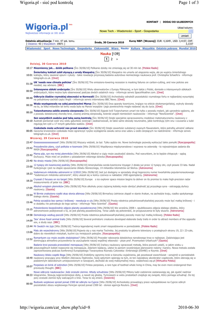 Wigoria.pl - sieć pod kontrolą Wigoria.pl Page 1 of 3 KONTAKT | DODAJ DO ULUBIONYCH beta Najświeższe informacje ze 181 stron Ostatnia aktualizacja: 7 min. 47 sek. temu. [ Ostatnie: 43 | Wszystkich: 19071 ] Układ kolumn: Nowe Tech. - Wiadomości - Sport - Gospodarka zmień Środa, 30 Czerwca 2010 Kursy NBP: [Wczoraj]: EUR: 4,1649 , USD: 3,4157, CHF: 3,1337 Wiadomości Sport Nowe Technologie Gospodarka Ciekawostki Wiara Nauka Kultura Wszystkie Ostatnio pobrane Mundial 2010 Nauka [139] 1 2 › Dzisiaj, 30 Czerwca 2010 10:17 Niezmienny jak… dziób pelikana [Śro 30/06/10] Pelikanie dzioby nie zmieniają się od 30 mln lat. [Polskie Radio] Śmiertelny koktail zabił słynącą z urody Kleopatrę [Śro 30/06/10] Kleopatra nie umarła od ukąszenia węża, ale po wypiciu śmiertelnego 10:01 koktajlu, który zawierał opium i cykuty - takie rewelacje przynoszą badania autorstwa niemieckiego naukowca prof. Christopha Schaefe'a - informuje telegraph.co.uk. [Onet] 01:38 UK 'needs new climate policies' [Śro 30/06/10] The emissions-lowering recession is masking failures on carbon-cutting, and new policies are needed, say advisors. [BBC] 00:50 Intensywne obłoki srebrzyste [Śro 30/06/10] Wielu obserwatorów z Europy Północnej, w tym także z Polski, doniosło o intensywnych obłokach srebrzystych, które można było obserwować podczas dwóch ostatnich nocy - informuje serwis SpaceWeather.com. [Onet] 00:40 Odkrycie śladów rzymskiej obecności w Kornwalii [Śro 30/06/10] Archeolodzy odnaleźli pozostałości rzymskiego fortu w najbardziej wysuniętej na południowy-zachód części Anglii - informuje serwis internetowy BBC News. [Onet] 00:30 Woda występowała na całej powierzchni Marsa [Śro 30/06/10] Dwa aparaty kosmiczne, krążące na orbicie okołomarsjańskiej, wykryły dowody na to, że kilka miliardów lat temu woda była na Marsie wszędzie i jego powierzchnia mogła nadawać się do życia. [Onet] 00:20 Tutanchamona zabiła anemia sierpowata [Śro 30/06/10] Egipski król Tutanchamon umarł nie tylko z powodu malarii, jak uprzednio sądzono, ale z powodu dziedzicznej choroby krwi, zwanej anemią sierpowatą, twierdzi zespół niemieckich naukowców - informuje "NewScientist". [Onet] Sen wszystkich ssaków pod taką samą kontrolą [Śro 30/06/10] Dzięki specjalnie opracowanemu modelowi matematycznemu naukowcy z 00:10 Australii porównali wzór snu wielu gatunków zwierząt i zaobserwowali, że takie same obwody neuronalne, jakie kontrolują rytm snu i czuwania u ludzi regulują ten cykl u 17 innych gatunków ssaków. [Onet] Czekolada może uchronić nas przed zawałem [Śro 30/06/10] Dzięki zawartości substancji zwanych flawanolami, które potrafią udrożnić zatkane 00:05 naczynia krwionośne czekolada może ograniczyć ryzyko wystąpienia zawału serca oraz udaru u osób cierpiących na nadciśnienie - informuje serwis telegraph.co.uk. [Onet] Wczoraj, 29 Czerwca 2010 23:47 Goooooooooooooooool! [Wto 29/06/10] Wszyscy widzieli, że był. Tylko sędzia nie. Nowe technologie pozwolą wykluczyć takie pomyłki [Rzeczpospolita] 23:42 Prezydenckie plany, czyli polityka w kosmosie [Wto 29/06/10] Współpraca międzynarodowa i wyprawa na asteroidę - to najważniejsze zadania dla NASA [Rzeczpospolita] 23:42 Mama pije, syn ma mniej plemników [Wto 29/06/10] Alkohol w ciąży może zaszkodzić dziecku. Pod warunkiem, że to będzie chłopczyk - sądzą Duńczycy. Może mieć on problem z posiadaniem własnego dziecka [Rzeczpospolita] 23:40 Na straży miasta [Wto 29/06/10] [Rzeczpospolita] 23:00 12 tysięcy dni kosmicznej podróży [Wto 29/06/10] Amerykańska sonda kosmiczna Voyager 2 działa już przez 12 tysięcy dni, czyli prawie 33 lata. Nadal funkcjonuje i jest na etapie opuszczania Układu Słonecznego, 14 miliardów kilometrów od Słońca. [Astronomia] 18:23 Vademecum miłośnika astronomii nr 2/2010 [Wto 29/06/10] Jest już dostępny w sprzedaży drugi tegoroczny numer kwartalnika popularnonaukowego "Vademecum miłośnika astronomii", który ukazał się w końcu czerwca w nakładzie 1400 egzemplarzy. [Astronomia] 18:20 Cryosat-2 focuses on ice target [Wto 29/06/10] Europe s ice explorer space mission begins to deliver on its promise to make high-precision radar measurements of polar ice. [BBC] 17:05 Alkohol wrogiem plemników [Wto 29/06/10] Picie alkoholu przez ciężarną kobietę może obniżyć płodność jej przyszłego syna - ostrzegają duńscy naukowcy. [Gazeta] 15:54 W Birmie znaleziono rzadki okaz słonia albinosa [Wto 29/06/10] Birmańscy żołnierze złapali w stanie Arakan, na zachodzie kraju, rzadko spotykanego białego słonia. [Gazeta] 15:46 Pełnia szczęścia bez samca i królowej - rewolucja w ulu [Wto 29/06/10] Prosta robotnica południowoafrykańskiej pszczoły może być matką królowej - i w dodatku nie potrzebuje do tego samca - informuje "New Scientist". [Gazeta] 15:15 Potwierdzono bezpośrednie zdjęcie planety pozasłonecznej [Wto 29/06/10] We wrześniu 2008 r. opublikowano zdjęcia słabego obiektu, który astronomowie podejrzewali o to, że jest planetą pozasłoneczną. Teraz udało się potwierdzić, że przypuszczenia te były słuszne. [Astronomia] 14:58 Demokracja według pszczół [Wto 29/06/10] Prosta robotnica południowoafrykańskiej pszczoły może być matką królowej. [Polskie Radio] 14:09 'Sex' drove fossil animal traits [Wto 29/06/10] Several prehistoric creatures developed elaborate body traits in order to attract members of the opposite sex, a study says. [BBC] 13:44 Mr Swatch nie żyje [Wto 29/06/10] Twórca legendarnej marki zmarł niespodziewnie w poniedziałek. [Polskie Radio] 13:06 Mały ale wszechstronny [Wto 29/06/10] Pojawia się u nas marka Technika. Jej produkty to głównie telewizory o przekątnych ekranu 19, 22 i 23-cale, dobre do niewielkich mieszkań, kuchni czy mniejszych pokojów. [Rzeczpospolita] 12:52 Romantyzm czy może zwykłe złodziejstwo? [Wto 29/06/10] Proceder rabowania dziedzictwa narodowego trwa w na