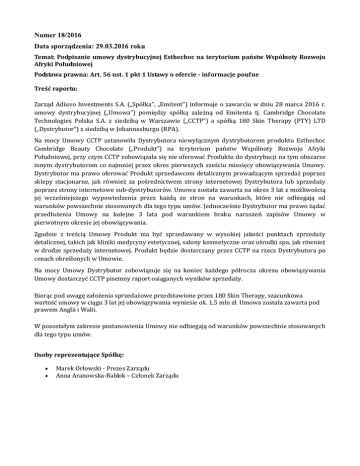 Numer 18/2016 Data sporządzenia: 29.03.2016 roku Temat: Podpisanie umowy dystrybucyjnej Esthechoc na terytorium państw Wspólnoty Rozwoju Afryki Południowej Podstawa prawna: Art. 56 ust. 1 pkt 1 Ustawy o ofercie - informacje poufne Treść raportu: Zarząd Adiuvo Investments S.A. („Spółka”, „Emitent”) informuje o zawarciu w dniu 28 marca 2016 r. umowy dystrybucyjnej („Umowa”) pomiędzy spółką zależną od Emitenta tj. Cambridge Chocolate Technologies Polska S.A. z siedzibą w Warszawie („CCTP”) a spółką 180 Skin Therapy (PTY) LTD („Dystrybutor”) z siedzibą w Johannesburgu (RPA). Na mocy Umowy CCTP ustanowiła Dystrybutora niewyłącznym dystrybutorem produktu Esthechoc Cambridge Beauty Chocolate („Produkt”) na terytorium państw Wspólnoty Rozwoju Afryki Południowej, przy czym CCTP zobowiązała się nie oferować Produktu do dystrybucji na tym obszarze innym dystrybutorom co najmniej przez okres pierwszych sześciu miesięcy obowiązywania Umowy. Dystrybutor ma prawo oferować Produkt sprzedawcom detalicznym prowadzącym sprzedaż poprzez sklepy stacjonarne, jak również za pośrednictwem strony internetowej Dystrybutora lub sprzedaży poprzez strony internetowe sub-dystrybutorów. Umowa została zawarta na okres 3 lat z możliwością jej wcześniejszego wypowiedzenia przez każdą ze stron na warunkach, które nie odbiegają od warunków powszechnie stosowanych dla tego typu umów. Jednocześnie Dystrybutor ma prawo żądać przedłużenia Umowy na kolejne 3 lata pod warunkiem braku naruszeń zapisów Umowy w pierwotnym okresie jej obowiązywania. Zgodnie z treścią Umowy Produkt ma być sprzedawany w wysokiej jakości punktach sprzedaży detalicznej, takich jak kliniki medycyny estetycznej, salony kosmetyczne oraz ośrodki spa, jak również w drodze sprzedaży internetowej. Produkt będzie dostarczany przez CCTP na rzecz Dystrybutora po cenach określonych w Umowie. Na mocy Umowy Dystrybutor zobowiązuje się na koniec każdego półrocza okresu obowiązywania Umowy dostarczyć CCTP pisemny raport osiąganych wyników sprzedaży. Biorąc pod uwagę założenia sprzedażowe przedstawione przez 180 Skin Therapy, szacunkowa wartość umowy w ciągu 3 lat jej obowiązywania wyniesie ok. 1,5 mln zł. Umowa została zawarta pod prawem Anglii i Walii. W pozostałym zakresie postanowienia Umowy nie odbiegają od warunków powszechnie stosowanych dla tego typu umów. Osoby reprezentujące Spółkę: Marek Orłowski - Prezes Zarządu Anna Aranowska-Bablok – Członek Zarządu