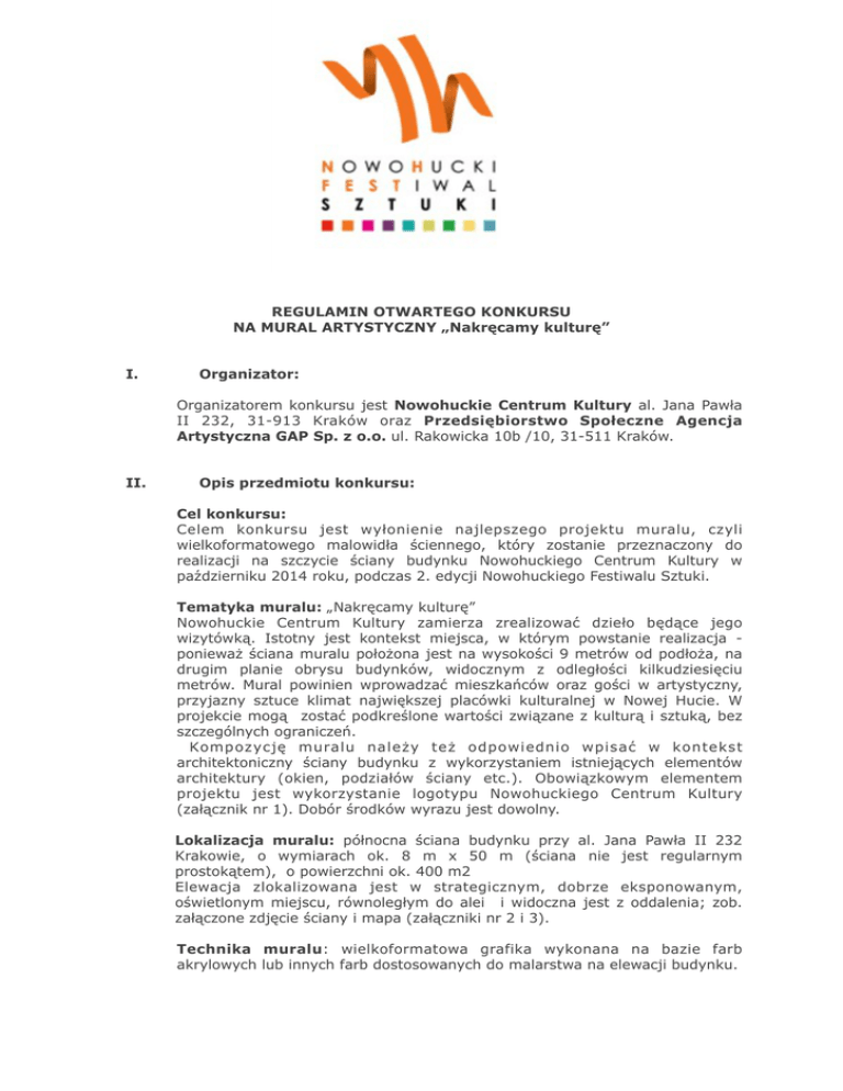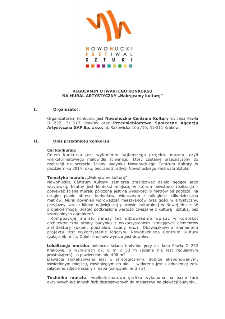 REGULAMIN OTWARTEGO KONKURSU NA MURAL ARTYSTYCZNY „Nakręcamy kulturę” ! ! ! I. Organizator: Organizatorem konkursu jest Nowohuckie Centrum Kultury al. Jana Pawła II 232, 31-913 Kraków oraz Przedsiębiorstwo Społeczne Agencja Artystyczna GAP Sp. z o.o. ul. Rakowicka 10b /10, 31-511 Kraków. ! II. ! ! Opis przedmiotu konkursu: Cel konkursu: Celem konkursu jest wyłonienie najlepszego projektu muralu, czyli wielkoformatowego malowidła ściennego, który zostanie przeznaczony do realizacji na szczycie ściany budynku Nowohuckiego Centrum Kultury w październiku 2014 roku, podczas 2. edycji Nowohuckiego Festiwalu Sztuki. ! ! Tematyka muralu: „Nakręcamy kulturę” Nowohuckie Centrum Kultury zamierza zrealizować dzieło będące jego wizytówką. Istotny jest kontekst miejsca, w którym powstanie realizacja ponieważ ściana muralu położona jest na wysokości 9 metrów od podłoża, na drugim planie obrysu budynków, widocznym z odległości kilkudziesięciu metrów. Mural powinien wprowadzać mieszkańców oraz gości w artystyczny, przyjazny sztuce klimat największej placówki kulturalnej w Nowej Hucie. W projekcie mogą zostać podkreślone wartości związane z kulturą i sztuką, bez szczególnych ograniczeń. Kompozycję muralu należy też odpowiednio wpisać w kontekst architektoniczny ściany budynku z wykorzystaniem istniejących elementów architektury (okien, podziałów ściany etc.). Obowiązkowym elementem projektu jest wykorzystanie logotypu Nowohuckiego Centrum Kultury (załącznik nr 1). Dobór środków wyrazu jest dowolny. Lokalizacja muralu: północna ściana budynku przy al. Jana Pawła II 232 Krakowie, o wymiarach ok. 8 m x 50 m (ściana nie jest regularnym prostokątem), o powierzchni ok. 400 m2 Elewacja zlokalizowana jest w strategicznym, dobrze eksponowanym, oświetlonym miejscu, równoległym do alei i widoczna jest z oddalenia; zob. załączone zdjęcie ściany i mapa (załączniki nr 2 i 3). ! ! Technika muralu: wielkoformatowa grafika wykonana na bazie farb akrylowych lub innych farb dostosowanych do malarstwa na elewacji budynku. ! ! III. 1. Konkurs ma charakter otwarty. 2. Uczestnikiem konkursu mogą być pełnoletnie osoby fizyczne z Polski lub obcokrajowcy, zespoły autorskie, które będą związane umową w celu realizacji wspólnego przedsięwzięcia. W odniesieniu do prac zespołowych warunkiem uczestnictwa w Konkursie jest jednoznaczne wskazanie reprezentanta zespołu, upoważnionego do występowania w imieniu jego członków. 3. Przepisy dotyczące uczestników stosuje się odpowiednio do uczestników biorących wspólnie udział w konkursie. 4. Organizator oraz członkowie jury i ich najbliższe rodziny nie mogą brać udziału w konkursie ani pomagać uczestnikom. 5. Wszyscy uczestnicy otrzymują taki sam pakiet materiałów informacyjnych. 6. Zgłoszenie projektu jest bezpłatne. 7. Uczestnicy mogą zgłosić do konkursu więcej niż jeden projekt, w tym przypadku każdy projekt powinien być dostarczony pocztą elektroniczną na adres: [email protected] 8. Projekty powinny być przedłożone w formie elektronicznej w pliku JPEG. Projekt powinien się składać z dwóch części: wizualizacji muralu oraz osobnego pliku z projektem. Do projektu należy załączyć Kartę zgłoszeniową (załącznik nr 4) oraz kosztorys jego realizacji. 9. Uczestnik wyraża zgodę na przetwarzanie danych osobowych dla potrzeb konkursu oraz, w przypadku wygranej, na podanie imienia i nazwiska do wiadomości publicznej. !! IV. Termin i miejsce nadsyłania prac: 1. Prace konkursowe wraz z dokładnie i czytelnie wypełnioną Kartą zgłoszeniową (załącznik nr 4) i kosztorysem realizacji należy przesłać w nieprzekraczalnym terminie do dnia 30 czerwca 2014 r. do godz. 24.00. !! V. 1. 2. ! ! !! ! Warunki uczestnictwa: Sposób oceniania prac konkursowych: ! Zgłoszone do Konkursu projekty zostaną ocenione pod względem wymogów formalnych przez komisję kwalifikacyjną powołaną przez organizatora. Jury dokona oceny prac pod kątem walorów artystycznych. Decyzje komisji kwalifikacyjnej i jury są ostateczne i niepodważalne. Od werdyktu jury nie przysługuje odwołanie. ! VI. Nagrody: 1. 2. VII. 1. 2. 2.000 zł Realizacja projektu podczas 2. Nowohuckiego Festiwalu Sztuki. Sposób podania wyników konkursu do publicznej wiadomości: Wyniki konkursu zostaną ogłoszone na oficjalnej stronie internetowej o r g a n i z a t o r ó w w w w. n o w o h u c k i f e s t i wa l s z t u k i . p l o ra z f a c e b o o k u : www.facebook.com/nowohuckifestiwalsztuki. Laureat konkursu zostanie dodatkowo poinformowany o wynikach pocztą elektroniczną. Z laureatem nagrodzonej pracy organizator podpisze umowę o przeniesieniu własności projektu muralu oraz o przejściu autorskich praw majątkowych do projektu. Przyznana nagroda stanowi wynagrodzenie za przeniesienie własności i nabycie autorskich praw majątkowych do muralu. ! VIII. !! Harmonogram Konkursu: Etap Termin Ogłoszenie konkursu 7 maja 2014 r. Przyjmowanie prac konkursowych 7 maja- 30 czerwca 2014 r. Obrady Jury 3 lipca 2014 r. Ogłoszenie zwycięskiego projektu 7 lipca 2014 r. Realizacja projektu 1 – 5 października 2014 r. !! ! !! ! !! ! IX. Unieważnienie konkursu: 1. X. Organizator zastrzega sobie prawo do unieważnienia konkursu w przypadku: a. gdy nie wpłynie żadna praca konkursowa, b. gdy żadna z dostarczonych prac konkursowych nie spełni warunków regulaminu, c. niezadowalającego poziomu artystycznego prac konkursowych. Postanowienia końcowe: 1. Przystąpienie do konkursu jest równoznaczne z akceptacją niniejszego regulaminu. 2. Przystąpienie do konkursu jest równoznaczne z wyrażeniem zgody na nieodpłatną publikację prac wszelkiego rodzaju w mediach. 3. Organizator zastrzega sobie prawo do zmian w terminach podanych w regulaminie. 4. Organizator konkursu zastrzega sobie prawo do korekty zwycięskiego projektu, po konsultacji z autorem, w celu ostatecznego przystosowania go do real