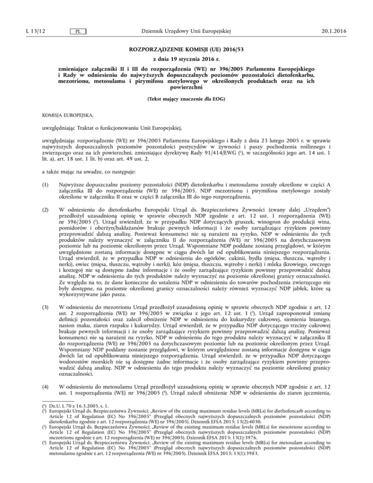 L 13/12 Dziennik Urzędowy Unii Europejskiej PL 20.1.2016 ROZPORZĄDZENIE KOMISJI (UE) 2016/53 z dnia 19 stycznia 2016 r. zmieniające załączniki II i III do rozporządzenia (WE) nr 396/2005 Parlamentu Europejskiego i Rady w odniesieniu do najwyższych dopuszczalnych poziomów pozostałości dietofenkarbu, mezotrionu, metosulamu i pirymifosu metylowego w określonych produktach oraz na ich powierzchni (Tekst mający znaczenie dla EOG) KOMISJA EUROPEJSKA, uwzględniając Traktat o funkcjonowaniu Unii Europejskiej, uwzględniając rozporządzenie (WE) nr 396/2005 Parlamentu Europejskiego i Rady z dnia 23 lutego 2005 r. w sprawie najwyższych dopuszczalnych poziomów pozostałości pestycydów w żywności i paszy pochodzenia roślinnego i zwierzęcego oraz na ich powierzchni, zmieniające dyrektywę Rady 91/414/EWG (1), w szczególności jego art. 14 ust. 1 lit. a), art. 18 ust. 1 lit. b) oraz art. 49 ust. 2, a także mając na uwadze, co następuje: (1) Najwyższe dopuszczalne poziomy pozostałości (NDP) dietofenkarbu i metosulamu zostały określone w części A załącznika III do rozporządzenia (WE) nr 396/2005. NDP mezotrionu i pirymifosu metylowego zostały określone w załączniku II oraz w części B załącznika III do tego rozporządzenia. (2) W odniesieniu do dietofenkarbu Europejski Urząd ds. Bezpieczeństwa Żywności (zwany dalej „Urzędem”) przedłożył uzasadnioną opinię w sprawie obecnych NDP zgodnie z art. 12 ust. 1 rozporządzenia (WE) nr 396/2005 (2). Urząd stwierdził, że w przypadku NDP dotyczących gruszek, winogron do produkcji wina, pomidorów i oberżyn/bakłażanów brakuje pewnych informacji i że osoby zarządzające ryzykiem powinny przeprowadzić dalszą analizę. Ponieważ konsumenci nie są narażeni na ryzyko, NDP w odniesieniu do tych produktów należy wyznaczyć w załączniku II do rozporządzenia (WE) nr 396/2005 na dotychczasowym poziomie lub na poziomie określonym przez Urząd. Wspomniane NDP poddane zostaną przeglądowi, w którym uwzględnione zostaną informacje dostępne w ciągu dwóch lat od opublikowania niniejszego rozporządzenia. Urząd stwierdził, że w przypadku NDP w odniesieniu do ogórków, cukinii, bydła (mięsa, tłuszczu, wątroby i nerki), owiec (mięsa, tłuszczu, wątroby i nerki), kóz (mięsa, tłuszczu, wątroby i nerki) i mleka (krowiego, owczego i koziego) nie są dostępne żadne informacje i że osoby zarządzające ryzykiem powinny przeprowadzić dalszą analizę. NDP w odniesieniu do tych produktów należy wyznaczyć na poziomie określonej granicy oznaczalności. Ze względu na to, że dane konieczne do ustalenia NDP w odniesieniu do towarów pochodzenia zwierzęcego nie były dostępne, na poziomie określonej granicy oznaczalności należy również wyznaczyć NDP jabłek, które są wykorzystywane jako pasza. (3) W odniesieniu do mezotrionu Urząd przedłożył uzasadnioną opinię w sprawie obecnych NDP zgodnie z art. 12 ust. 2 rozporządzenia (WE) nr 396/2005 w związku z jego art. 12 ust. 1 (3). Urząd zaproponował zmianę definicji pozostałości oraz zalecił obniżenie NDP w odniesieniu do kukurydzy cukrowej, siemienia lnianego, nasion maku, ziaren rzepaku i kukurydzy. Urząd stwierdził, że w przypadku NDP dotyczącego trzciny cukrowej brakuje pewnych informacji i że osoby zarządzające ryzykiem powinny przeprowadzić dalszą analizę. Ponieważ konsumenci nie są narażeni na ryzyko, NDP w odniesieniu do tego produktu należy wyznaczyć w załączniku II do rozporządzenia (WE) nr 396/2005 na dotychczasowym poziomie lub na poziomie określonym przez Urząd. Wspomniany NDP poddany zostanie przeglądowi, w którym uwzględnione zostaną informacje dostępne w ciągu dwóch lat od opublikowania niniejszego rozporządzenia. Urząd stwierdził, że w przypadku NDP dotyczącego wodorostów morskich nie są dostępne żadne informacje i że osoby zarządzające ryzykiem powinny przepro wadzić dalszą analizę. NDP w odniesieniu do tego produktu należy wyznaczyć na poziomie określonej granicy oznaczalności. (4) W odniesieniu do metosulamu Urząd przedłożył uzasadnioną opinię w sprawie obecnych NDP zgodnie z art. 12 ust. 1 rozporządzenia (WE) nr 396/2005 (4). Urząd zalecił obniżenie NDP w odniesieniu do ziaren jęczmienia, (1) Dz.U. L 70 z 16.3.2005, s. 1. (2) Europejski Urząd ds. Bezpieczeństwa Żywności; „Review of the existing maximum residue levels (MRLs) for diethofencarb according to Article 12 of Regulation (EC) No 396/2005” (Przegląd obecnych najwyższych dopuszczalnych poziomów pozostałości (NDP) dietofenkarbu zgodnie z art. 12 rozporządzenia (WE) nr 396/2005). Dziennik EFSA 2015; 13(2):4030. (3) Europejski Urząd ds. Bezpieczeństwa Żywności; „Review of the existing maximum residue levels (MRLs) for mesotrione according to Article 12 of Regulation (EC) No 396/2005” (Przegląd obecnych najwyższych dopuszczalnych poziomów pozostałości (NDP) mezotrionu zgodnie z art. 12 rozporządzenia (WE) nr 396/2005). Dziennik EFSA 2015; 13(1):3976. 4 ( ) Europejski Urząd ds. Bezpieczeństwa Żywności; „Review of the existing maximum residue levels (MRLs) for metosulam according to Article 12 of Regulation (EC) No 396/2005” (Przegląd obecnych najwyższych dopuszczalnych poziomów pozostałości (NDP) metosulamu zgodnie z art. 12 rozporządzenia (WE) nr 396/2005). Dziennik EFSA 2015; 13(1):3983. 20.1.2016 PL Dziennik Urzędowy Unii Europejskiej L 13/13 kukurydzy, owsa zwyczajnego, żyta zwyczajnego i pszenicy zwyczajnej. Urząd stwierdził, że w przypadku NDP dotyczących owoców ziarnkowych, owoców pestkowych, winogron stołowych, winogron do produkcji wina, truskawek, owoców leśnych, pozostałych drobnych owoców i jagód, ziemniaków i kukurydzy cukrowej brakuje pewnych informacji i że osoby zarządzające ryzykiem powinny przeprowadzić dalszą analizę. Ponieważ konsumenci nie są narażeni na ryzyko, NDP w odniesieniu do tych produktów należy wy