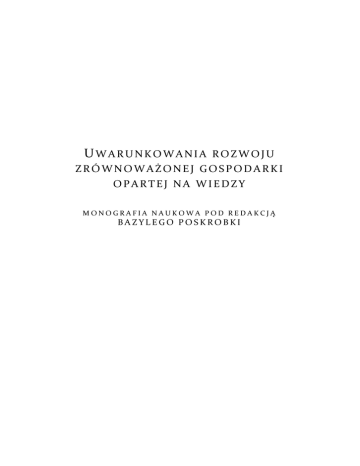 UWARUNKOWANIA ROZWOJU ZRÓWNOWAŻONEJ GOSPODARKI OPARTEJ NA WIEDZY MONOGRAFIA NAUKOWA POD REDAKCJĄ BAZYLEGO POSKROBKI R ADA P ROGRAMOWA Aleksander Busłowski, Robert Ciborowski, Wojciech Florkowski, Kazimierz Górka, Ryszard Cz. Horodeński (przewodniczący), Grażyna Klamecka-Roszkowska, Tchon Li, Tadeusz Markowski, Edward Ozorowski, Włodzimierz Pawluczuk, Bazyli Poskrobko, Andrzej Sadowski, Ryszard Skarzyński, Zbigniew Strzelecki, Henryk Wnorowski, Jan Zarzecki Publikację przygotowano w ramach projektu „Program upowszechniania osiągnięć nauki w zakresie zrównoważonego rozwoju i gospodarki opartej na wiedzy” Projekt współfinansowany przez Unię Europejską w ramach Europejskiego Funduszu Społecznego nr umowy UDA-POKL.04.02.00-00-081/08-00 PUBLIKACJA ROZPOWSZECHNIANA BEZPŁATNIE UWARUNKOWANIA ROZWOJU ZRÓWNOWAŻONEJ GOSPODARKI OPARTEJ NA WIEDZY CONDITIONINGS OF THE DEVELOPMENT OF SUSTAINABLE KNOWLEDGE-BASED ECONOMY MONOGRAFIA NAUKOWA POD REDAKCJĄ BAZYLEGO POSKROBKI SCIENTIFIC MONOGRAPH EDITED BY BAZYLI POSKROBKO Wyższa Szkoła Ekonomiczna Białystok School of Economics Białystok 2011 r e c e n z e n c i prof. dr hab. Piotr Jeżowski dr hab. Dariusz Kiełczewski prof. Uniwersytetu w Białymstoku c o p y r i g h t © b y Wyższa Szkoła Ekonomiczna Białystok 2011 I S B N 978-83-61247-52-4 redaktor: Janina Demianowicz korektor: Zespół autor okładki: Krystyna Krakówka (grafika Tudor Antoral Adrian / 123rf.com) skład: Agencja Wydawnicza EkoPress tel. 601 311 838 e-mail: [email protected] druk i oprawa: PRINT GROUP Sp. z o.o. Szczecin tel. 91 812-43-49 s p i s t r e ś c i WSTĘP (Bazyli Poskrobko) ........................................................................................................................................ 9 TEORETYCZNE ASPEKTY KSZTAŁTOWANIA ROZWOJU ZRÓWNOWAŻONEJ GOSPODARKI OPARTEJ NA WIEDZY 1. Racjonalność a natura ludzka (Dariusz Pieńkowski) ......................................................................... 14 2. Kulturowe uwarunkowania rozwoju zrównoważonej gospodarki opartej na wiedzy (Gerhard Banse, Oliver Parodi) ..................................................................................................................... 31 3. 4. Instytucje a rozwój gospodarki opartej na wiedzy (Anna Chmielak) .......................................... 47 Kategoria czasu w ekonomii zrównoważonego rozwoju oraz gospodarce opartej na wiedzy (Stanisław Czaja) ...................................................................... 59 5. Kategoria efektów zewnętrznych w ujęciu instytucjonalnym i zrównoważonym (Katarzyna Poskrobko) .................................................................................................................................... 75 NARZĘDZIA KSZTAŁTOWANIA ZRÓWNOWAŻONEJ GOSPODARKI OPARTEJ NA WIEDZY 6. Narzędzia konsumpcji zrównoważonej (Dariusz Kiełczewski) ...................................................... 96 7. Mnożnik cztery jako zasób wiedzy dla urzeczywistniania rozwoju niszowego (Franciszek Piontek) ...................................................................................................................................... 110 8. Rola systemów sprawozdawczych o poziomie zrównoważenia gospodarki opartej na wiedzy (Hans Diefenbacher, Marta Wachowiak) ......................................................... 124 9. Badania foresight na rzecz wdrażania zrównoważonego rozwoju (Joanna Ejdys, Agata Lulewicz-Sas) ......................................................................................................... 145 Sytuacja kryzysowa jako bodziec zmian w gospodarce (Marcin Łuszczyk) ........................... 163 10. KAPITAŁ LUDZKI W ZRÓWNOWAŻONEJ GOSPODARCE OPARTEJ NA WIEDZY 11. 12. Człowiek i społeczeństwo w koncepcji zrównoważonego rozwoju (Konrad Prandecki) ........................................................................................................................................ 180 Kształtowanie kompetencji społecznych w procesie edukacji na rzecz gospodarki opartej na wiedzy (Jan Fazlagić).............................................................................................................. 193 13. Kształcenie ustawiczne determinantą gospodarki opartej na wiedzy (Anna Bagieńska)............................................................................................................................................ 208 14. Kapitał ludzki szansą rozwoju zrównoważonej gospodarki opartej na wiedzy (Anna Linowska) ............................................................................................................................................. 227 5 ZRÓWNOWAŻONA GOSPODARKA OPARTA NA WIEDZY NA POZIOMIE MIKROEKONOMICZNYM 15. 16. Informacja, wiedza i mądrość we współczesnej gospodarce (Anna Kozłowska) ................ 248 Możliwości i efekty wykorzystania talentów pracowników w organizacji (Mieczysław Morawski) ................................................................................................................................ 265 17. Nowe formy organizacji w zrównoważonej gospodarce opartej na wiedzy (Małgorzata Ciesielska) ................................................................................................................................ 283 18. Zarządzanie wiedzą w warunkach przełomowych technologii informacyjno-komunikacyjnych i towarzyszących im zjawisk społecznych (Katarzyna Bachnik)...................................................................................................................................... 297 DYSKURS W SPRAWIE ZRÓWNOWAŻONEGO ROZWOJU 19. Rozwój trwały – czynniki sprzyjające i niesprzyjające (Lech W. Zacher) ............................... 310 20. Dyskurs ekologiczny – między teorią a praktyką (Lech W. Zacher) .......................................... 325 21. Zrównoważony rozwój oparty na wiedzy a budowanie tożsamości regio