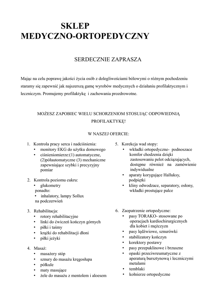 SKLEP MEDYCZNO-ORTOPEDYCZNY SERDECZNIE ZAPRASZA Mając na celu poprawę jakości życia osób z dolegliwościami bólowymi o różnym pochodzeniu staramy się zapewnić jak najszerszą gamę wyrobów medycznych o działaniu profilaktycznym i leczniczym. Promujemy profilaktykę i zachowania prozdrowotne. MOŻESZ ZAPOBIEC WIELU SCHORZENIOM STOSUJĄC ODPOWIEDNIĄ PROFILAKTYKĘ! W NASZEJ OFERCIE: 1. Kontrola pracy serca i nadciśnienia: • monitory EKG do użytku domowego • ciśnieniomierze:(1) automatyczne, (2)półautomatyczne (3) mechaniczne zapewniające szybki i precyzyjny pomiar 2. Kontrola poziomu cukru: • glukometry ponadto: • inhalatory, lampy Sollux na podczerwień 3. Rehabilitacja: • rotory rehabilitacyjne • linki do ćwiczeń kończyn górnych • piłki i taśmy • krążki do rehabilitacji dłoni • piłki jeżyki 4. Masaż: • masażery stóp • sznury do masażu kręgosłupa • półkule • maty masujące • żele do masażu z mentolem i aloesem 5. Korekcja wad stopy: • wkładki ortopedyczne- podnoszace komfor chodzenia dzięki zastosowaniu pelot odciązających, dostępne również na zamówienie indywidualne • aparaty korygujące Halluksy, podpiętki • kliny odwodzace, separatory, osłony, wkładki prostujące palce 6. Zaopatrzenie ortopedyczne: • pasy TORAKO- stosowane po operacjach kardiochirurgicznych dla kobiet i mężczyzn • pasy lędźwiowe, sznurówki • stabilizatory kończyn • korektory postawy • pasy przepuklinowe i brzuszne • opaski przeciwreumatyczne z aperaturą bursztynową i leczniczymi metalami • temblaki • kołnierze ortopedyczne 7. Wyroby p/żylakowe: stosowane w profilaktyce i leczeniu niewydolności krążenia kończyn dolnych • podkolanówki • rajstopy • pończochy • skarpety męskie 8. Specjalistyczne opatrunki nowej generacji • do leczenia trudno gojących się ran, owrzodzeń, oparzeń i odleżyn 11. Termoterapia: • poduszki elektryczne, termofory • kompresy żelowe, okłady ogrzewające 12. Pielęgnacja skóry: • kremy • płyny do masażu skóry • oliwki • pianki myjące • chusteczki nawilżające 13. Poduszki ortopedyczne: wykonane z nowoczesnych pianek, również alergików • zdrowotne materace • maty i poduszki wypełnione łuską gryki i gorcząca białą • poduszki do aromaterapii 9. Sprzęt pomocniczy • uchwyty • krzesełka prysznicowe • ławeczki wannowe • nasadki toaletowe 10. Sprzęt rehabilitacyjny: • wózki, balkoniki, chodziki, kule łokciowe i akcesoria do kul, 14. Inkontynencja: • wkładki anionowe i urologiczne dla kobiet i mężczyzn • pieluchy anatomiczne • cewniki urologiczne • worki do zbiórki moczu * OFERUJEMY WYROBY MEDYCZNE RENOMOWANYCH PRODUCENTÓW * SKORZYSTAJ Z POMOCY W DOBORZE ODPOWIEDNIEGO ZAOPATRZENIA ORTOPEDYCZNEGO I ZAPYTAJ O PROCEDURĘ REFUNDACJI NFZ *ZAPYTAJ O BEZPŁATNE SZKOLENIA Z ZAKRESU PROFILAKTYKI ZDROWOTNEJ PROWADZIMY SPRZEDAŻ WYSYŁKOWĄ NA TERENIE CAŁEGO KRAJU ZAPRASZAMY Nałęczów ul. Kolejowa 7, 24-150 nr.tel.:81-501-65-55 Pn-Pt: 8.00-18.00 Lublin Lublin ul.Jana Sawy 8/03, 20-623 Lublin nr.tel.:81-528-09-25 Pn-Pt.:8.00-18.00 Sobota:10.00-14.00 www.stasiak-med.pl