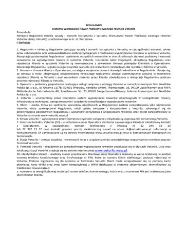 REGULAMIN systemu Warszawski Rower Publiczny zwanego również Veturilo Preambuła Niniejszy Regulamin określa zasady i warunki korzystania z systemu Warszawski Rower Publiczny zwanego również Veturilo (dalej: Veturilo) uruchomionego w m. st. Warszawa. Definicje 1. Regulamin – niniejszy Regulamin opisujący zasady i warunki korzystania z Veturilo, w szczególności warunki, zakres praw i obowiązków oraz odpowiedzialność osób korzystających z możliwości wypożyczania rowerów w systemie Veturilo. Akceptacja postanowień Regulaminu i spełnienie wszystkich warunków w nim określonych stanowi podstawę i warunek zezwolenia na wypożyczenie roweru w systemie Veturilo. Uiszczenie opłat inicjalnych, akceptacja Regulaminu oraz rejestracja Klienta w systemie Veturilo są równoznaczne z zawarciem Umowy pomiędzy Klientem a Operatorem. Akceptacja Regulaminu i zgoda na jego wszystkie warunki jest warunkiem niezbędnym dla rejestracji Klienta w Veturilo. 2. Umowa – Umowa Klienta z Operatorem, ustalająca wzajemne prawa i obowiązki określone w Regulaminie. Uznaje się, że Umowa o treści obejmującej postanowienia niniejszego regulaminu zostaje automatycznie zawarta w momencie rejestracji Klienta w Veturilo i pod warunkiem złożenia przez Klienta oświadczenia o akceptacji Regulaminu podczas procesu rejestracji Klienta w Veturilo. 3. Operator – podmioty gospodarcze realizujące usługi związane z obsługą Veturilo w ramach konsorcjum firm Nextbike Polska Sp. z o.o., ul. Gwarna 11/7b, 50-001 Wrocław, nextbike GmbH, Thomasiusstr. 16, 04109 Lipsk/Niemcy oraz MIFA Mitteldeutsche Fahrradwerke AG, Kyselhaeuser Str. 23, 06526 Sangerhausen/Niemcy. Liderem konsorcjum jest Nextbike Polska Sp. z o.o. 4. Veturilo – uruchomiony przez Operatora system wypożyczalni rowerów obejmujących w szczególności rowery, infrastrukturę techniczną, oprogramowanie i urządzenia umożliwiające wypożyczanie rowerów. 5. Klient – osoba, która po spełnieniu warunków określonych w Regulaminie została zarejestrowana jako użytkownik Veturilo, który zaakceptował Regulamin, uiścił opłaty związane z korzystaniem z Veturilo, zobowiązał się do przestrzegania postanowień Regulaminu i warunków korzystania z wypożyczalni rowerów oraz został zarejestrowany w Veturilo na stronie www.veturilo.waw.pl 6. Serwis Veturilo – wykonywane przez Operatora czynności związane z eksploatacją, naprawami i konserwacją Veturilo. 7. Centrum Kontaktu Veturilo (CK) – uruchomiona przez Operatora platforma zapewniająca Klientom całodobowy kontakt z Operatorem, w szczególności kontakt telefoniczny z infolinią nr 22 244 13 13 lub 22 382 13 12 oraz kontakt poprzez pocztę elektroniczną e-mail na adres [email protected]. Informacje o funkcjonowaniu CK zamieszczane są na stronie internetowej www.veturilo.waw.pl oraz w komunikatach dostępnych na terminalach. 8. Stacja Veturilo – zestaw stojaków rowerowych wraz z urządzeniami do samodzielnego wypożyczenia rowerów poprzez Terminal Veturilo. 9. Terminal Veturilo – urządzenie do samodzielnego wypożyczenia rowerów znajdujące się w Stacjach Veturilo. Lista oraz lokalizacja Stacji Veturilo znajduje się na stronie internetowej www.veturilo.waw.pl. 10. Identyfikator klienta – osobisty numer przydzielony Klientowi przez Operatora zapisany w wersji liczbowej, w postaci numeru telefonu komórkowego oraz 6-cyfrowego nr PIN, które to numery Klient zdefiniował podczas rejestracji w Veturilo. Podczas logowania się do systemu w Terminalu Veturilo Klient może zarejestrować się za pomocą karty płatniczej, karty WKM oraz innej karty kompatybilnej z WKM działającej w systemie zbliżeniowym. Identyfikatory są traktowane równoważnie: a. numerem w wersji liczbowej może być numer telefonu komórkowego, który wraz z numerem PIN jest traktowany jako Identyfikator Klienta, b. Karta Płatnicza – karta emitowana przez organizacje płatnicze emitentów Visa International lub Mastercard International oraz inna spełniająca wymagania dla uznania jej za elektroniczny instrument płatniczy w rozumieniu ustawy o elektronicznych instrumentach płatniczych (Dz. U, z 2002 r. Nr 169, poz. 1385 z późn. zm.). Terminale będą przystosowane do współpracy z produktami z rodziny PayPass i PayWave, c. Karta WKM – Warszawska Karta Miejska, d. inna kompatybilna z WKM przystosowana do kodowana biletów komunikacji miejskiej m.st. Warszawa. 11. Tabele Opłat i Kar – cennik usług i opłat Veturilo będący integralną częścią Umowy. Cennik dostępny jest na stronie www.veturilo.waw.pl. 12. Osobiste Konto Klienta – rachunek przedpłacony utworzony przez Operatora w systemie rozliczeniowym Veturilo, na którym realizowane są operacje uznania oraz obciążenia Klienta za korzystanie z usług i produktów oferowanych w ramach Veturilo zgodnie z Tabelami Opłat i Kar. 13. Opłata Inicjalna – kwota wpisowego do systemu Veturilo wynosząca 10 zł brutto (słownie: dziesięć złotych) uiszczana przez Klienta przy rejestracji w Veturilo, której wniesienie oznacza wyrażenie przez Klienta zgody na postanowienia niniejszego Regulaminu. 14. Kwota Doładowania – opłata na poczet wypożyczeń wniesiona w formie przedpłaty (doładowania) na osobiste konto Klienta w systemie rozliczeniowym Veturilo z przeznaczeniem do wykorzystania w dowolnym okresie czasu objętym Umową. 15. Procedura zabezpieczająca – każde postępowanie podejmowane przez Operatora w przypadku niezwrócenia roweru w wymaganym terminie i stanie, obejmujące w szczególności działanie mające na celu skontaktowanie się z Klientem w celu uzyskania wyjaśnienia, ustalenie okoliczności związanych z naruszeniem przez Klienta warunków Regulaminu i/lub Umów, wysyłanie monitów i wezwań, zajęcie na poczet zobowiązań wpłaconych przez Klienta środków oraz zgłoszenie właściwym organom i instytucjom kradzieży/zniszczenia mienia, wszczęcie postępowań sądowych i windykacyjny