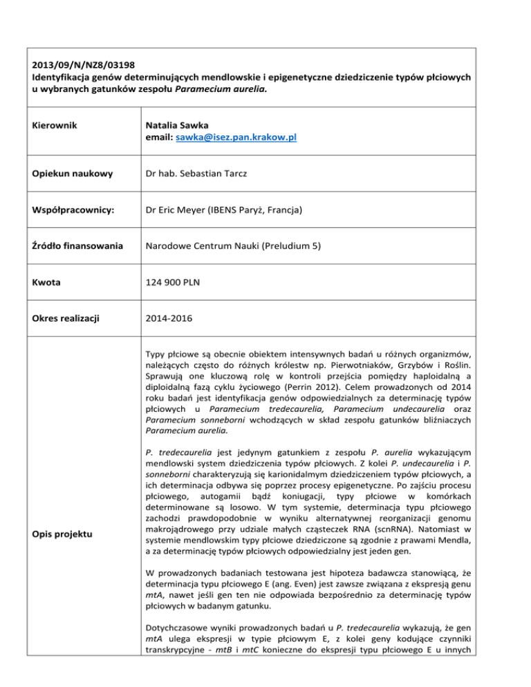 2013/09/N/NZ8/03198 Identyfikacja genów determinujących mendlowskie i epigenetyczne dziedziczenie typów płciowych u wybranych gatunków zespołu Paramecium aurelia. Kierownik Natalia Sawka email: [email protected] Opiekun naukowy Dr hab. Sebastian Tarcz Współpracownicy: Dr Eric Meyer (IBENS Paryż, Francja) Źródło finansowania Narodowe Centrum Nauki (Preludium 5) Kwota 124 900 PLN Okres realizacji 2014-2016 Typy płciowe są obecnie obiektem intensywnych badań u różnych organizmów, należących często do różnych królestw np. Pierwotniaków, Grzybów i Roślin. Sprawują one kluczową rolę w kontroli przejścia pomiędzy haploidalną a diploidalną fazą cyklu życiowego (Perrin 2012). Celem prowadzonych od 2014 roku badań jest identyfikacja genów odpowiedzialnych za determinację typów płciowych u Paramecium tredecaurelia, Paramecium undecaurelia oraz Paramecium sonneborni wchodzących w skład zespołu gatunków bliźniaczych Paramecium aurelia. Opis projektu P. tredecaurelia jest jedynym gatunkiem z zespołu P. aurelia wykazującym mendlowski system dziedziczenia typów płciowych. Z kolei P. undecaurelia i P. sonneborni charakteryzują się karionidalmym dziedziczeniem typów płciowych, a ich determinacja odbywa się poprzez procesy epigenetyczne. Po zajściu procesu płciowego, autogamii bądź koniugacji, typy płciowe w komórkach determinowane są losowo. W tym systemie, determinacja typu płciowego zachodzi prawdopodobnie w wyniku alternatywnej reorganizacji genomu makrojądrowego przy udziale małych cząsteczek RNA (scnRNA). Natomiast w systemie mendlowskim typy płciowe dziedziczone są zgodnie z prawami Mendla, a za determinację typów płciowych odpowiedzialny jest jeden gen. W prowadzonych badaniach testowana jest hipoteza badawcza stanowiącą, że determinacja typu płciowego E (ang. Even) jest zawsze związana z ekspresją genu mtA, nawet jeśli gen ten nie odpowiada bezpośrednio za determinację typów płciowych w badanym gatunku. Dotychczasowe wyniki prowadzonych badań u P. tredecaurelia wykazują, że gen mtA ulega ekspresji w typie płciowym E, z kolei geny kodujące czynniki transkrypcyjne - mtB i mtC konieczne do ekspresji typu płciowego E u innych gatunków np. u P. tetraurelia nie są zaangażowane w proces determinacji typów płciowych w tym gatunku. Przeprowadzone badania sugerują, że w proces aktywacji genu mtA jest zaangażowany nowy, nie opisany gen kodujący czynnik transkrypcyjny, ponadto za typ płciowy O najprawdopodobniej odpowiada delecja jednego nukleotydu w promotorze genu mtA. Przeprowadzona analiza funkcji dotychczas znanych genów typów płciowych (mtA, mtB, mtC) wskazują, że nie u wszystkich gatunków zespołu P. aurelia są one wymagane do ekspresji typu płciowego E (P. undecaurelia, P. sonneborni). Dodatkowo przeprowadzane analizy filogenetyczne wskazują, że w obrębie zespołu gatunków P. aurelia doszło do ewolucji kilku niezależnych od siebie mechanizmów determinacji typów płciowych. Prowadzone badania mają istotne znaczenie dla poznania ewolucji genomu Paramecium oraz przebiegu specjacji w obrębie gatunków bliźniaczych. Dotychczasowe wyniki wykazują, że w obrębie zespołu gatunków P. aurelia ewolucja mechanizmów determinujących typy płciowe zaszła kilkakrotnie i niezależnie od siebie. Badania prowadzone w ramach projektu badawczego są częścią projektu dotyczącego badania systemów determinacji typów płciowych u wszystkich gatunków należących do zespołu Paramecium aurelia realizowanego w ramach sieci naukowej Europejskiej Grupy Badawczej GDRE (fr. Groupement de Recherches Européen) „Paramecium Genome Dynamics and Evolution”. Ponadto stanowią także cześć projektu akcji COST BM1102 „Ciliates as model systems to study genome evolution, mechanisms of non-Mendelian inheritance, and their roles in environmental adaptation” Projekt w trakcie realizacji.