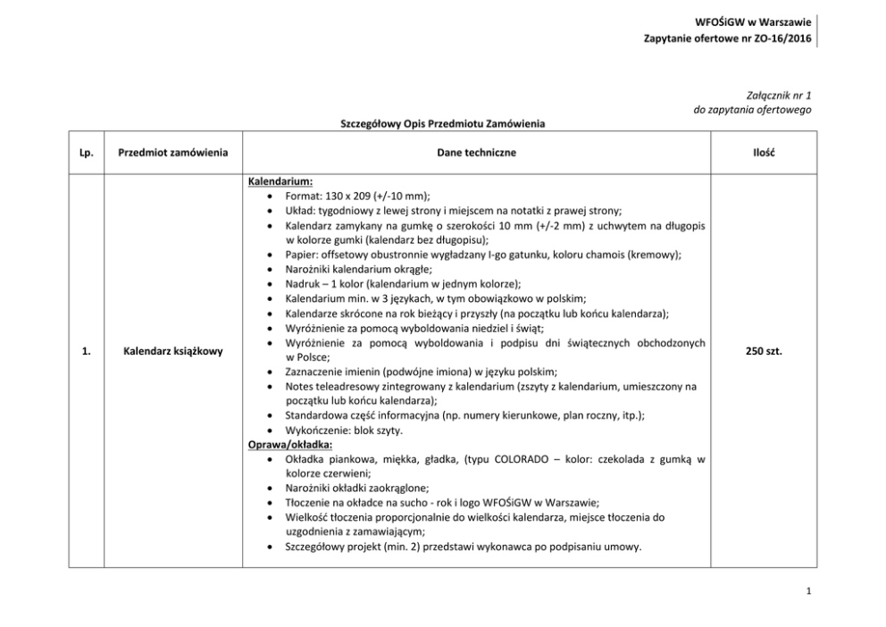 WFOŚiGW w Warszawie Zapytanie ofertowe nr ZO-16/2016 Załącznik nr 1 do zapytania ofertowego Szczegółowy Opis Przedmiotu Zamówienia Lp. 1. Przedmiot zamówienia Kalendarz książkowy Dane techniczne Kalendarium: Format: 130 x 209 (+/-10 mm); Układ: tygodniowy z lewej strony i miejscem na notatki z prawej strony; Kalendarz zamykany na gumkę o szerokości 10 mm (+/-2 mm) z uchwytem na długopis w kolorze gumki (kalendarz bez długopisu); Papier: offsetowy obustronnie wygładzany I-go gatunku, koloru chamois (kremowy); Narożniki kalendarium okrągłe; Nadruk – 1 kolor (kalendarium w jednym kolorze); Kalendarium min. w 3 językach, w tym obowiązkowo w polskim; Kalendarze skrócone na rok bieżący i przyszły (na początku lub końcu kalendarza); Wyróżnienie za pomocą wyboldowania niedziel i świąt; Wyróżnienie za pomocą wyboldowania i podpisu dni świątecznych obchodzonych w Polsce; Zaznaczenie imienin (podwójne imiona) w języku polskim; Notes teleadresowy zintegrowany z kalendarium (zszyty z kalendarium, umieszczony na początku lub końcu kalendarza); Standardowa część informacyjna (np. numery kierunkowe, plan roczny, itp.); Wykończenie: blok szyty. Oprawa/okładka: Okładka piankowa, miękka, gładka, (typu COLORADO – kolor: czekolada z gumką w kolorze czerwieni; Narożniki okładki zaokrąglone; Tłoczenie na okładce na sucho - rok i logo WFOŚiGW w Warszawie; Wielkość tłoczenia proporcjonalnie do wielkości kalendarza, miejsce tłoczenia do uzgodnienia z zamawiającym; Szczegółowy projekt (min. 2) przedstawi wykonawca po podpisaniu umowy. Ilość 250 szt. 1 WFOŚiGW w Warszawie Zapytanie ofertowe nr ZO-16/2016 Wstążka/tasiemka: W kolorze zbliżonym do koloru gumki (czerwieni) z adresem strony internetowej (www.wfosigw.pl), powtarzanym na całej długości tasiemki. Szerokość tasiemki 4 -7 mm (kolor napisu na tasiemce do ustalenia z zamawiającym w trakcie realizacji zamówienia). Wklejka/wkładka informacyjna: 2 strony (tj. 1 kartka); Kolor 4+4; Wklejenie na początku kalendarza za stroną tytułową kalendarza; Wklejka drukowana na papierze kredowym o gramaturze min. 135g/m2; Projekt przygotowany przez wykonawcę na podstawie materiałów przekazanych przez zamawiającego. Projekt graficzny do uzgodnienia z zamawiającym w trakcie realizacji umowy (wliczony w cenę usługi). Materiały zostaną przekazane wykonawcy przez zamawiającego w dniu podpisania umowy. 2. Kalendarz książkowy Kalendarium: Format: 85 x 153 mm (+/- 10 mm); Układ w pionie: tydzień na rozkładówce; Papier: offsetowy obustronnie wygładzany I-go gatunku, kolor: chamois (kremowy); Narożniki kalendarium proste; Narożniki perforowane; Nadruk – 2 kolory (kalendarium w dwóch kolorach); Registry miesięczne, panoramiczne (wycięte), nie mogą wchodzić na perforacje; Kalendarium min. w 3 językach, w tym obowiązkowo w polskim; Kalendarze skrócone na rok bieżący i przyszły (na początku lub końcu kalendarza); Wyróżnienie za pomocą koloru sobót i niedziel; Wyróżnienie za pomocą koloru i podpisu dni świątecznych obchodzonych w Polsce; Zaznaczenie imienin (podwójne imiona) w języku polskim; Notes teleadresowy zintegrowany z kalendarium (zszyty z kalendarium, umieszczony na początku lub końcu kalendarza); Standardowa część informacyjna (np. numery kierunkowe, itp.); Wykończenie: blok szyty. 200 szt. 2 WFOŚiGW w Warszawie Zapytanie ofertowe nr ZO-16/2016 Oprawa/okładka: Okładka piankowa, miękka; Okleina: skóropodobna, dwa kolory (typu COLORADO – kolor: czekolada oraz czerwień); Oprawa dwuelementowa, z przeszyciem nićmi w kolorze okleiny, przeszycie wzdłuż łączenia, kształt pionowego paska, całość kalendarza w kolorze czekolady, tylko pasek w kolorze czerwieni; zdjęcie poglądowe przeszycia okładki kalendarza Narożniki okładki zaokrąglone; Tłoczenie na okładce suche - rok i logo WFOŚiGW w Warszawie; Wielkość tłoczenia proporcjonalnie do wielkości kalendarza, miejsce tłoczenia do uzgodnienia z zamawiającym; Szczegółowy projekt (min. 2) przedstawi wykonawca po podpisaniu umowy. Wstążka/tasiemka: W kolorze zbliżonym do koloru czerwieni z okładki, z adresem strony internetowej (www.wfosigw.pl), powtarzanym na całej długości tasiemki. Szerokość tasiemki 4 -7 mm (kolor napisu na tasiemce do ustalenia z zamawiającym w trakcie realizacji zamówienia). Wklejka/wkładka informacyjna: 2 strony (tj. 1 kartka); Kolor 4+4; Wklejenie na początku kalendarza za stroną tytułową kalendarza; Wklejka drukowana na papierze kredowym o gramaturze min. 135g/m2; Projekt przygotowany przez wykonawcę na podstawie materiałów przekazanych przez zamawiającego. Projekt graficzny do uzgodnienia z zamawiającym w trakcie realizacji umowy (wliczony w cenę usługi). Materiały zostaną przekazane wykonawcy przez zamawiającego w dniu podpisania umowy. 3 WFOŚiGW w Warszawie Zapytanie ofertowe nr ZO-16/2016 Warunki realizacji przedmiotu zamówienia: 1) po podpisaniu umowy, wykonawca opracuje min. dwa projekty graficzne wkładki do kalendarzy na podstawie materiałów przekazanych drogą elektroniczną przez zamawiającego (w dniu podpisania umowy); 2) przekazanie zamawiającemu projektów graficznych wkładki, w celu naniesienia przez zamawiającego uwag lub akceptacji zamawiającego; 3) uwzględnienie wszelkich sugestii i naniesienie wszystkich zmian w przedstawionych projektach graficznych wkładki proponowanych przez zamawiającego; 4) uzyskanie zatwierdzenia przez zamawiającego projektu graficznego wkładki; 5) umieszczenie następujących oznaczeń: Logo Wojewódzkiego Funduszu Ochrony Środowiska i Gospodarki Wodnej w Warszawie; 6) wykonanie kalendarzy książkowych na rok 2017, zgodnie z wymaganiami określonymi powyżej, według własnego projektu wykonawcy po uzyskaniu zatwierdzenia przez zamawiającego; 7) dostarczenie kalendarzy własnym transportem i na własny koszt do siedziby zamawiającego zlokalizowanej w Warszawie przy ul. Og