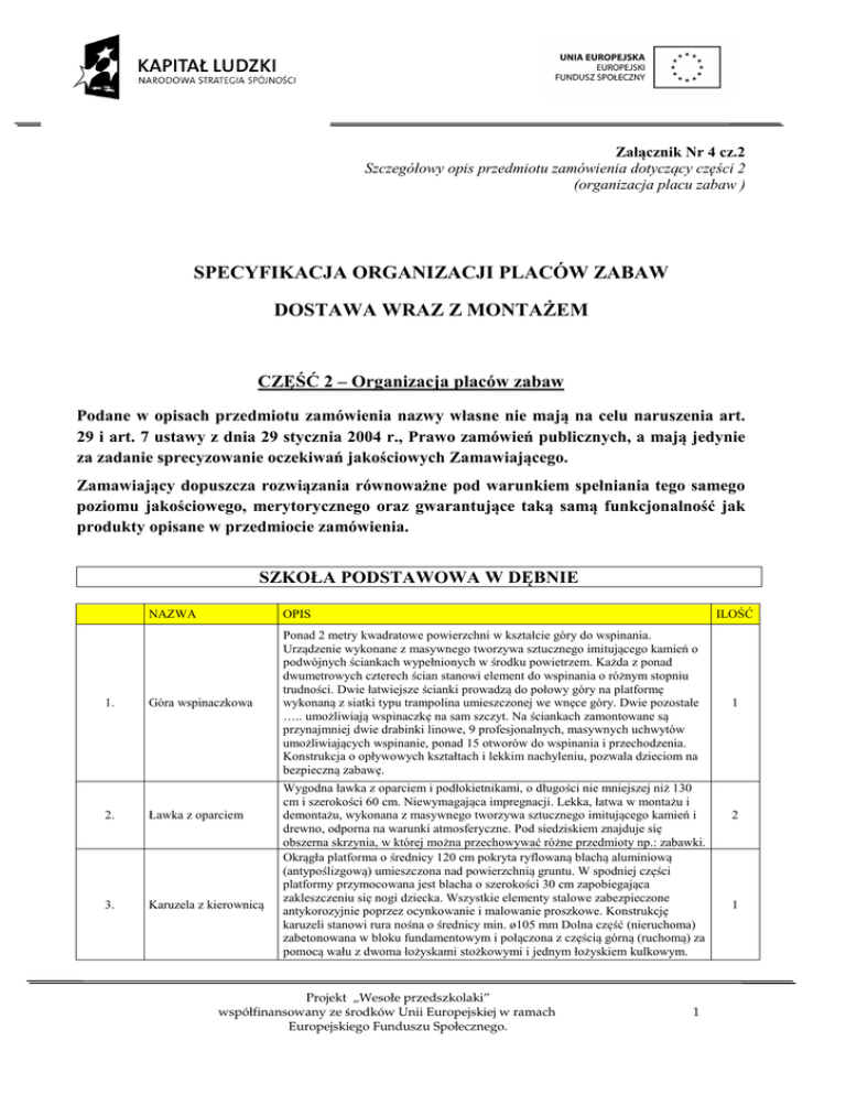 Załącznik Nr 4 cz.2 Szczegółowy opis przedmiotu zamówienia dotyczący części 2 (organizacja placu zabaw ) SPECYFIKACJA ORGANIZACJI PLACÓW ZABAW DOSTAWA WRAZ Z MONTAŻEM CZĘŚĆ 2 – Organizacja placów zabaw Podane w opisach przedmiotu zamówienia nazwy własne nie mają na celu naruszenia art. 29 i art. 7 ustawy z dnia 29 stycznia 2004 r., Prawo zamówień publicznych, a mają jedynie za zadanie sprecyzowanie oczekiwań jakościowych Zamawiającego. Zamawiający dopuszcza rozwiązania równoważne pod warunkiem spełniania tego samego poziomu jakościowego, merytorycznego oraz gwarantujące taką samą funkcjonalność jak produkty opisane w przedmiocie zamówienia. SZKOŁA PODSTAWOWA W DĘBNIE 1. NAZWA OPIS Góra wspinaczkowa Ponad 2 metry kwadratowe powierzchni w kształcie góry do wspinania. Urządzenie wykonane z masywnego tworzywa sztucznego imitującego kamień o podwójnych ściankach wypełnionych w środku powietrzem. Każda z ponad dwumetrowych czterech ścian stanowi element do wspinania o różnym stopniu trudności. Dwie łatwiejsze ścianki prowadzą do połowy góry na platformę wykonaną z siatki typu trampolina umieszczonej we wnęce góry. Dwie pozostałe ….. umożliwiają wspinaczkę na sam szczyt. Na ściankach zamontowane są przynajmniej dwie drabinki linowe, 9 profesjonalnych, masywnych uchwytów umożliwiających wspinanie, ponad 15 otworów do wspinania i przechodzenia. Konstrukcja o opływowych kształtach i lekkim nachyleniu, pozwala dzieciom na bezpieczną zabawę. 2. Ławka z oparciem 3. Karuzela z kierownicą ILOŚĆ Wygodna ławka z oparciem i podłokietnikami, o długości nie mniejszej niż 130 cm i szerokości 60 cm. Niewymagająca impregnacji. Lekka, łatwa w montażu i demontażu, wykonana z masywnego tworzywa sztucznego imitującego kamień i drewno, odporna na warunki atmosferyczne. Pod siedziskiem znajduje się obszerna skrzynia, w której można przechowywać różne przedmioty np.: zabawki. Okrągła platforma o średnicy 120 cm pokryta ryflowaną blachą aluminiową (antypoślizgową) umieszczona nad powierzchnią gruntu. W spodniej części platformy przymocowana jest blacha o szerokości 30 cm zapobiegająca zakleszczeniu się nogi dziecka. Wszystkie elementy stalowe zabezpieczone antykorozyjnie poprzez ocynkowanie i malowanie proszkowe. Konstrukcję karuzeli stanowi rura nośna o średnicy min. ø105 mm Dolna część (nieruchoma) zabetonowana w bloku fundamentowym i połączona z częścią górną (ruchomą) za pomocą wału z dwoma łożyskami stożkowymi i jednym łożyskiem kulkowym. Projekt „Wesołe przedszkolaki” współfinansowany ze środków Unii Europejskiej w ramach Europejskiego Funduszu Społecznego. 1 1 2 1 SZKOŁA PODSTAWOWA W GRONKOWIE NAZWA OPIS Góra wspinaczkowa Ponad 2 metry kwadratowe powierzchni w kształcie góry do wspinania. Urządzenie wykonane z masywnego tworzywa sztucznego imitującego kamień o podwójnych ściankach wypełnionych w środku powietrzem. Każda z ponad dwumetrowych czterech ścian stanowi element do wspinania o różnym stopniu trudności. Dwie łatwiejsze ścianki prowadzą do połowy góry na platformę wykonaną z siatki typu trampolina umieszczonej we wnęce góry. Dwie pozostałe umożliwiają wspinaczkę na sam szczyt. Na ściankach zamontowane są przynajmniej dwie drabinki linowe, 9 profesjonalnych, masywnych uchwytów umożliwiających wspinanie, ponad 15 otworów do wspinania i przechodzenia. Konstrukcja o opływowych kształtach i lekkim nachyleniu, pozwala dzieciom na bezpieczną zabawę. 1 Domek ze zjeżdżalnią Nowoczesny domek rozrywki. Każda ścianka domku posiada różne atrakcje: ścianka ze zjeżdżalnią - na której umocowana jest zjeżdżalnia, można się do niej dostać po schodkach znajdujących się wewnątrz domku. Na dole ściany umieszczony jest okrągły otwór, przez który można przejść na czworakach, ścianka zręcznościowa: ćwiczy celność i precyzję ruchu, rzuty do celu - ringo i tarcza na rzepy. Na dole ściany umieszczono przejście z podwójnymi drzwiczkami, ścianka wejściowa zawiera: otwór z drzwiczkami, okno i małe przejście w postaci tunelu; ścianka odpoczynku, stoliczek i dwa krzesełka, które pozwalają na relaks, albo zabawę w sklep. Wewnątrz domku umieszczono stolik oraz lustro/ krzywe zwierciadło, które rozbawi każdego przeglądającego się. Wytrzymała konstrukcja sprawia, że domek posłuży przez wiele lat do zabawy. 1 Ławka z oparciem Wygodna ławka z oparciem i podłokietnikami, o długości nie mniejszej niż 130 cm i szerokości 60 cm. Niewymagająca impregnacji. Lekka, łatwa w montażu i demontażu, wykonana z masywnego tworzywa sztucznego imitującego kamień i drewno, odporna na warunki atmosferyczne. Pod siedziskiem znajduje się obszerna skrzynia, w której można przechowywać różne przedmioty np.: zabawki. 2 7. Stolik piknikowy z parasolem Stół piknikowy dla sześciorga dzieci z dwoma ławeczkami o specjalnym wyprofilowanym siedzisku. Wykonany z masywnego tworzywa sztucznego o podwójnych ściankach Wypełnionych w środku powietrzem. Znaczna grubość elementów minimum 5 - 6 cm pozwala na długie użytkowanie stolika a duży ponad 100 cm długości i szerokości 50 cm masywny blat oraz stabilna konstrukcja stołu zapewnia bezpieczeństwo zabawy. Dołączony parasol chroni przed promieniowaniem UV. Wys. od ziemi do blatu stolika minimum 50cm. pozwala na korzystanie ze stolika dzieciom o różnym wzroście 4 8. Trampolina 9. Most z Tunelem 4. 5. 6. ILOŚĆ Trampolina o zewnętrznej średnicy 457 cm i średnicy maty do odbić ok 400 cm. Duża trampolina z siatką zabezpieczającą, umożliwiająca nieskrępowaną zabawę. Dopuszczalne maksymalne obciążenie wynosi 150 kg. Atestowana Dwie zadaszone wieże połączone mostem i tunelem tworzą zamkniętą budowlę wykonaną z masywnego tworzywa sztucznego o podwójnych ściankach w środku wypełnionych powietrzem. Konstrukcja i dodatkowe wyposa