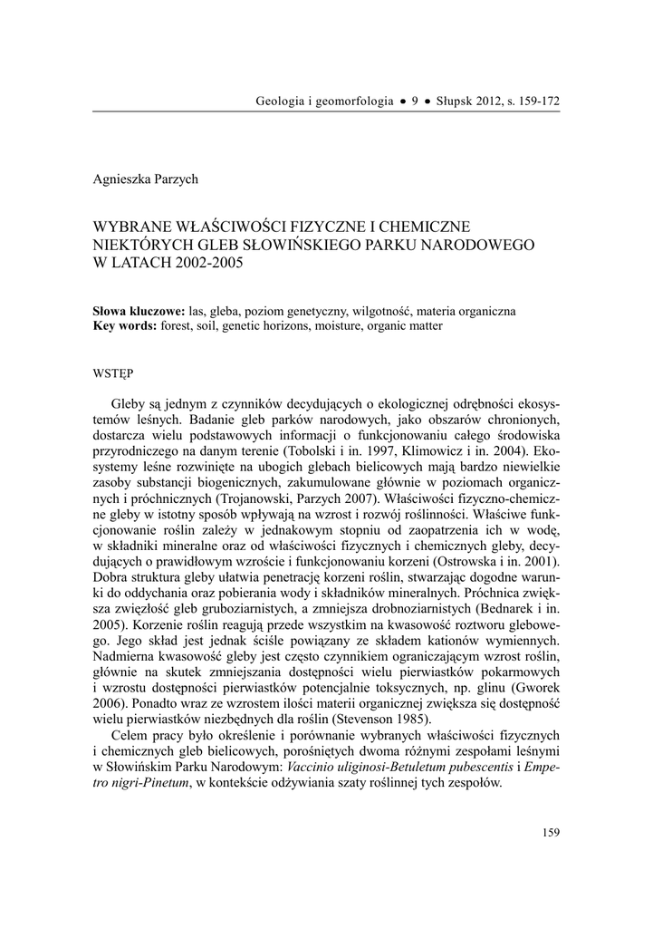 Geologia i geomorfologian••n9n••nSłupsk 2012, s. 159-172 Agnieszka Parzych WYBRANE WŁAŚCIWOŚCI FIZYCZNE I CHEMICZNE NIEKTÓRYCH GLEB SŁOWIŃSKIEGO PARKU NARODOWEGO W LATACH 2002-2005 Słowa kluczowe: las, gleba, poziom genetyczny, wilgotność, materia organiczna Key words: forest, soil, genetic horizons, moisture, organic matter WSTĘP Gleby są jednym z czynników decydujących o ekologicznej odrębności ekosystemów leśnych. Badanie gleb parków narodowych, jako obszarów chronionych, dostarcza wielu podstawowych informacji o funkcjonowaniu całego środowiska przyrodniczego na danym terenie (Tobolski i in. 1997, Klimowicz i in. 2004). Ekosystemy leśne rozwinięte na ubogich glebach bielicowych mają bardzo niewielkie zasoby substancji biogenicznych, zakumulowane głównie w poziomach organicznych i próchnicznych (Trojanowski, Parzych 2007). Właściwości fizyczno-chemiczne gleby w istotny sposób wpływają na wzrost i rozwój roślinności. Właściwe funkcjonowanie roślin zależy w jednakowym stopniu od zaopatrzenia ich w wodę, w składniki mineralne oraz od właściwości fizycznych i chemicznych gleby, decydujących o prawidłowym wzroście i funkcjonowaniu korzeni (Ostrowska i in. 2001). Dobra struktura gleby ułatwia penetrację korzeni roślin, stwarzając dogodne warunki do oddychania oraz pobierania wody i składników mineralnych. Próchnica zwiększa zwięzłość gleb gruboziarnistych, a zmniejsza drobnoziarnistych (Bednarek i in. 2005). Korzenie roślin reagują przede wszystkim na kwasowość roztworu glebowego. Jego skład jest jednak ściśle powiązany ze składem kationów wymiennych. Nadmierna kwasowość gleby jest często czynnikiem ograniczającym wzrost roślin, głównie na skutek zmniejszania dostępności wielu pierwiastków pokarmowych i wzrostu dostępności pierwiastków potencjalnie toksycznych, np. glinu (Gworek 2006). Ponadto wraz ze wzrostem ilości materii organicznej zwiększa się dostępność wielu pierwiastków niezbędnych dla roślin (Stevenson 1985). Celem pracy było określenie i porównanie wybranych właściwości fizycznych i chemicznych gleb bielicowych, porośniętych dwoma różnymi zespołami leśnymi w Słowińskim Parku Narodowym: Vaccinio uliginosi-Betuletum pubescentis i Empetro nigri-Pinetum, w kontekście odżywiania szaty roślinnej tych zespołów. 159 160 Rys. 1. Plan sytuacyjny Słowińskiego Parku Narodowego – lokalizacja powierzchni badawczych, 1 – granica Parku, 2 – granica terenu administrowanego przez Park, 3 – linie oddziałów leśnych, 4 – drogi, 5 – powierzchnia badawcza I (Vu-Bp), 6 – powierzchnia badawcza II (En-P) Fig. 1. Situation plan of the Słowiński National Park – locations of the study sites, 1 – border of NP, 2 – border of Park’s administration area, 3 – border of forest compartments, 4 – roads, 5 – research plot I (Vu-Bp), 6 – research plot II (En-P) MATERIAŁ I METODY BADAŃ Obszar badań Badania prowadzono w dwóch różnych ekosystemach leśnych na terenie Słowińskiego Parku Narodowego, wzdłuż drogi biegnącej ze Smołdzińskiego Lasu do Czołpina, w odległości 600 m jedna od drugiej. Lokalizację powierzchni badawczych przedstawiono na rysunku 1. Na powierzchni I występują gleby bielicowe wytworzone z luźnych piasków wydmowych podścielonych glebą kopalną o następującej budowie profilu glebowego: Ol-Ofh-AEes-Bhfe-C-Otnib oraz szata roślinna należąca do Vaccinio uliginosi-Betuletum pubescentis (Vu-Bp). Na powierzchni II występują gleby bielicowe (Ol-Ofh-AEes-Bhfe-C) oraz roślinność należąca do Empetro nigri-Pinetum (En-P). Drzewostany badanych powierzchni wykazywały zróżnicowanie gatunkowe i wiekowe. Powierzchnię I porastał luźny drzewostan sosnowobrzozowy o wysokości 18-19 m. Udział 60-letniej sosny zwyczajnej (Pinus sylvestris L.) wynosił 25%, a 47-letniej brzozy omszonej (Betula pubescens) – 75%. Powierzchnię II porastał jednolity, 140-letni drzewostan sosnowy (Pinus sylvestris L.; Plan... 2003). Metodyka badań Na każdej 0,5 ha powierzchni badawczej wykonano odkrywkę glebową i opisano budowę profilu. Taksonomię gleb opracowano na podstawie Systematyki gleb Polski PTG (1989). Oznaczenia podstawowych właściwości fizycznych, glinu wymiennego oraz właściwości sorpcyjnych próbek glebowych wykonano jednokrotnie w maju 2002 roku. Próbki do analiz chemicznych i pomiaru wilgotności pobierano za pomocą świdra, średnio co sześć tygodni w okresie sezonów wegetacyjnych w latach 2002-2005 ze wszystkich poziomów genetycznych badanych profili, zagęszczając liczbę próbek w przypadku dużej miąższości poziomu. Materiał badawczy pobierano z kilkunastu losowo wybranych stanowisk każdej powierzchni leśnej do głębokości 1,5 m (ze względu na głębokość występowania korzeni roślin), a następnie łączono go, tworząc tzw. próbki mieszane (Czarnowski 1978). Po przewiezieniu do laboratorium i wstępnym przygotowaniu próbki glebowe poddawano odpowiednim analizom według metod zaproponowanych przez Ostrowską i in. (1991) oraz Bednarek i in. (2005). Wszystkie analizy wykonywano w trzech powtórzeniach. W próbkach glebowych oznaczono: – gęstość właściwą (Dw) metodą piknometryczną; – gęstość objętościową (Do) w próbkach o nienaruszonej strukturze; – skład frakcyjny piasku (na sucho) – metodą sitową; – odczyn gleb – potencjometrycznie w roztworze wodnym i w 1 M roztworze KCl; – wilgotność aktualną (Ww) – metodą suszarkowo-wagową; – straty prażenia (Sp) w piecu muflowym w temp. 550oC; – glin wymienny (Al3+) – metodą Sokołowa; – sumę zasad wymiennych (S) – metodą Kappena; – kwasowość hydrolityczną (Hh) – metodą Kappena. 161 Na podstawie uzyskanych wyników analiz laboratoryjnych obliczono: – porowatość ogólną (Po), Po = (Dw – Do) : Dw · 100%; – aktualne zasoby wody glebowej (Zo), Zo = Ww · Do · h : 10 [mm]; h – miąższoś