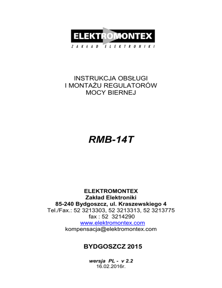 INSTRUKCJA OBSŁUGI I MONTAśU REGULATORÓW MOCY BIERNEJ RMB-14T ELEKTROMONTEX Zakład Elektroniki 85-240 Bydgoszcz, ul. Kraszewskiego 4 Tel./Fax.: 52 3213303, 52 3213313, 52 3213775 fax : 52 3214290 www.elektromontex.com [email protected] BYDGOSZCZ 2015 wersja PL - v 2.2 16.02.2016r. 2 ELEKTROMONTEX RMB-14T – INSTRUKCJA OBSŁUGI SPIS TREŚCI 1. ZASADY OGÓLNE................................................................................................................................................... 4 2. DANE TECHNICZNE ................................................................................................................................................ 5 3. BUDOWA .................................................................................................................................................................. 6 4. MONTAś, PODŁĄCZENIE I URUCHOMIENIE WSTĘPNE................................................................................... 8 5. PARAMETRY KOMPENSACJI .................................................................................................................................. 9 5.1 ZADANY WSPÓŁCZYNNIK MOCY COS ϕ ............................................................................................................ 9 5.2 OBLICZENIE WSPÓŁCZYNNIKA C/K...................................................................................................................... 9 5.3 WYBÓR SZEREGU REGULACYJNEGO .............................................................................................................. 10 6. TRYBY PRACY REGULATORA ............................................................................................................................ 12 6.1 PRACA AYTOMATYCZNA ..................................................................................................................................... 12 6.2 PRACA RĘCZNA .................................................................................................................................................... 12 7. PROGRAMOWANIE PARAMETRÓW REGULATORA......................................................................................... 12 7.1 PRZYCISKI DO OBSŁUGI REGULATORA .............................................................................................................. 12 7.2 BLOKADA NASTAW PARAMETRÓW REGULATORA ........................................................................................... 13 7.3 UKŁAD MENU GŁÓWNEGO .................................................................................................................................. 13 7.4 NASTAWY PARAMETRÓW PODSTAWOWYCH ................................................................................................... 14 7.4.1 USTAWIENIE ZADANEGO WSPÓŁCZYNNIKA MOCY „COS 7.4.2 USTAWIENIE WSPÓŁCZYNNIKA „C/K”. ............................................................................................................... 15 7.4.3 USTAWIENIE WYMAGANEJ ILOŚCI AKTYWNYCH WYJŚĆ 7.4.4 WYBÓR ODPOWIEDNIEGO SZEREGU REGULACYJNEGO .............................................................................. 15 7.4.5 USTAWIENIE CZASU OPÓŹNIENIA ZAŁĄCZENIA KOLEJNEGO CZŁONU BATERII. ......................................... 16 7.4.6 USTAWIENIE CZASU OPÓŹNIENIA WYŁĄCZENIA KOLEJNEGO CZŁONU BATERII......................................... 16 7.4.7 USTAWIENIE CZASU OPÓŹNIENIA ZAŁĄCZENIA KOLEJNEGO CZŁONU TYRYSTOROWEGO BATERII ....... 16 7.5 USTAWIENIE PARAMETRÓW DODATKOWYCH (ADDITIONAL SETUP)......................................................... 17 7.5.1 USTAWIENIE PARAMETRÓW TRANSMISJI.......................................................................................................... 18 7.5.2 USTAWIENIE PROGU ALARMOWEGO ZAWARTOŚCI HARMONICZNYCH THD I......................................... 18 7.5.3 USTAWIENIE PROGU ALARMOWEGO ZAWARTOŚCI HARMONICZNYCH THD U. ..................................... 18 ϕ” ......................................................................... 15 ......................................................................... 15 RMB-14T – INSTRUKCJA OBSŁUGI ELEKTROMONTEX 3 7.5.4 USTAWIENIE POZIOMU NAPIĘCIA POMIAROWEGO........................................................................................... 18 7.5.5 USTAWIENIE CZASU BLOKADY WŁĄCZANIA CZŁONÓW KONDENSATOROWYCH. ................................... 19 7.5.6 USTAWIENIE CZASU WYŁĄCZENIA CZŁONÓW KONDENSATOROWYCH PRZY POJEMNOŚCIOWYM CHARAKTERZE OBCIĄśENIA ................................................................................................................................ 19 7.5.7 ZMIANA POLARYZACJI WEJŚCIOWEJ OBWODU PRĄDOWEGO. .................................................................. 19 7.5.8 USTAWIENIE RODZAJU PRACY FAZOWEJ........................................................................................................ 19 7.5.9 WYBÓR TYPU STREFY NIECZUŁOŚCI. ................................................................................................................ 20 7.5.10 WYKRYWANIE KRÓTKOTRWAŁYCH ZANIKÓW NAPIĘCIA ZASILANIA. ........................................................... 20 7.5.11 PRZYWRÓCENIE FABRYCZNYCH NASTAW REGULATORA. ....................................................................... 20 7.6 OKNA INFORMACYJNE......................................................................................................................................... 20 7.6.1 POMIAR WSPÓŁCZYNNIKA THD I [%] ORAZ PRĄDU POMIAROWEGO ....................................................... 20 7.6.2 POMIAR WSPÓŁCZYNNIKA THD U [%] ORAZ NAPIĘCIA POMIAROWEGO ................................................ 21 7.6.3 STATYSTYKA PRACY CZŁONÓW BATERII ......................................................................................................... 21 7.6.3.1 CZAS PRACY CZŁONU BATERII ....