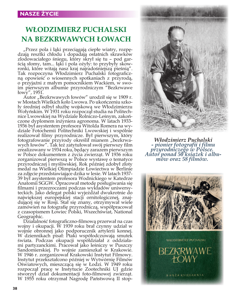 NASZE ŻYCIE WŁODZIMIERZ PUCHALSKI NA BEZKRWAWYCH ŁOWACH „Przez pola i łąki przeciągają ciepłe wiatry, rozpędzają resztki chłodu i dopadają ostatnich skrawków zlodowaciałego śniegu, który skrył się tu – pod garścią słomy, tam... łąki i pola ożyły: to przybyły skowronki, które witają nasz kraj najradośniejszą pieśnią”. Tak rozpoczyna Włodzimierz Puchalski fotograficzną opowieść o wiosennych spotkaniach z przyrodą, o przyjaźni z małym pomocnikiem Wackiem, w swoim pierwszym albumie przyrodniczym “Bezkrwawe łowy”, 1951. Autor „Bezkrwawych łowów” urodził się w 1909 r. w Mostach Wielkich koło Lwowa. Po ukończeniu szkoły średniej odbył służbę wojskową we Włodzimierzu Wołyńskim. W 1931 roku rozpoczął studia na Politechnice Lwowskiej na Wydziale Rolniczo-Leśnym, zakończone dyplomem inżyniera agronoma. W latach 19331936 był asystentem profesora Witolda Romera na wydziale Fotochemii Politechniki Lwowskiej i wspólnie realizował filmy przyrodnicze. Był pierwszym, który fotografowanie przyrody określił mianem „bezkrwawych łowów”. Tak też zatytułował swój pierwszy film zrealizowany w 1934 roku, będący zarazem pierwszym w Polsce dokumentem z życia zwierząt. W 1936 roku zorganizował pierwszą w Polsce wystawę o tematyce przyrodniczej i myśliwskiej. Rok później zdobył złoty medal na Wielkiej Olimpiadzie Łowiectwa w Berlinie za zdjęcie przedstawiające dzika w lesie. W latach 193739 był asystentem profesora Wodnickiego w Katedrze Anatomii SGGW. Opracował metodę posługiwania się filmami i przezroczami podczas wykładów uniwersyteckich. Jako delegat polski wyjeżdżał dwukrotnie do największej europejskiej stacji ornitologicznej, znajdującej się w Rosji. Stał się znany, otrzymywał wiele zamówień na fotografię przyrodniczą, współpracował z czasopismem Łowiec Polski, Wszechświat, National Geographic. Działalność fotograficzno-filmową przerwał na czas wojny i okupacji. W 1939 roku brał czynny udział w wojnie obronnej jako podporucznik artylerii konnej. W dziennikach pisał: Ptaki współodczuwają smutek świata. Podczas okupacji współdziałał z oddziałami partyzanckimi. Pracował jako leśniczy w Puszczy Sandomierskiej. Po wojnie zamieszkał w Krakowie. W 1946 r. zorganizował Krakowski Instytut Filmowy. Instytut przekształcono później w Wytwórnię Filmów Oświatowych, mieszczącą się w Łodzi. W 1949 roku rozpoczął pracę w Instytucie Zootechniki UJ gdzie stworzył dział dokumentacji foto-filmowej zwierząt. W 1955 roku otrzymał Nagrodę Państwową II stop38 Włodzimierz Puchalski - pionier fotografii i filmu przyrodniczego w Polsce. Autor ponad 50 książek i albumów oraz 58 filmów. echo życia NASZE ŻYCIE nia za osiągnięcia twórcze w zakresie filmów przyrodniczych. Od 1956 roku pracował jako reżyser i operator filmów przyrodniczych w Wytwórni Filmów Oświatowych w Łodzi. Włodzimierz Puchalski, od dzieciństwa poznawał tajemnice i piękno świata Natury. Udokumentował dziesiątki gatunków zwierząt i roślin a także różnych krain, miast i wsi Polski. Podróżował także w dalekie kraje. Był uczestnikiem dwóch wypraw arktycznych na Spitzbergen (1957 i 1958 r), których plonem było 5 filmów. Jednak na miejsce stałych powrotów wybrał „ptasi raj” w Morusach k/ Tykocina. Małą wieś, dokąd rok rocznie przybywał w pierwszych dniach przedwiośnia. Pisał: Widziałem w swoim życiu wiele jezior, rzek, rozlewisk, ale nieodparty urok tych bezkresnych wód, właśnie tam, w Morusach, obejmujących ogromną przestrzeń krajobrazu, należy w moich wspomnieniach do najpiękniejszych. Wokoło roiło się od ptactwa. Ptaki, które darzył największą sympatią nazwał rozśpiewanymi klejnotami naszej przyrody. Z Morus wyruszał także nad Biebrzę, nad jezioro Wigry, do Puszczy Białowieskiej. Latem 1978 roku Puchalski pożegnał się z Morusami, załamany przegraną walką o Dolinę Narwi. Regulacja Narwi i melioracja doliny zniszczyła bezpowrotnie “ptasi raj”. Jesienią 1978 r. Włodzimierz Puchalski wyjechał z wyprawą Polskiej Akademii Nauk na Antarktykę. W pamiętnikach prowadzonych podczas wyprawy pisał: „Śniła mi się polska wiosna nad Narwią z kaczeńcami, żabami, bocianami” (listopad 1978). Zmarł na Wyspie Króla Jerzego. Jego grób został wpisany na listę obiektów historycznych Antarktyki. Wiedzę przyrodniczą i umiejętność obserwacji zwierząt wykorzystał nie tylko do dokumentowania, ale także do badania dzikiej natury. Miłośnik przyrody i jej obrońca, pracowity, zorganizowany, przyjazny wobec ludzi, urokliwy gawędziarz, dzielił się wiedzą z innym, zdobył wśród wielu sympatię i podziw. Na jego „Bezkrwawych łowach” kilka pokoleń Polaków uczyło się umiłowania ojczystej przyrody. Podczas zbierania materiałów do filmów i albumów niejednokrotnie towarzyszyły Włodzimierzowi Puchalskiemu ekipy filmowe, ale najbardziej cenił współpracę z ludnością miejscową. Wiele z nich owocowała przyjaźnią. Taka była też historia znajomości z Wackiem, 14 letnim chłopcem i leśniczym, którzy uczestniczyli w wyprawach i zdjęciach do albumu “Bezkrwawe łowy”. 39 NASZE ŻYCIE W zakończeniu „Bezkrwawych łowów” Włodzimierz Puchalski napisał: - Mnóstwo przeżyć utrwaliło się na taśmie pamięci – znacznie więcej niż zdjęć na taśmie filmu. Trudno opowiedzieć to wszystko, co oglądały nasze oczy. Po takie wrażenia trzeba samemu wyruszać w dalekie zakątki, w leśne ostępy, w gwarne kolonie ptasie. I jeszcze jedno pozostało z tych dni. Przyjaźń trzech ludzi, różnych wiekiem i zawodem, a zjednoczonych wspólnotą zainteresowań. Pożegnanie było serdeczne i krótkie, bo po co przeciągać przykre chwile. Gajowy powrócił do swoich zajęć. Wacek postanowił ukończyć szkołę w mieście. Podczas owej wiosny zdobył bowiem cenną praktykę i doświadczenie w zak