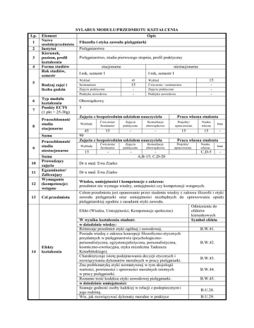 SYLABUS MODUŁU/PRZEDMIOTU KSZTAŁCENIA Lp. 1 2 3 4 5 Element Opis Nazwa modułu/przedmiotu Filozofia i etyka zawodu pielęgniarki Instytut Kierunek, poziom, profil kształcenia Forma studiów Rok studiów, semestr Pielęgniarstwa Rodzaj zajęć i liczba godzin Pielęgniarstwo, studia pierwszego stopnia, profil praktyczny stacjonarne I rok, semestr I I rok, semestr I Wykład Seminarium Zajęcia praktyczne 6 7 8 Pracochłonność studia stacjonarne Suma 9 10 11 12 Pracochłonność studia niestacjonarne Suma Prowadzący zajęcia Egzaminator/ Zaliczający Wymagania (kompetencje) wstępne 13 Cel przedmiotu 14 Efekty kształcenia Wykład Ćwiczenia / seminarium Zajęcia praktyczne 45 15 - Praktyka zawodowa Typ modułu kształcenia Punkty ECTS (1 pkt = 25-30g) niestacjonarne 15 - Praktyka zawodowa Obowiązkowy 3 Zajęcia z bezpośrednim udziałem nauczyciela Wykłady Ćwiczenia/ Seminaria/ Zajęcia praktyczne Konsultacje obowiązkowe 45 15 90 Zajęcia z bezpośrednim udziałem nauczyciela Wykłady Ćwiczenia/ Seminaria/ Zajęcia praktyczne 15 - - Konsultacje obowiązkowe A,B-15; C,D-20 Praca własna studenta Projekty/ opracowania Nauka własna Inne 15 15 - Praca własna studenta Projekty/ opracowania Nauka własna Inne C,D-5 - Dr n med. Ewa Ziarko Dr n med. Ewa Ziarko Wiedza, umiejętności i kompetencje z zakresu: przedmiot nie wymaga wiedzy, umiejętności czy kompetencji wstępnych. Celem przedmiotu jest opanowanie przez studenta wiedzy z zakresu filozofii i etyki zawodu pielęgniarki oraz umiejętności niezbędnych do sprawowania opieki pielęgniarskiej zgodnie z zasadami etyki zawodu. Odniesienie do Efekt (Wiedza, Umiejętności, Kompetencje społeczne) efektów kierunkowych W wyniku kształcenia student: Symbol efektu w dziedzinie wiedzy: Różnicuje przedmiot etyki ogólnej i zawodowej. B.W.41. Posiada wiedzę z zakresu koncepcji filozoficzno-etycznych przydatnych w pielęgniarstwie (psychologicznopersonalistyczna, egzystencjalistyczna, personalistyczna, B.W.42. kosmiczno-ewolucyjna, etyka niezależna Tadeusza Kotarbińskiego). Charakteryzuje istotę podejmowania decyzji etycznych i B.W.43. rozwiązywania dylematów moralnych w pracy pielęgniarki. Zna problematykę etyki normatywnej w tym aksjologii wartości, powinności i sprawności moralnych istotnych B.W.44. w pracy pielęgniarki. Rozumie treść kodeksu etyki zawodowej pielęgniarki. B.W.45. w dziedzinie umiejętności: Szanuje godność osoby ludzkiej w relacji z podopiecznym i B.U.28. jego rodziną. Wie, jak rozwiązywać dylematy moralne w praktyce B.U.29. zawodowej. Dba o rozwój moralny i kształtowanie sumienia. w dziedzinie kompetencji społecznych: Szanuje godność i autonomię osób powierzonych opiece. Systematycznie wzbogaca wiedzę zawodową i kształtuje umiejętności dążąc do profesjonalizmu. Efekt kształcenia osiągany przez Sposób potwierdzenia (weryfikacji) moduł/przedmiot Symbol efektu B.U.30. B.K.1 B.K.2 wiedza B.W.41. Forma i warunki potwierdzenia efektu kształcenia kompetencje społeczne umiejętności 15 16 17 18 Stosowane metody dydaktyczne Forma i warunki zaliczenia modułu, zasady dopuszczenia do egzaminu oraz zaliczenia poszczególnych zajęć Treści merytoryczne przedmiotu B.W.42. B.W.43. B.W.44. B.W.45. B.U28. B.U29. B.U30. BK1 BK2 test sprawdzian ustny - odpowiedzi na pytania esej sprawdzian ustny - odpowiedzi na pytania esej obserwacja przez nauczyciela prowadzącego samoocena studenta esej obserwacja przez nauczyciela prowadzącego samoocena studenta Wykład informacyjny, wykład konwersatoryjny, praca z podręcznikiem, dyskusja dydaktyczna, studium przypadku, samokształcenie. Egzamin pisemny, testowy po I semestrze Zasady dopuszczenia do egzaminu: uzyskanie zaliczenia z seminarium (obecność na zajęciach, aktywne uczestnictwo w zajęciach) uzyskanie zaliczenia z samokształcenia – pracy pisemnej w formie eseju refleksyjnego Tematyka wykładów: 1. Filozofia pielęgniarstwa. Relacje filozofii z zawodem pielęgniarki. 2. Najważniejsze koncepcje filozoficzne człowieka: psychologicznopersonalistyczna, egzystencjalistyczna, personalistyczna, kosmicznoewolucyjna, etyka niezależna Tadeusza Kotarbińskiego 3. Etyka jako teoria moralności – jej przedmiot i podstawowe pojęcia. 4. Etyka medycyny i zawodu pielęgniarskiego. 5. Bioetyka. 6. Rodowód etyki pielęgniarskiej - rola Florencji Nightingale. 7. Współczesne koncepcje etyczne w praktyce pielęgniarskiej. 8. Zasady etyczne obowiązujące w praktyce pielęgniarskiej. Prawa człowieka, prawa pacjenta. 9. Etyka w badaniach naukowych. 10. Dylematy etyczne współczesnej medycyny. Tematyka seminarium: 1. Etyka w praktyce pielęgniarskiej, wartości, zasady, normy i oceny moralne. 2. Analiza kodeksów etyki pielęgniarskiej: Kodeksu Etyki Zawodowej Pielęgniarki i Położnej Rzeczypospolitej Polskiej oraz Kodeksu etyki dla pielęgniarek ICN. 3. Prawa człowieka, prawa pacjenta – analiza Karty Praw Pacjenta. 4. Etyka w pielęgniarskich badaniach naukowych. 19 20 Wykaz literatury podstawowej Wykaz literatury uzupełniającej (pomocniczej) 5. Metoda refleksyjnego myślenia w praktyce pielęgniarskiej. 6. Analiza sytuacji moralnej i procesu podejmowania decyzji moralnej. 7. Dylematy etyczne w pracy pielęgniarki i ich rozwiązywanie. Zadania do samodzielnej pracy studenta - praca semestralna (esej refleksyjny): Propozycja tematów eseju: Sens życia, szczęście i cierpienie. Filozofia niesprawności, umierania i śmierci. Zagrożenia bytu współczesnego człowieka w kontekście filozoficznoetycznym. Dylematy etyczne współczesnej medycyny. Dylematy etyczne w pracy pielęgniarki. Temat dowolny z zakresu filozofii i etyki zawodu pielęgniarki, po uzgodnieniu z prowadzącym przedmiot. Wymagania eseju - objętość pracy co najmniej 6 stron (nie wliczając strony tytułowej), minimum 5 pozycji literatury przedmiotu. 1. Fray S. T., Johnstone M., J.: Etyka w praktyce pielęgniarskiej. Zasady podejmowania decyzji etycznych. Wydawnictwo Makm