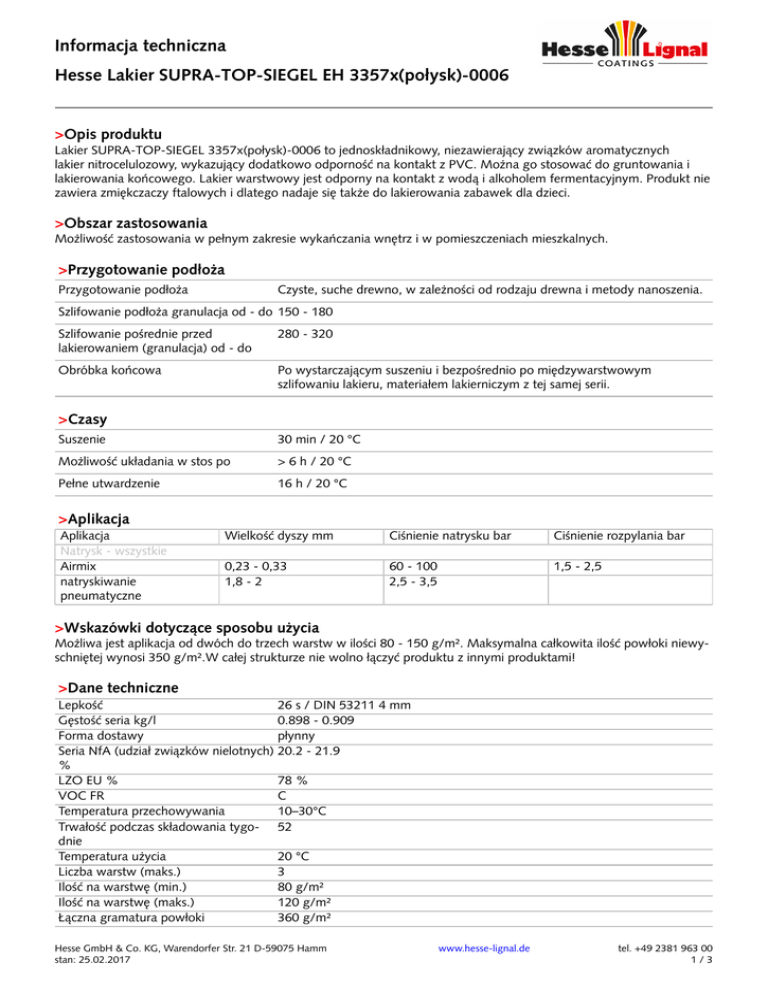 Informacja techniczna Hesse Lakier SUPRA-TOP-SIEGEL EH 3357x(połysk)-0006 >Opis produktu Lakier SUPRA-TOP-SIEGEL 3357x(połysk)-0006 to jednoskładnikowy, niezawierający związków aromatycznych lakier nitrocelulozowy, wykazujący dodatkowo odporność na kontakt z PVC. Można go stosować do gruntowania i lakierowania końcowego. Lakier warstwowy jest odporny na kontakt z wodą i alkoholem fermentacyjnym. Produkt nie zawiera zmiękczaczy ftalowych i dlatego nadaje się także do lakierowania zabawek dla dzieci. >Obszar zastosowania Możliwość zastosowania w pełnym zakresie wykańczania wnętrz i w pomieszczeniach mieszkalnych. >Przygotowanie podłoża Przygotowanie podłoża Czyste, suche drewno, w zależności od rodzaju drewna i metody nanoszenia. Szlifowanie podłoża granulacja od - do 150 - 180 Szlifowanie pośrednie przed lakierowaniem (granulacja) od - do 280 - 320 Obróbka końcowa Po wystarczającym suszeniu i bezpośrednio po międzywarstwowym szlifowaniu lakieru, materiałem lakierniczym z tej samej serii. >Czasy Suszenie 30 min / 20 °C Możliwość układania w stos po > 6 h / 20 °C Pełne utwardzenie 16 h / 20 °C >Aplikacja Aplikacja Natrysk - wszystkie Airmix natryskiwanie pneumatyczne Wielkość dyszy mm Ciśnienie natrysku bar Ciśnienie rozpylania bar 0,23 - 0,33 1,8 - 2 60 - 100 2,5 - 3,5 1,5 - 2,5 >Wskazówki dotyczące sposobu użycia Możliwa jest aplikacja od dwóch do trzech warstw w ilości 80 - 150 g/m². Maksymalna całkowita ilość powłoki niewyschniętej wynosi 350 g/m².W całej strukturze nie wolno łączyć produktu z innymi produktami! >Dane techniczne Lepkość 26 s / DIN 53211 4 mm Gęstość seria kg/l 0.898 - 0.909 Forma dostawy płynny Seria NfA (udział związków nielotnych) 20.2 - 21.9 % LZO EU % 78 % VOC FR C Temperatura przechowywania 10–30°C Trwałość podczas składowania tygo- 52 dnie Temperatura użycia 20 °C Liczba warstw (maks.) 3 Ilość na warstwę (min.) 80 g/m² Ilość na warstwę (maks.) 120 g/m² Łączna gramatura powłoki 360 g/m² Hesse GmbH & Co. KG, Warendorfer Str. 21 D-59075 Hamm stan: 25.02.2017 www.hesse-lignal.de tel. +49 2381 963 00 1/3 Informacja techniczna Hesse Lakier SUPRA-TOP-SIEGEL EH 3357x(połysk)-0006 >Wskazówki dotyczące zamawiania Numer zamówienia EH 33570-0006 EH 33571-0006 EH 33573-0006 EH 33574-0006 EH 33576-0006 EH 33577-0006 EH 33578-0006 Połysk 60° (Gloss +/-5) 5 12 18 30 50 64 Stopień połysku tępy mat tępy mat matowy jedwabisty mat jedwabisty połysk jedwabisty połysk błyszczący Wielkość pojemnika 5 LTR, 25 LTR 25 LTR 25 LTR 1 LTR, 5 LTR, 25 LTR 25 LTR 5 LTR, 25 LTR >Rozcieńczalnik Numer zamówienia NV 3924 Wielkość pojemnika 1 LTR, 5 LTR, 10 LTR, 25 LTR Nazwa artykułu Rozcieńczalnik nitro Wielkość pojemnika 1 LTR, 5 LTR, 10 LTR, 25 LTR 1 LTR, 5 LTR, 10 LTR, 25 LTR Nazwa artykułu PUR Spowalniacz Spowalniacz >Opóźniacz Numer zamówienia DV 4909 ZD 3936 >Środek do czyszczenia urządzenia Numer zamówienia RV 1 Wielkość pojemnika 5 LTR, 10 LTR, 25 LTR Nazwa artykułu Rozcieńczalnik czyszczący >Środki czyszczące i pielęgnacyjne Numer zamówienia GR 1900 Nazwa artykułu Rozcieńczalnik do oczyszczania Wielkość pojemnika 1 LTR, 25 LTR >Wskazówki specjalne Odporność w kontakcie z PVC uzyskuje się po 2 - 3 tygodniach. Po suszeniu i szlifowaniu międzywarstwowym prosimy lakierować tylko materiałem tej samej serii. >Przykład procedury Metoda powlekania i dokładne parametry obróbki są zawsze dostosowywane do warunków aplikacji i suszenia i można je znaleźć w odpowiednich dla danego klienta instrukcjach techniki obróbki powierzchni (TDO). >Wskazówki ogólne W razie potrzeby lakierowanie próbne należy przeprowadzić w warunkach odpowiadającym rzeczywistym! Hesse GmbH & Co. KG, Warendorfer Str. 21 D-59075 Hamm stan: 25.02.2017 www.hesse-lignal.de tel. +49 2381 963 00 2/3 Informacja techniczna Hesse Lakier SUPRA-TOP-SIEGEL EH 3357x(połysk)-0006 >Szczególne właściwości i normy kontrolne Norma / podstawa Bezpieczeństwo zabawek DIN EN 71-3 (2002-11) Placówka kontro- Znak lna HESSE Odporny w kontakcie z PVC HESSE Nie zawiera substancji z obowiązkiem autoryzacji według załącznika XIV do rozporządzenia UE 1907/2006 (REACH). HESSE DIN 68861-część 1C (powierzchnie mebli; właściwości przy obciążeniu chemicznym) HESSE Sprawozdanie Nr odporność na działanie śliny i potu według nor- HESSE my DIN 53160 część 1 i 2: brak odbarwień (poziom 5) Nasze informacje techniczne są na bieżąco aktualizowane pod kątem stanu wiedzy technicznej i przepisów prawa. Podane wartości nie oznaczają specyfikacji, są to typowe dane produktów. Zawsze aktualną wersję można zobaczyć w Internecie na stronie www.hesse-lignal.de lub uzyskać od Państwa opiekuna klienta. Dane te mają charakter doradczy, opierają się na dobrej wierze i starannych badaniach zgodnie z aktualnym stanem techniki. Informacje te nie mają charakteru prawnie wiążącego. Oprócz tego odsyłamy Państwa do naszych warunków handlowych. Karta charakterystyki jest udostępniona zgodnie z rozporządzeniem (WE) nr 1907/2006. Hesse GmbH & Co. KG, Warendorfer Str. 21 D-59075 Hamm stan: 25.02.2017 www.hesse-lignal.de tel. +49 2381 963 00 3/3