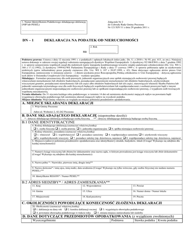 1. Numer Identyfikatora Podatkowego składającego deklarację (NIP lub PESEL) Załącznik Nr 2 do Uchwały Rady Gminy Poczesna Nr 121/XIV/11 z dnia 29 grudnia 2011 r. ................................................................................................... DN – 1 DEKLARACJA NA PODATEK OD NIERUCHOMOŚCI 2. Rok na ........................................ Podstawa prawna: Ustawa z dnia 12 stycznia 1991 r. o podatkach i opłatach lokalnych (tekst jedn.: Dz. U. z 2010 r. Nr 95, poz. 613, ze zm.). Niniejsza ustawa dokonuje w zakresie swojej regulacji wdrożenia następujących dyrektyw Wspólnot Europejskich: 1) dyrektywy 92/106/EWG z dnia 7 grudnia 1992 r. w sprawie ustanowienia wspólnych zasad dla niektórych typów transportu kombinowanego towarów między państwami członkowskimi (Dz. Urz. WE L 368 z 17.12.1992), 2) dyrektywy 1999/62/WE Parlamentu Europejskiego i Rady z dnia 17 czerwca 1999 r. w sprawie pobierania opłat za użytkowanie niektórych typów infrastruktury przez pojazdy ciężarowe (Dz. Urz. WE L 187 z 20.07.1999, s. 42). Dane dotyczące ogłoszenia aktów prawa Unii Europejskiej, zamieszczone w niniejszej ustawie – z dniem uzyskania przez Rzeczpospolitą Polską członkostwa w Unii Europejskiej – dotyczą ogłoszenia tych aktów w Dzienniku Urzędowym Unii Europejskiej – wydanie specjalne. Składający: Formularz przeznaczony dla osób prawnych, jednostek organizacyjnych oraz spółek niemających osobowości prawnej będących właścicielami nieruchomości lub obiektów budowlanych, posiadaczami samoistnymi nieruchomości lub obiektów budowlanych, użytkownikami wieczystymi gruntów, posiadaczami nieruchomości lub ich części albo obiektów budowlanych lub ich części, stanowiących własność Skarbu Państwa lub jednostki samorządu terytorialnego oraz dla osób fizycznych będących współwłaścicielami lub współposiadaczami z osobami prawnymi bądź z innymi jednostkami organizacyjnymi nieposiadającymi osobowości prawnej lub ze spółkami nieposiadającymi osobowości prawnej, z wyjątkiem osób tworzących wspólnotę mieszkaniową. Termin składania: Do 31 stycznia każdego roku podatkowego; w terminie 14 dni od zaistnienia okoliczności mających wpływ na powstanie bądź wygaśnięcie obowiązku podatkowego lub zaistnienia zdarzeń mających wpływ na wysokość podatku. Miejsce składania: Wójt Gminy właściwy ze względu na miejsce położenia przedmiotów opodatkowania. A. MIEJSCE SKŁADANIA DEKLARACJI 3. Wójt Gminy Poczesna Adres ul. Wolności 2, 42-262 Poczesna B. DANE SKŁADAJĄCEGO DEKLARACJĘ (niepotrzebne skreślić) * - dotyczy składającego deklarację niebędącego osobą fizyczną ** - dotyczy składającego deklarację będącego osobą fizyczną B.1 DANE IDENTYFIKACYJNE 4. Rodzaj składającego deklarację (zaznaczyć właściwą kratkę) 1. osoba fizyczna 2. osoba prawna 3. jednostka organizacyjna 4. spółka niemająca osobowości prawnej 5. Rodzaj własności, posiadania (zaznaczyć właściwą kratkę) 1. właściciel 2. współwłaściciel 3. posiadacz samoistny 4. współposiadacz samoistny 5. użytkownik wieczysty 6. współużytkownik wieczysty 7. posiadacz zależny (np. dzierżawca, najemca) 8. współposiadacz zależny (np. dzierżawca, najemca) 6. Miejsce/a (adres/y) położenia przedmiotów opodatkowania oraz identyfikator/y działek, budynków, lokali (Uwaga! Wykazuje się odrębnie dla każdej nieruchomości) 7. Numer/y księgi wieczystej lub zbioru/ów dokumentów oraz nazwa sądu, w którym prowadzona jest księga wieczysta lub zbiór dokumentów (Uwaga! Wykazuje się odrębnie dla każdej nieruchomości) 8. Nazwa pełna * / Nazwisko, pierwsze imię, drugie imię** 9. Nazwa skrócona* / imię ojca, imię matki, data urodzenia (Uwaga! Wykazuje się tylko wówczas, gdy osobie fizycznej nie nadano numeru PESEL) ** 10. Identyfikator REGON* / Numer PESEL** B.2 ADRES SIEDZIBY* / ADRES ZAMIESZKANIA** 11. Kraj 12. Województwo 13. Powiat 14. Gmina 15. Ulica 16. Numer domu / Numer lokalu 17. Miejscowość 18. Kod pocztowy 19. Poczta C. OKOLICZNOŚCI POWODUJĄCE KONIECZNOŚĆ ZŁOŻENIA DEKLARACJI 20. Okoliczności (zaznaczyć właściwą kratkę) 1. deklaracja na dany rok 2. korekta deklaracji rocznej 3. wygaśnięcie obowiązku podatkowego 4. powstanie obowiązku podatkowego w trakcie roku 5. zmiana miejsca zamieszkania lub siedziby D. DANE DOTYCZĄCE PRZEDMIOTÓW OPODATKOWANIA (z wyjątkiem zwolnionych) Wyszczególnienie Podstawa Stawka podatku Kwota podatku opodatkowania wynikająca z Uchwały Rady Gminy Poczesna w zł, gr w zł, gr (należy zaokrąglić do pełnych dziesiątek groszy) D.1 POWIERZCHNIA GRUNTÓW (Uwaga! Wykazujemy z dokładnością do 1 mkw.) 1. związanych z prowadzeniem działalności gospodarczej, bez względu na sposób zakwalifikowania w ewidencji gruntów i budynków 1a. związanych z prowadzeniem działalności gospodarczej, znacząco oddziaływującej na środowisko w rozumieniu przepisów o ochronie środowiska 2. pod jeziorami, zajętych na zbiorniki wodne retencyjne lub elektrowni wodnych 21. 22. 23. ................... m2 21a. .................,....... 22a. .................,....... 23a. …………… m2 24. ……………… 25. ………………… 26. .................... ha 3. pozostałych do 1000 m2,w tym zajęte na prowadzenie 27. odpłatnej statutowej działalności pożytku publicznego przez organizacje pożytku publicznego ................... m2 .................,....... 28. .................,....... 29. .................,....... .................,....... 3a. pozostałych, od nadwyżki powyżej 1000 m2 wzwyż, w tym zajęte na prowadzenie odpłatnej statutowej działalności pożytku publicznego przez organizacje pożytku publicznego 3b. pozostałych grunty związane z instalacjami znacząco oddziaływującymi na środowisko w rozumieniu przepisów o ochronie środowiska 27a. 28a. 29a. ................... m2 .................,....... .................,....... 27b. 